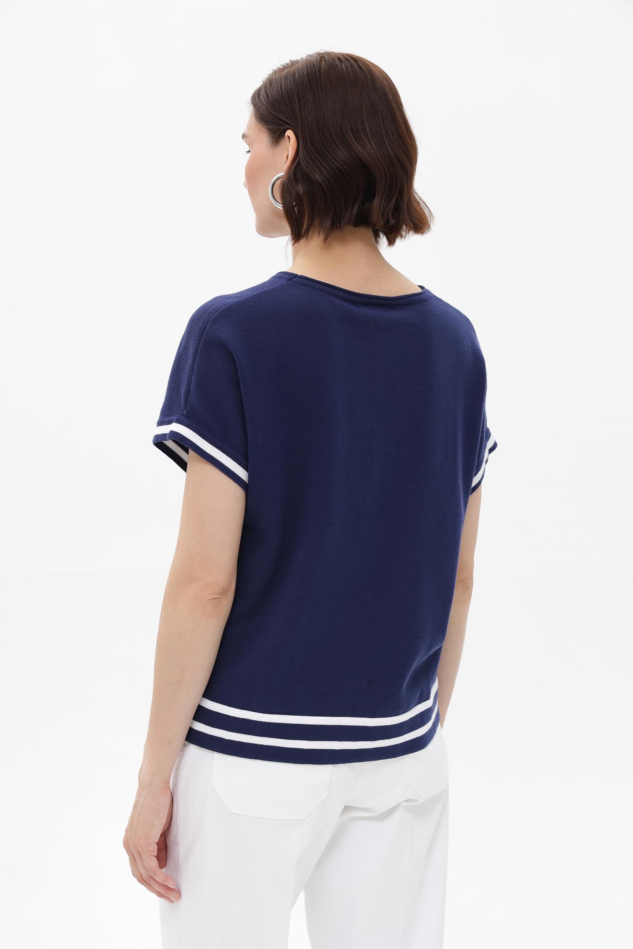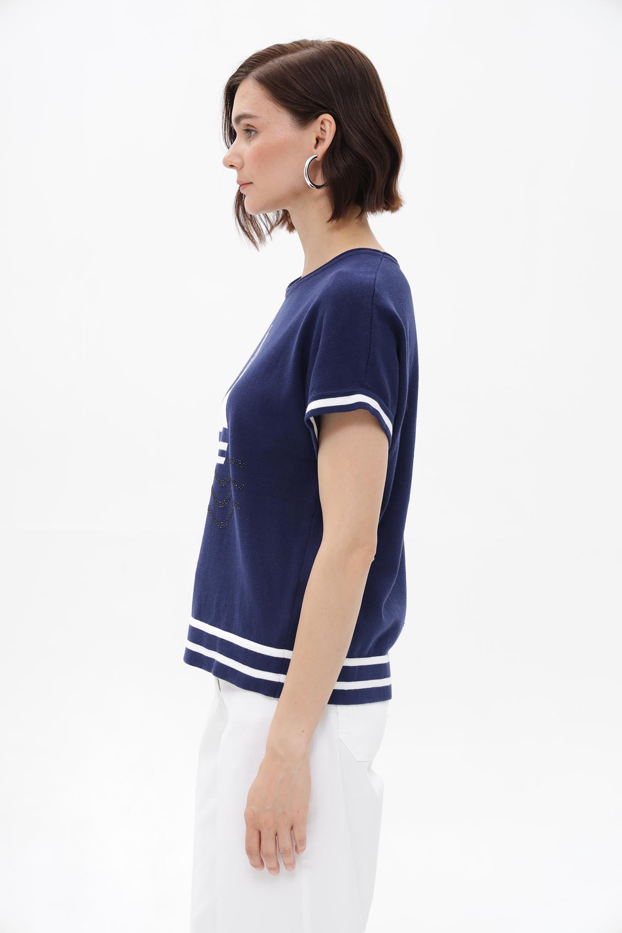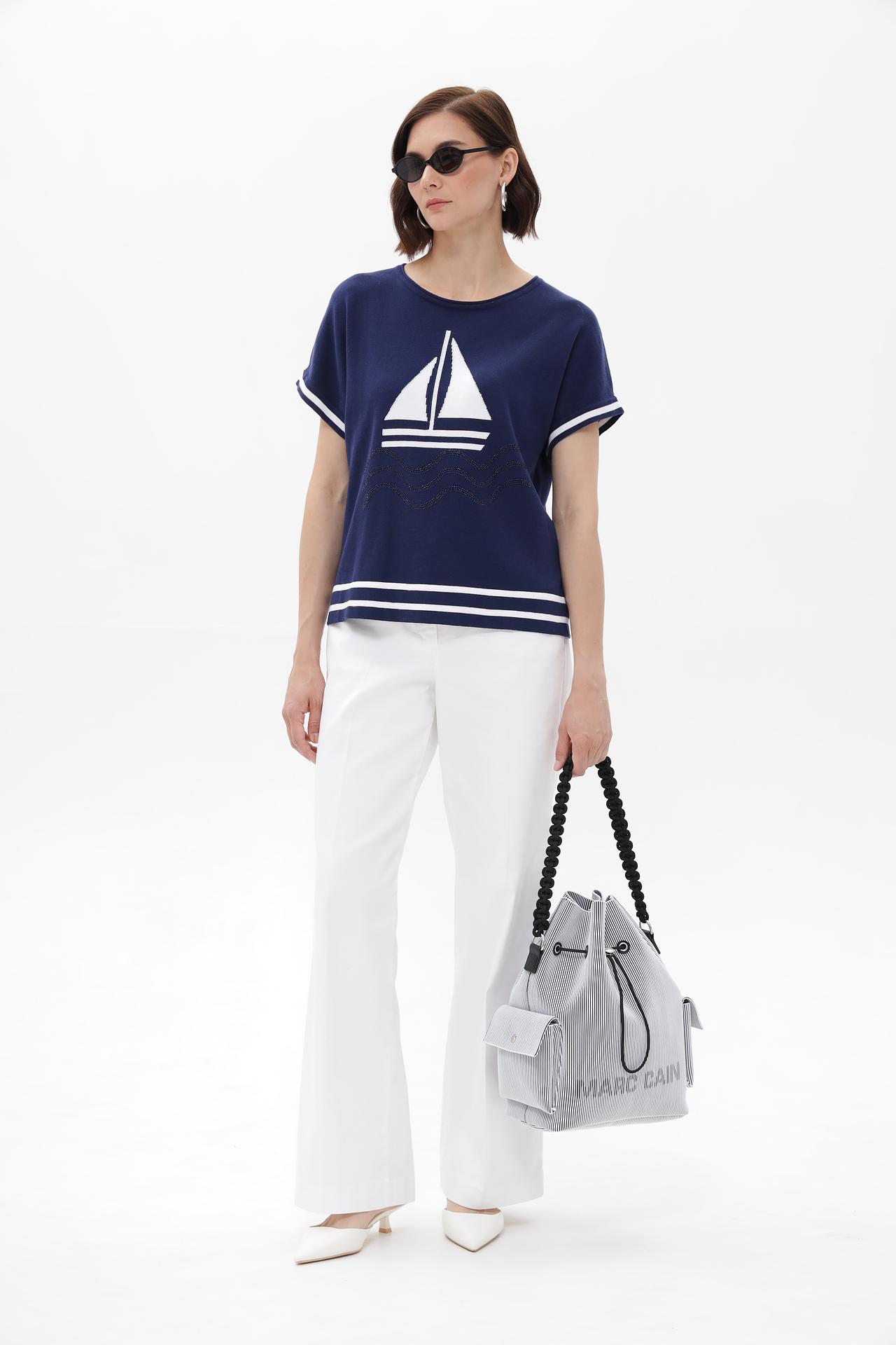 Пуловер украшен оригинальным рисунком парусника, который придает ему морской шарм и легкость. Контрастные полосы на рукавах и по низу изделия добавляют динамичности и завершают образ.