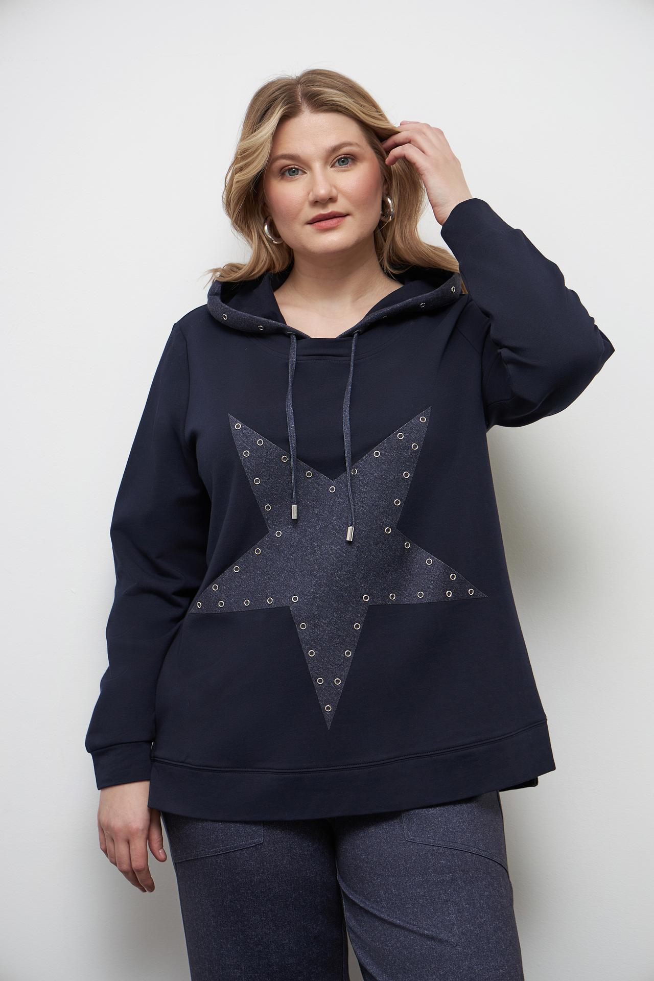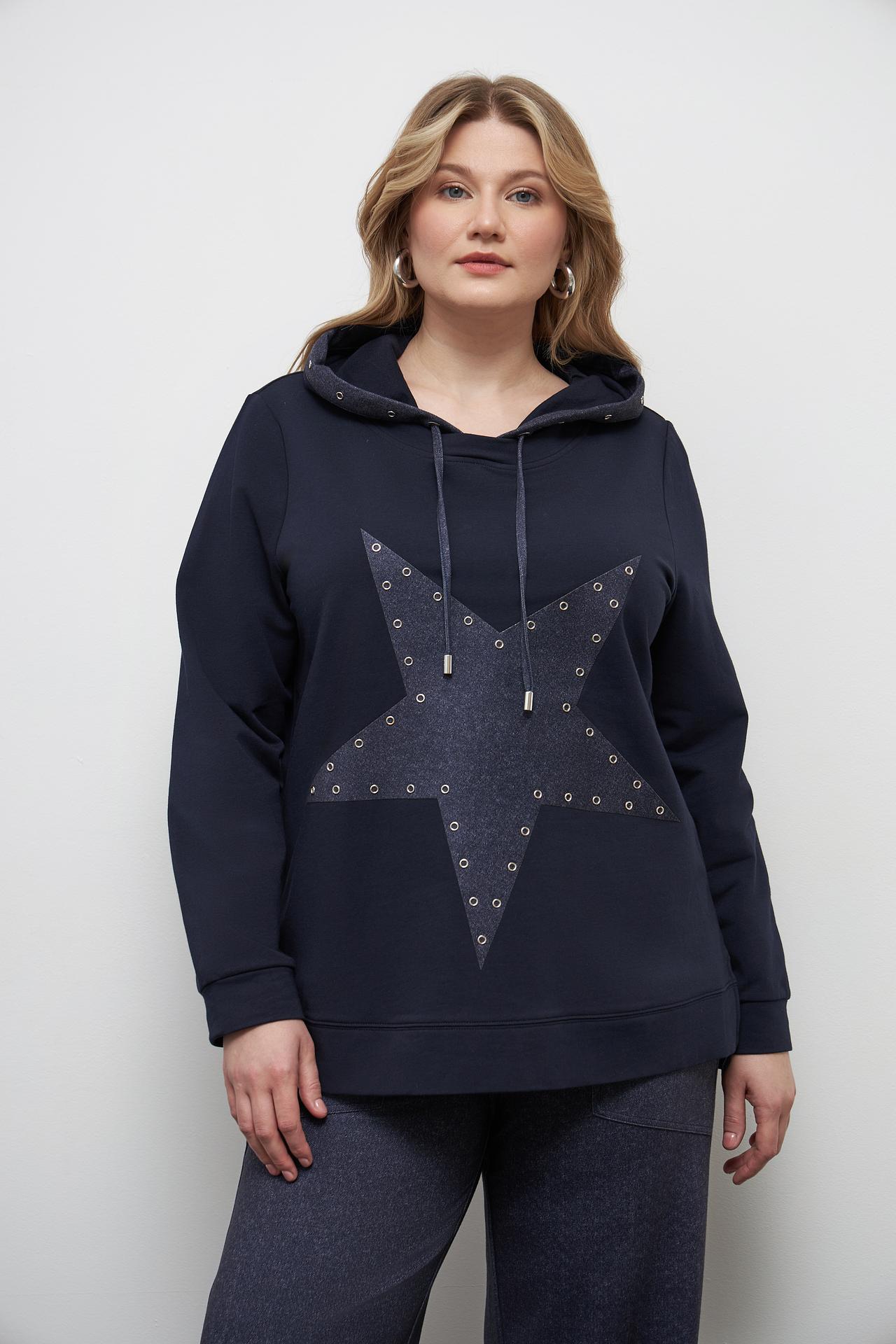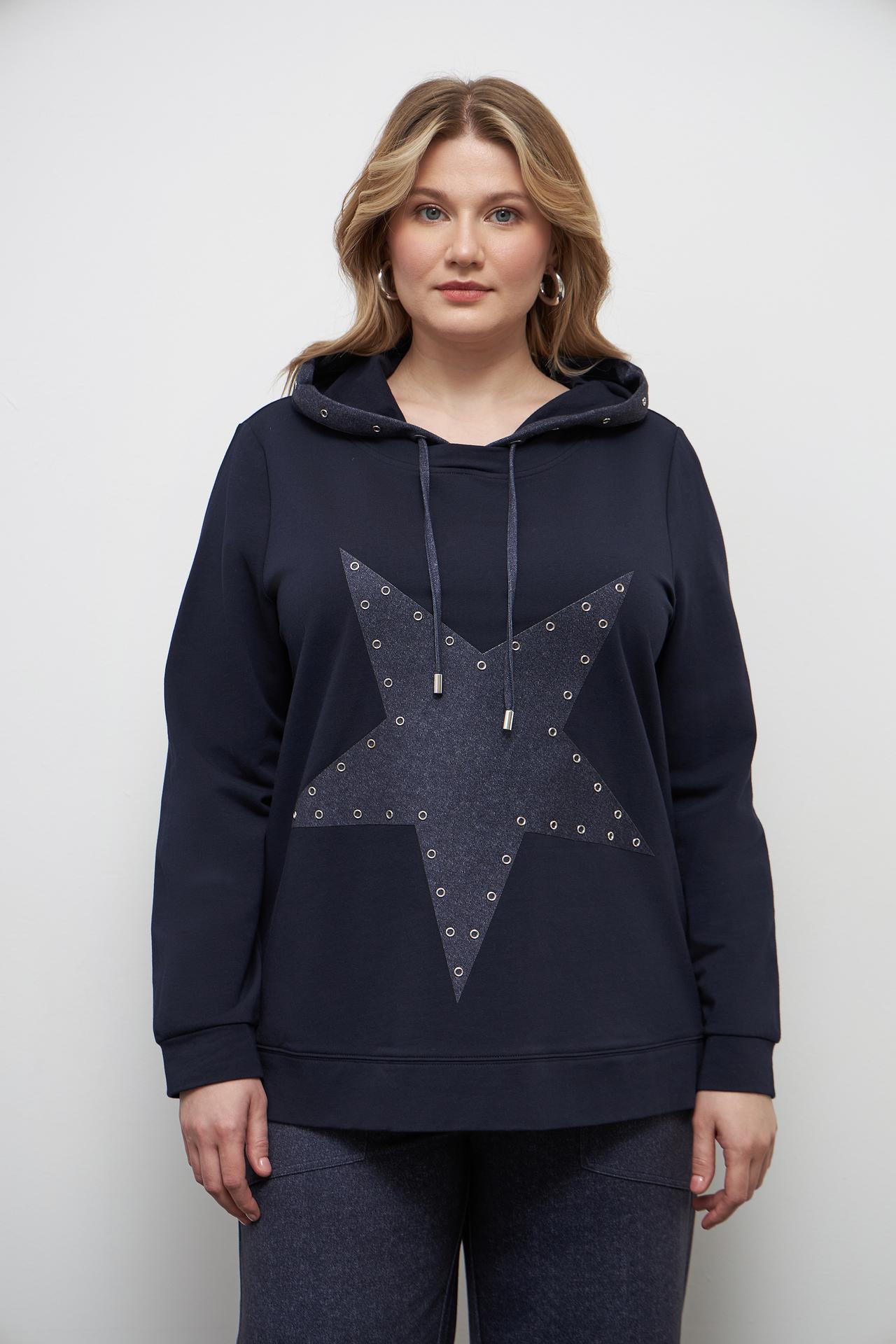 Стильный и комфортный женский пуловер с капюшоном от Via Appia. Этот мягкий пуловер, изготовленный из хлопка с добавлением эластана, идеально подойдет для создания уютного и модного образа. Отличительной особенностью модели является оригинальный декор в виде звезды, выполненной из материала, имитирующего джинсу и украшенной люверсами. Пуловер отлично подойдет для повседневной носки, прогулок или встреч с друзьями.