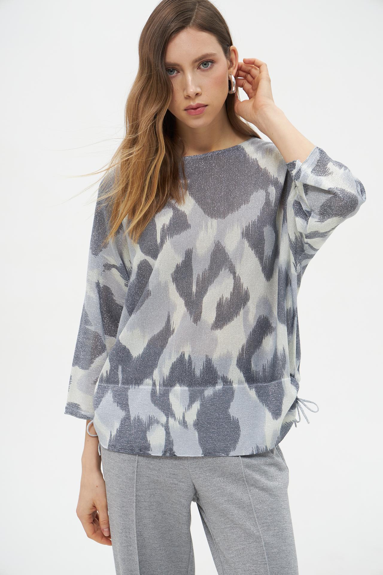 - Дизайн: Современный принт с абстрактными элементами в серой гамме, переливающийся благодаря метализированной нити. Модель имеет свободный крой и кулиску по низу изделия для регулировки объема.
