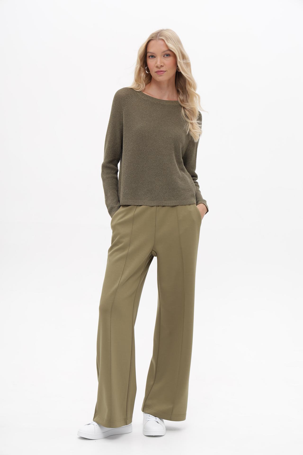 Модель выполнена в универсальном зеленом цвете и дополнена деликатной метализированной нитью, которая придает изделию subtle блеск и изысканность. Классический крой с круглым вырезом и рукавами реглан обеспечивает идеальную посадку по фигуре, а фактурная вязка рубчик добавляет текстуры и глубины.