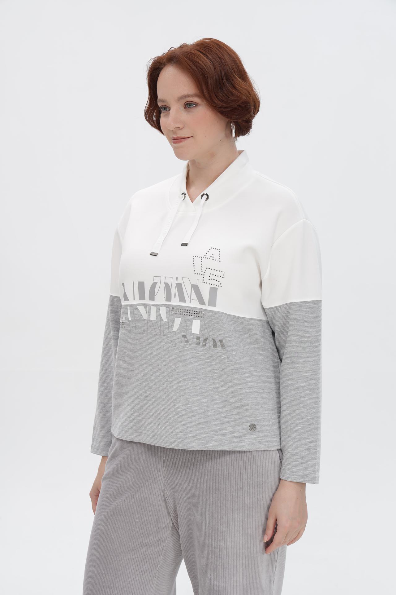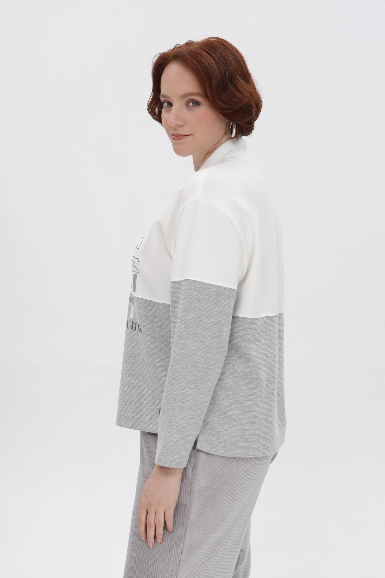 Стильный и удобный пуловер от Lebek, выполненный в современном дизайне. Двухцветная модель с контрастной верхней частью белого цвета и нижней частью серого цвета, декорированная оригинальным принтом. Отлично подойдет для создания повседневных образов.
