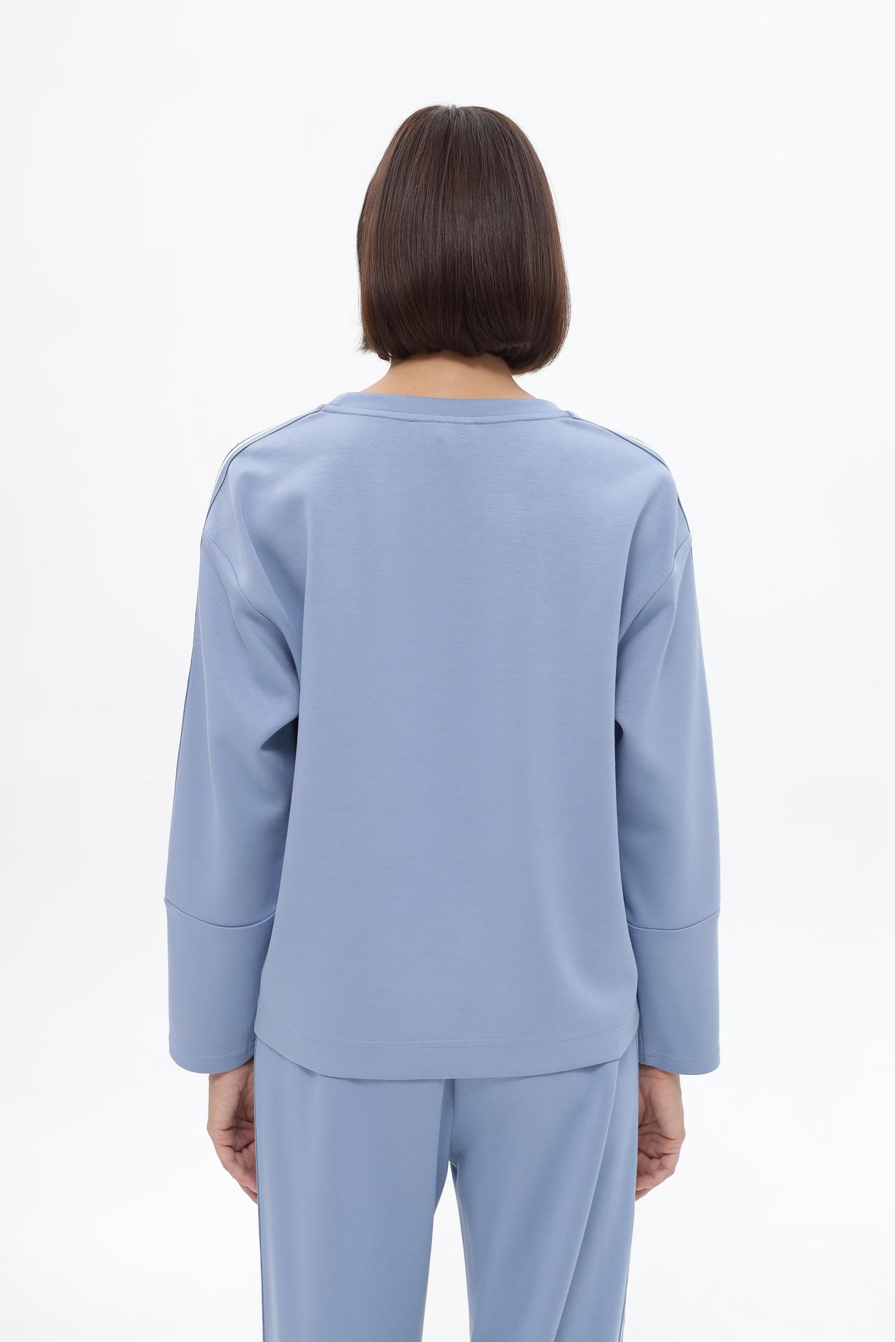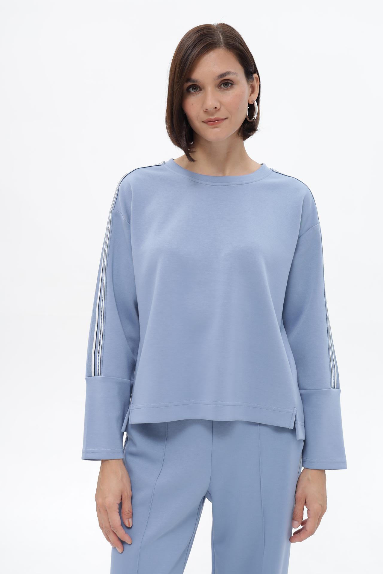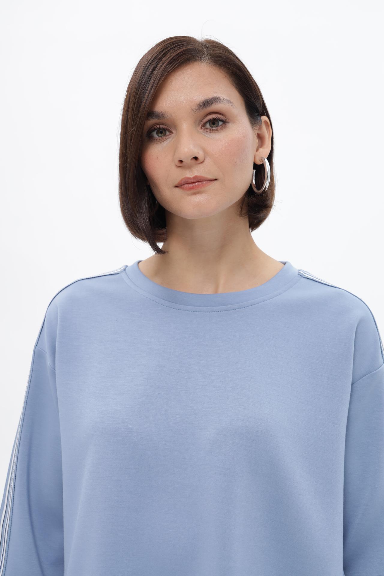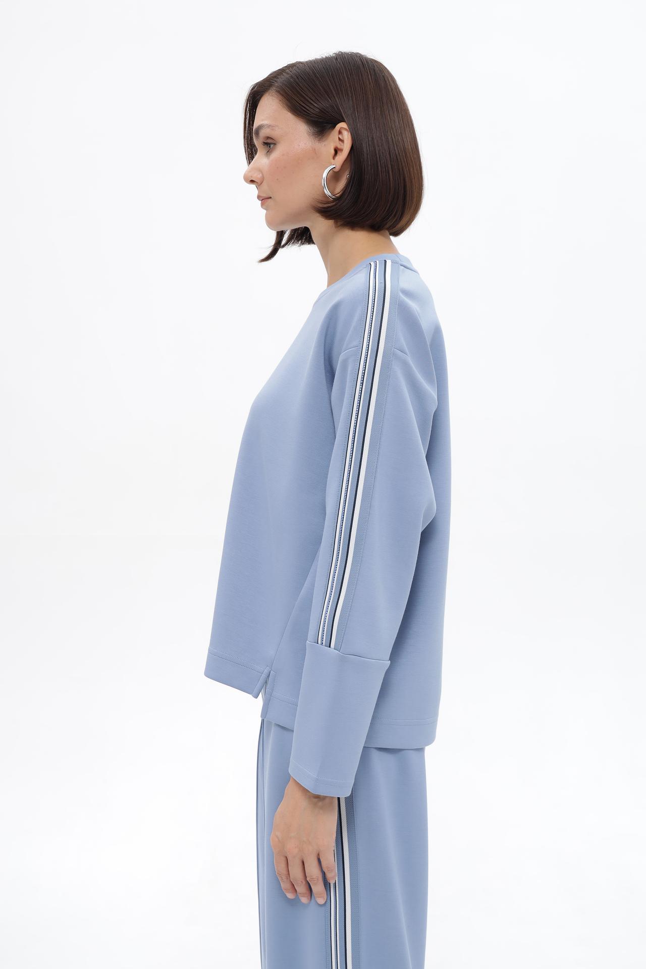 - Дизайн: Классический прямой силуэт дополнен эффектными вертикальными лампасами на рукавах. Лампасы состоят из нескольких полос контрастных цветов, что придает пуловеру спортивный шик и выразительность. Круглый вырез горловины и длинные рукава обеспечивают универсальность модели.