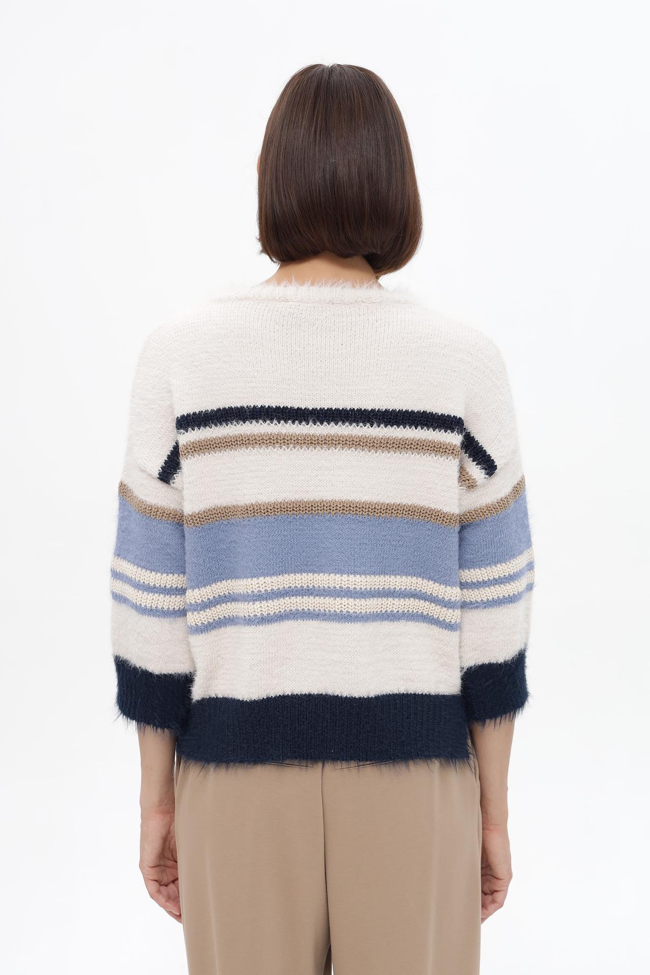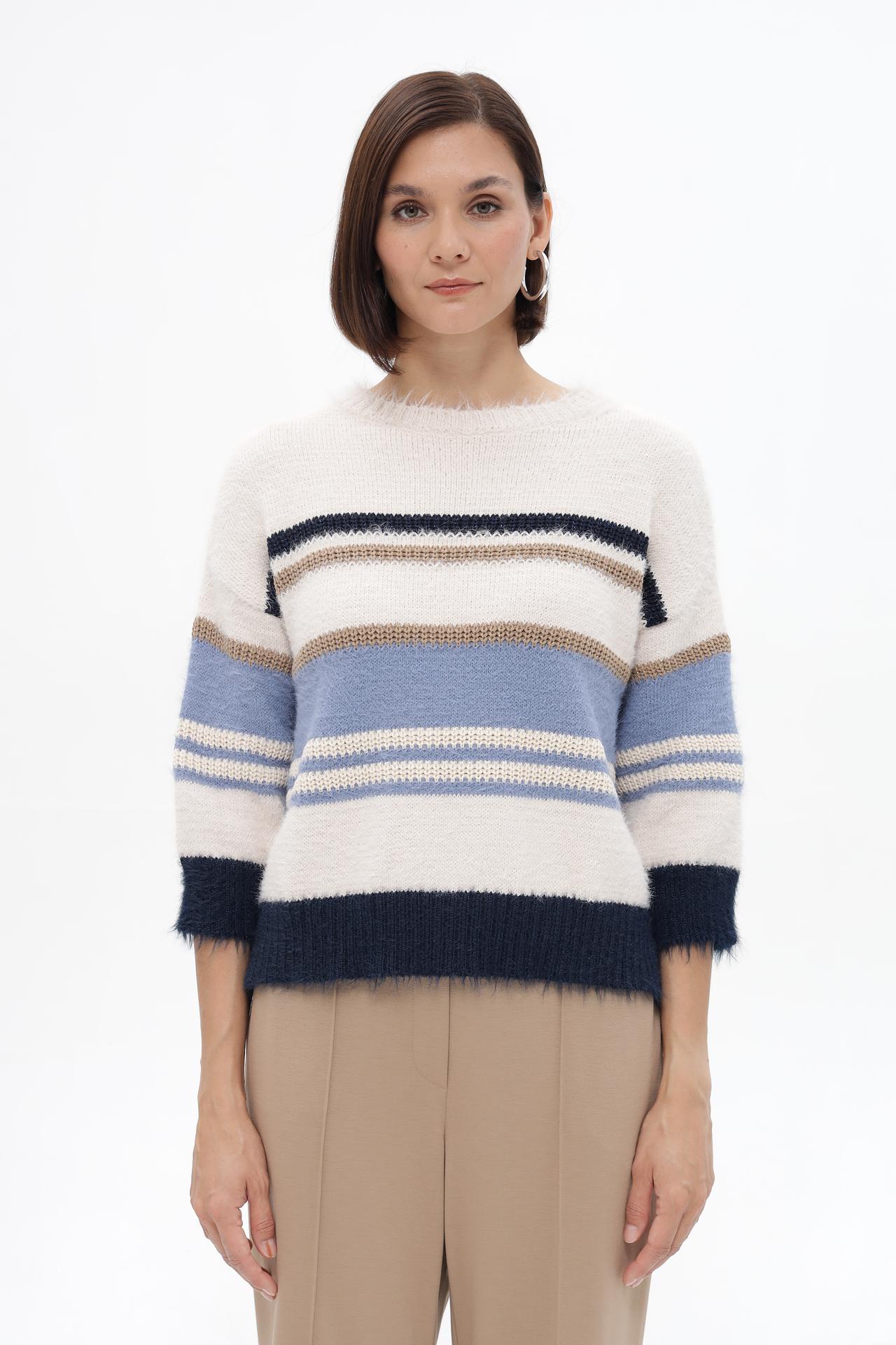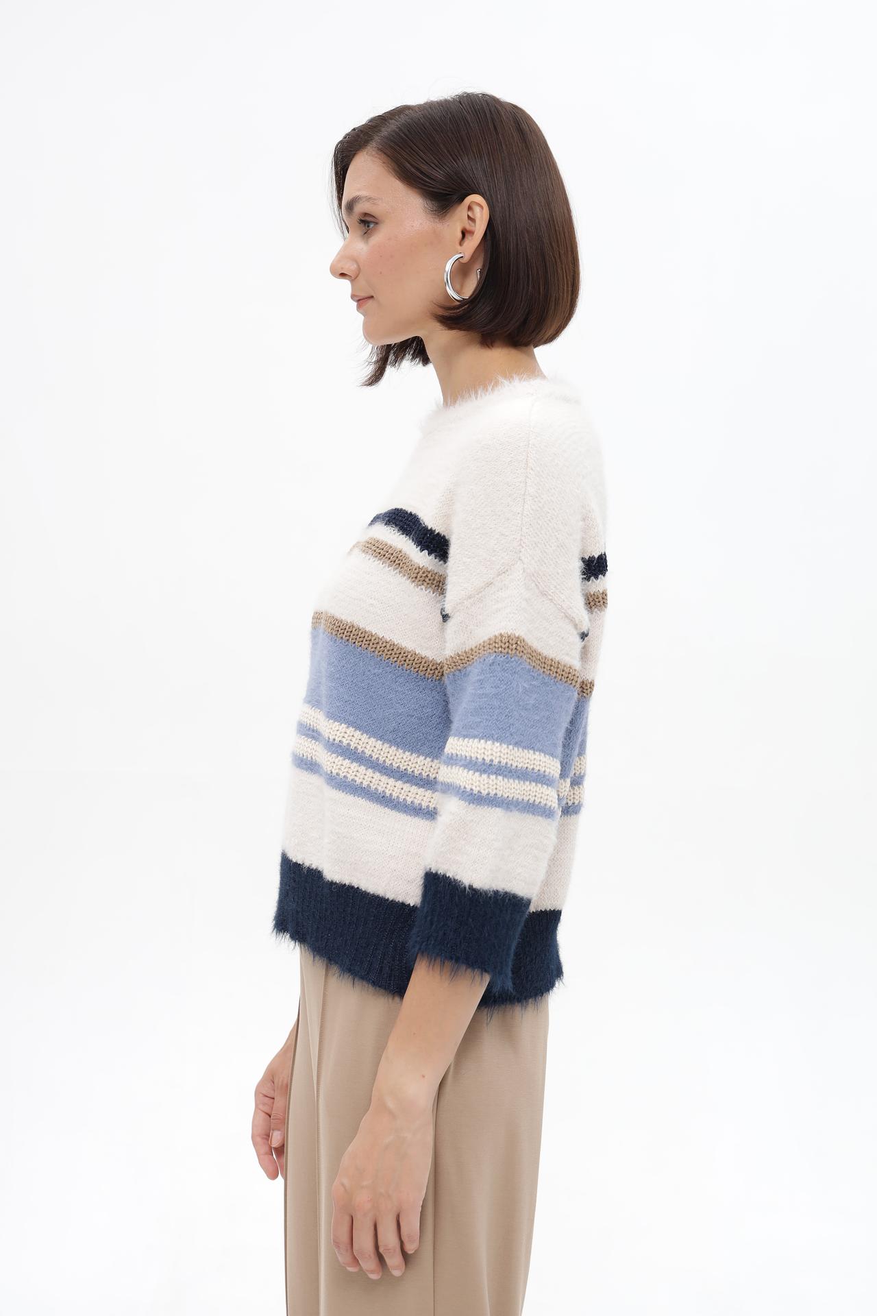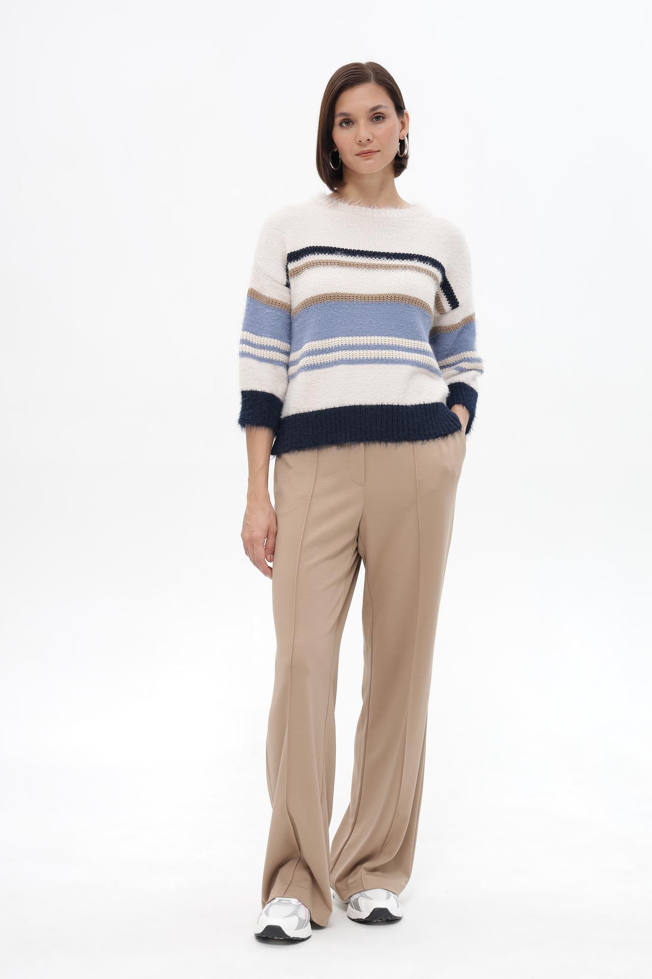 - Дизайн в полоску: Классический принт в полоску придает пуловеру универсальность, позволяя легко сочетать его с различными элементами одежды. Цветовая гамма включает кремовый, синий, голубой и коричневый оттенки.