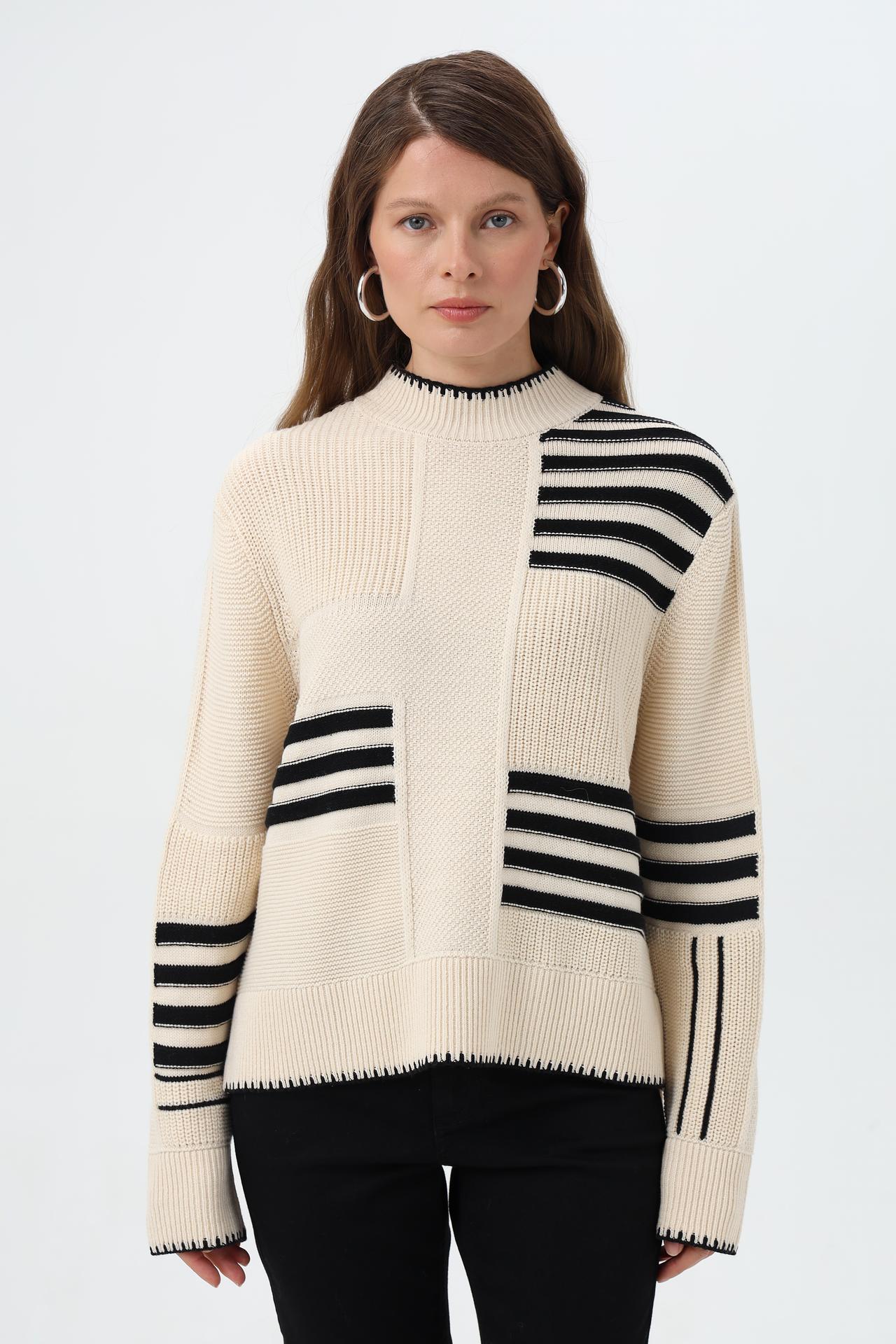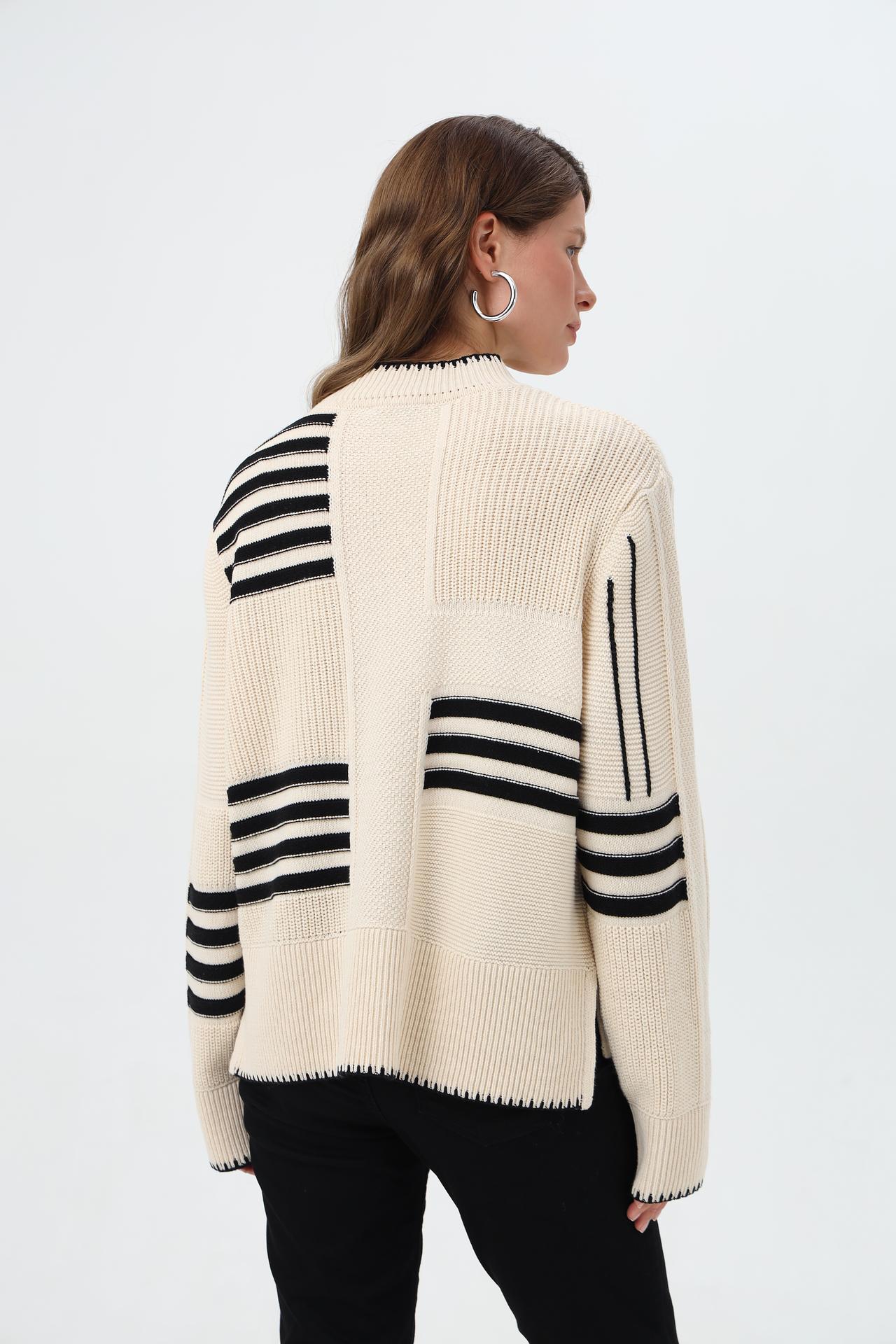 - Дизайн: Асимметричный крой и пэчворк-эффект в сочетании с горизонтальными полосами создают динамичный и модный вид. Высокий воротник-стойка и манжеты с контрастной отделкой добавляют элегантности.