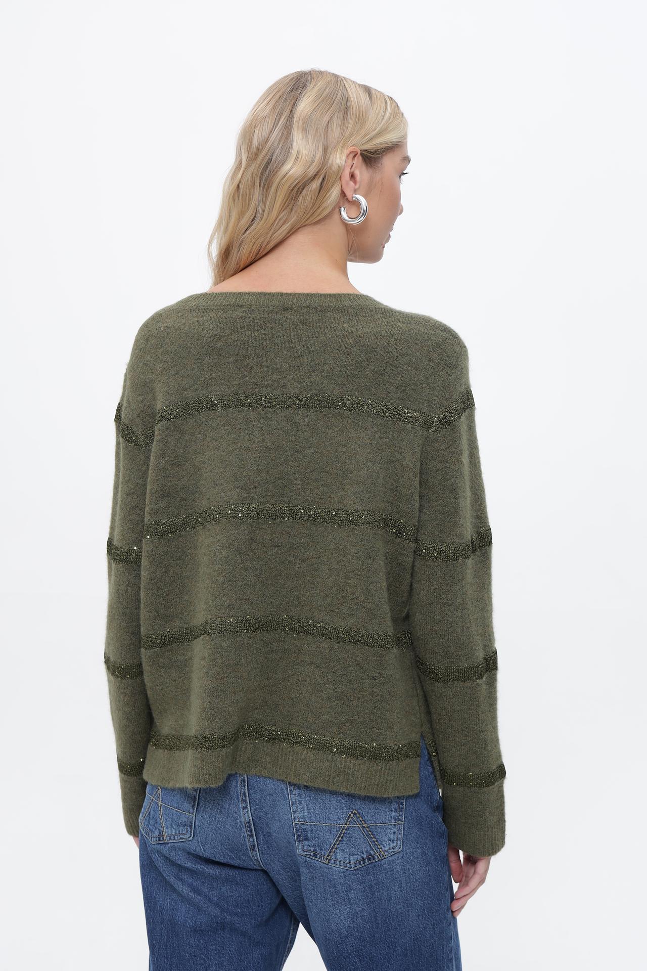 Элегантный пуловер от Lecomte – идеальный выбор для создания стильных и уютных образов. Модель выполнена в универсальном хаки оттенке, который легко сочетается с другими цветами вашего гардероба. Оригинальные горизонтальные полосы с деликатным блеском придают изделию особое очарование и делают его заметным акцентом в любом наряде. Этот пуловер станет вашим фаворитом для повседневных выходов и особых случаев, обеспечивая комфорт и безупречный внешний вид.