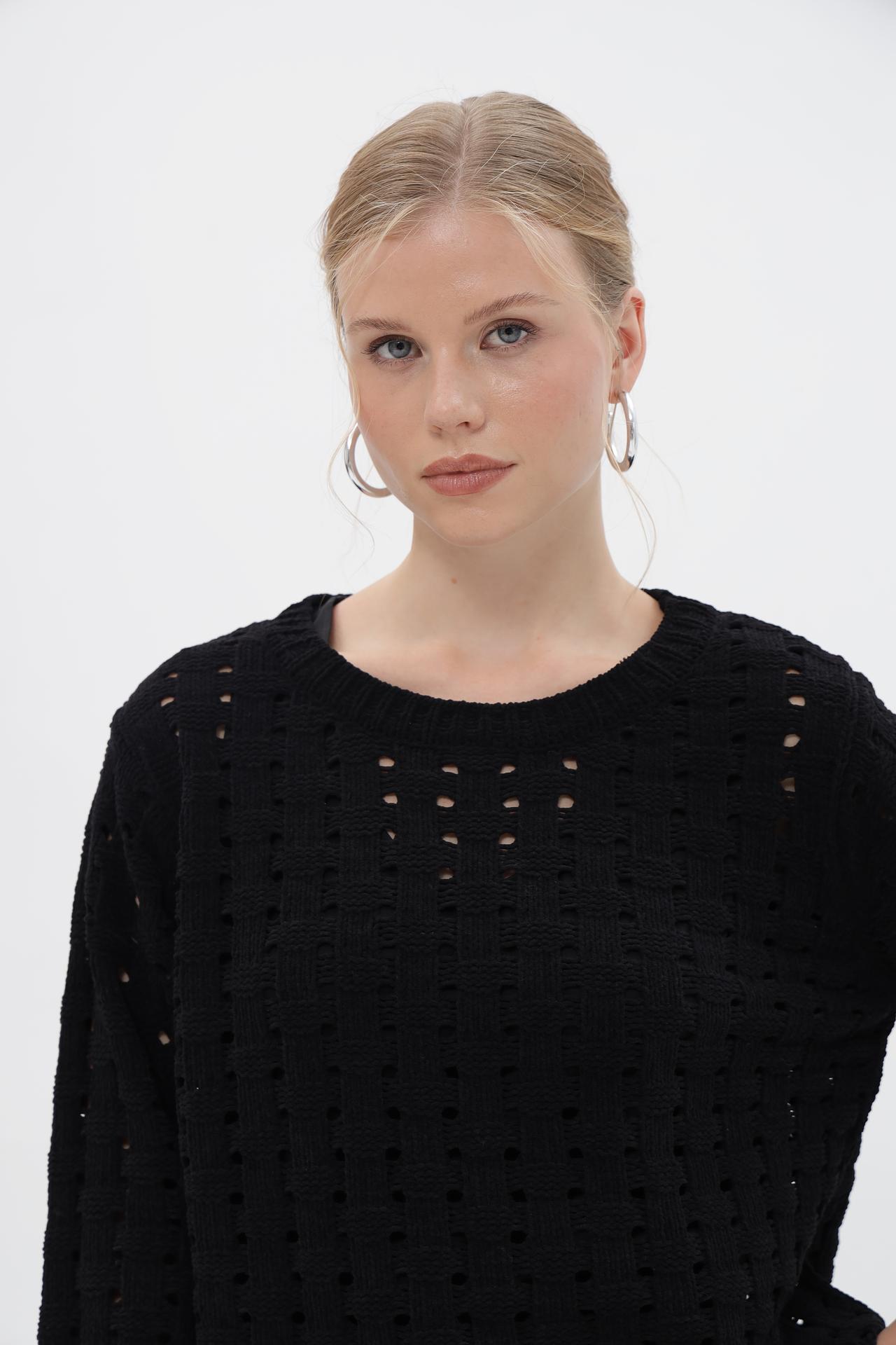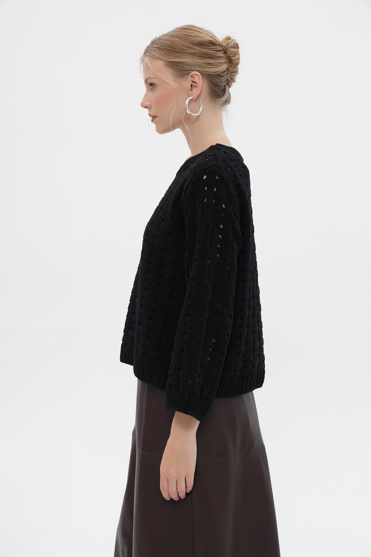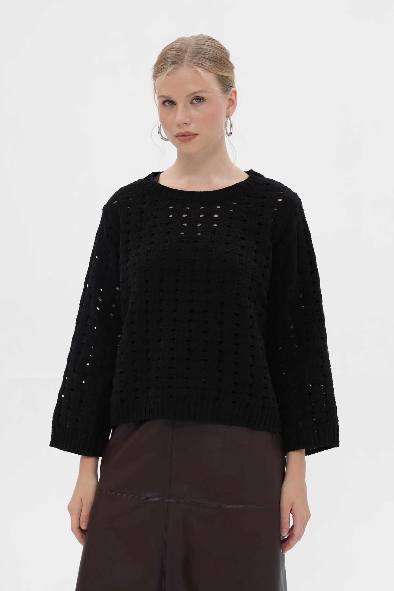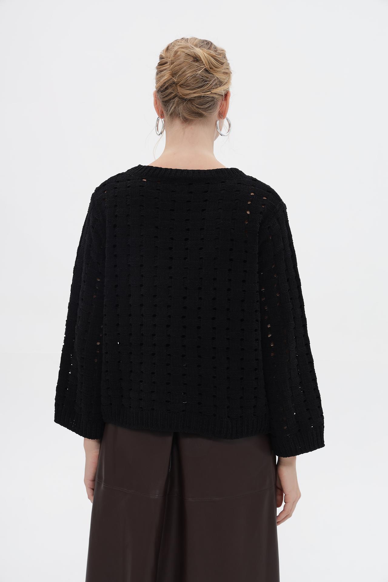 - Дизайн: Ажурный узор создает модный и женственный образ, добавляя текстуры и интереса. Круглый вырез горловины и длинные рукава обеспечивают комфорт.