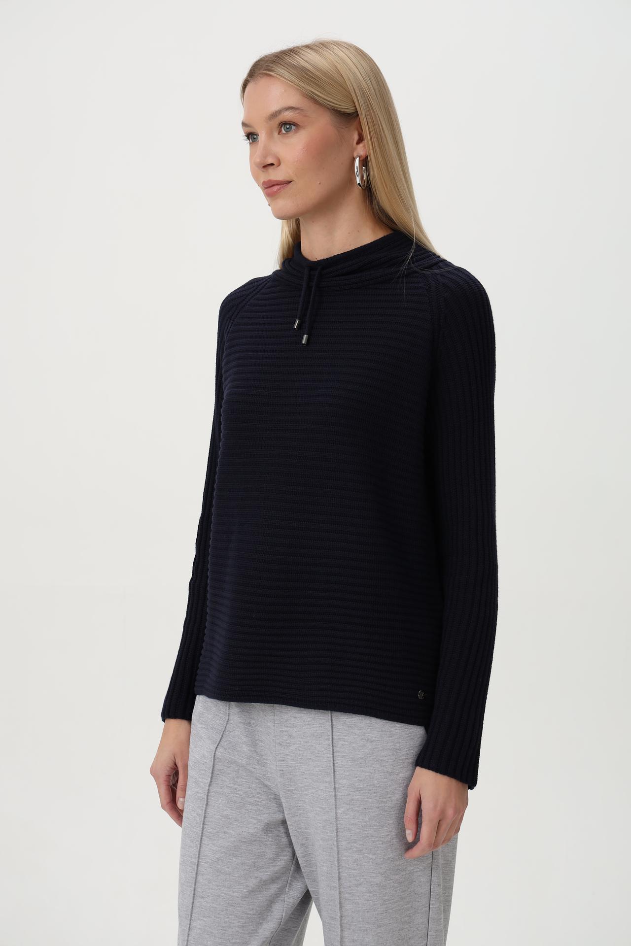 - Дизайн: Пуловер имеет современный крой с акцентом на детали. Высокий воротник-стойка с регулируемым шнурком добавляет изюминку и позволяет экспериментировать с образами.