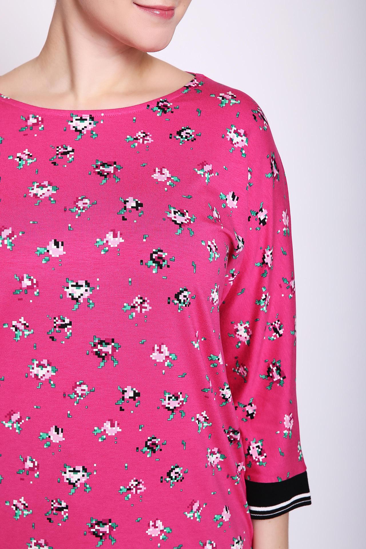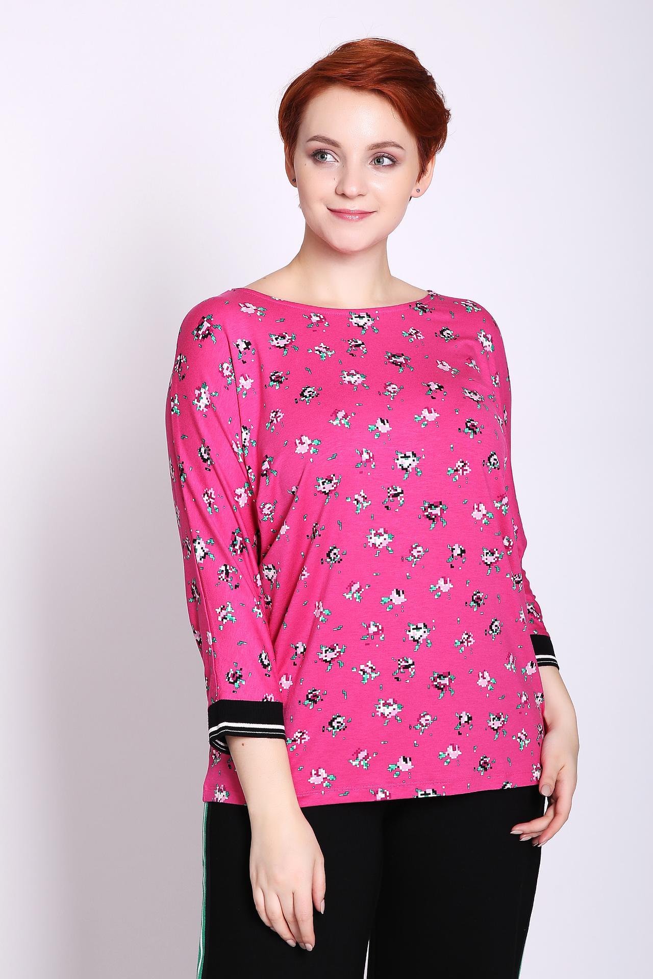 Пуловер женская розового цвета фирмы Gerry Weber. Модель выполнена прямым фасоном. Изделие дополнено округлым воротом, рукавами реглан 3/4 длинны. Рукава заканчивает манжета из эластичной тесьмы черного цвета. Ткань имеет принт. Состав ткани: 5% эластана, 95% вискоза. Гармонировать можно с различными брюками.