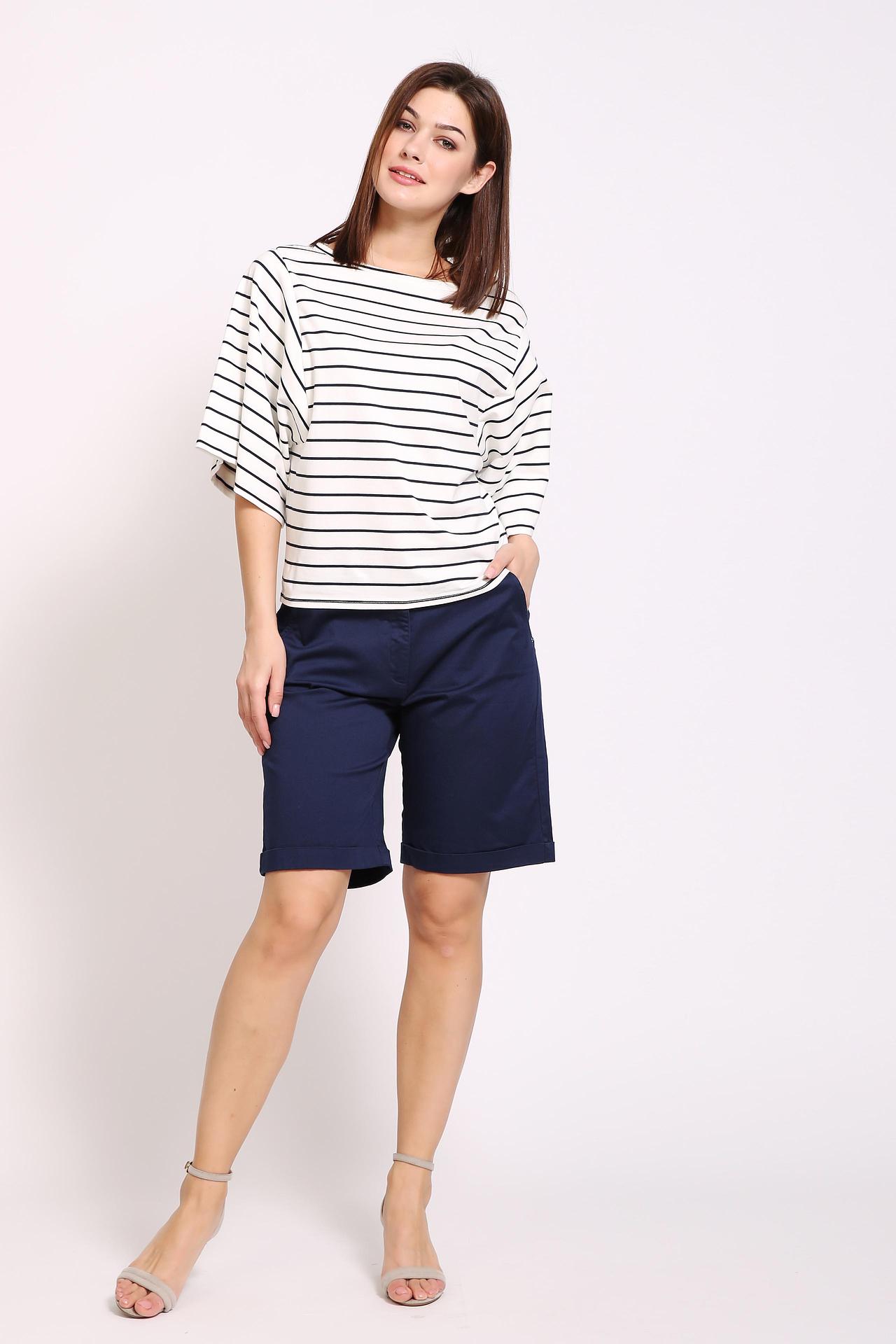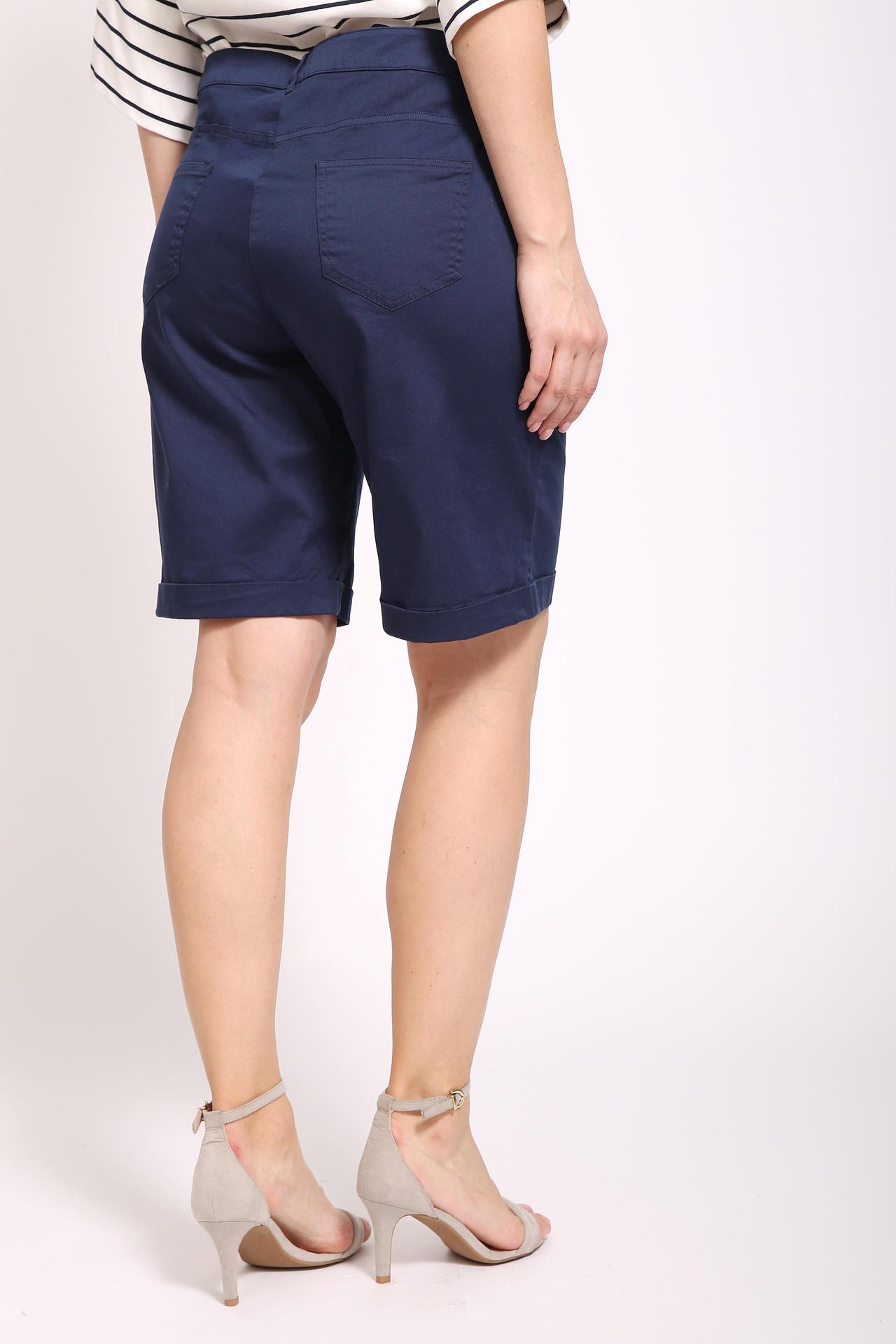 Шорты женские синего цвета бренда Pezzo. Модель выполнена прямым фасоном. Изделие дополнено притачным поясом со шлевками для ремня, застежка молния на пуговицы, боковыми карманами, задними кокетками и накладными карманами. Длина шорт до колена. Состав ткани: 35 эластан, 97% хлопок. Комбинировать можно с различными футболками, блузами, пуловерами.