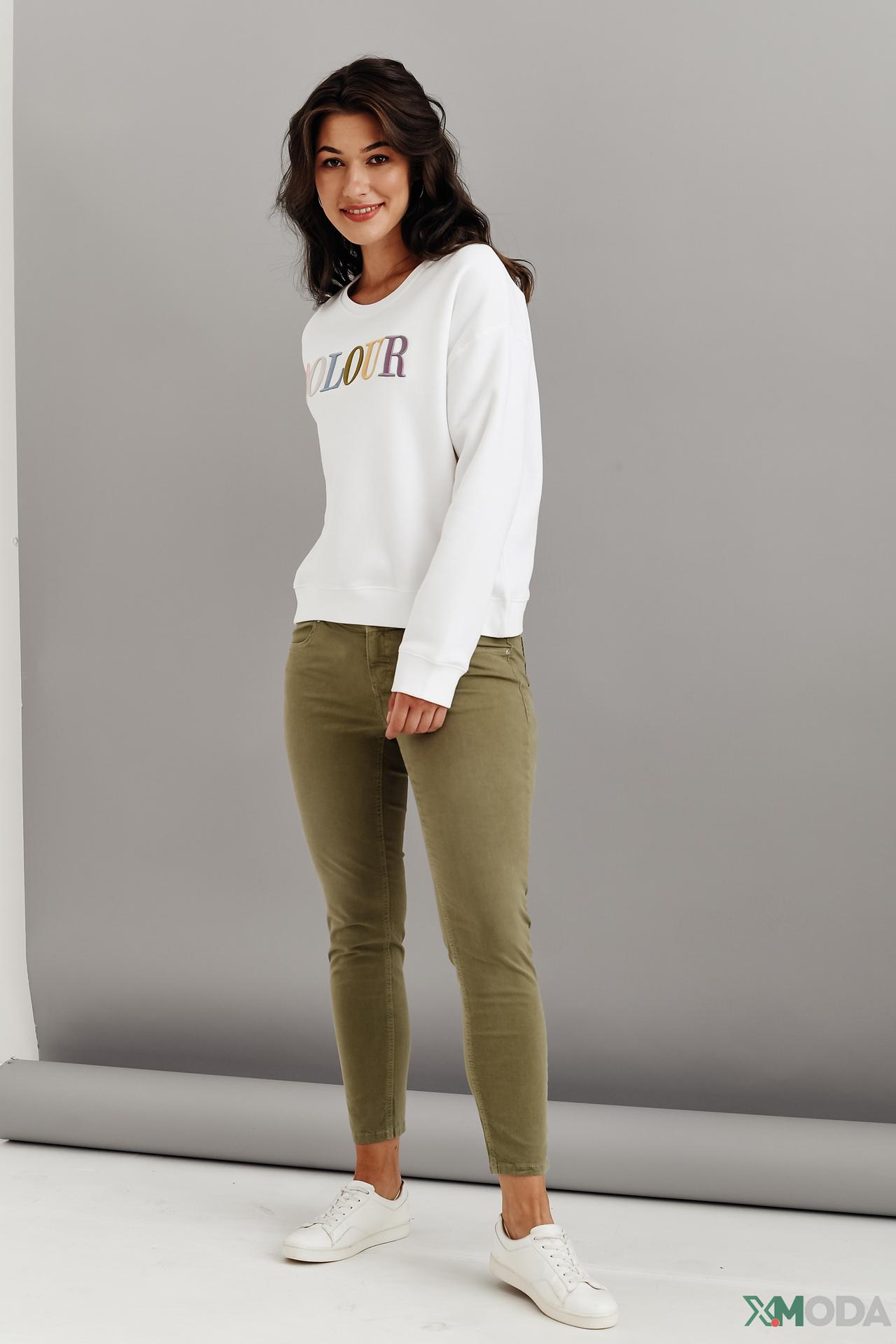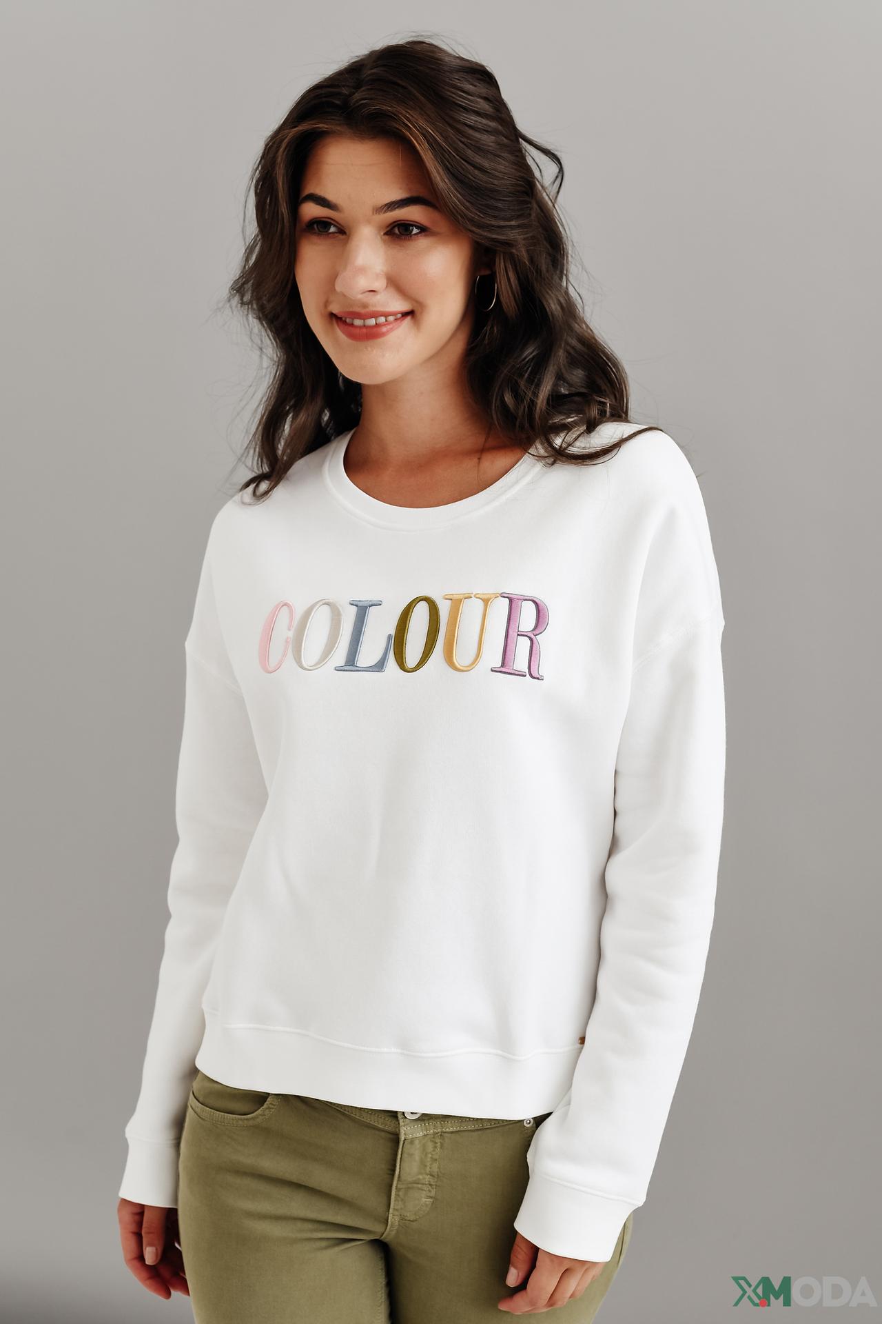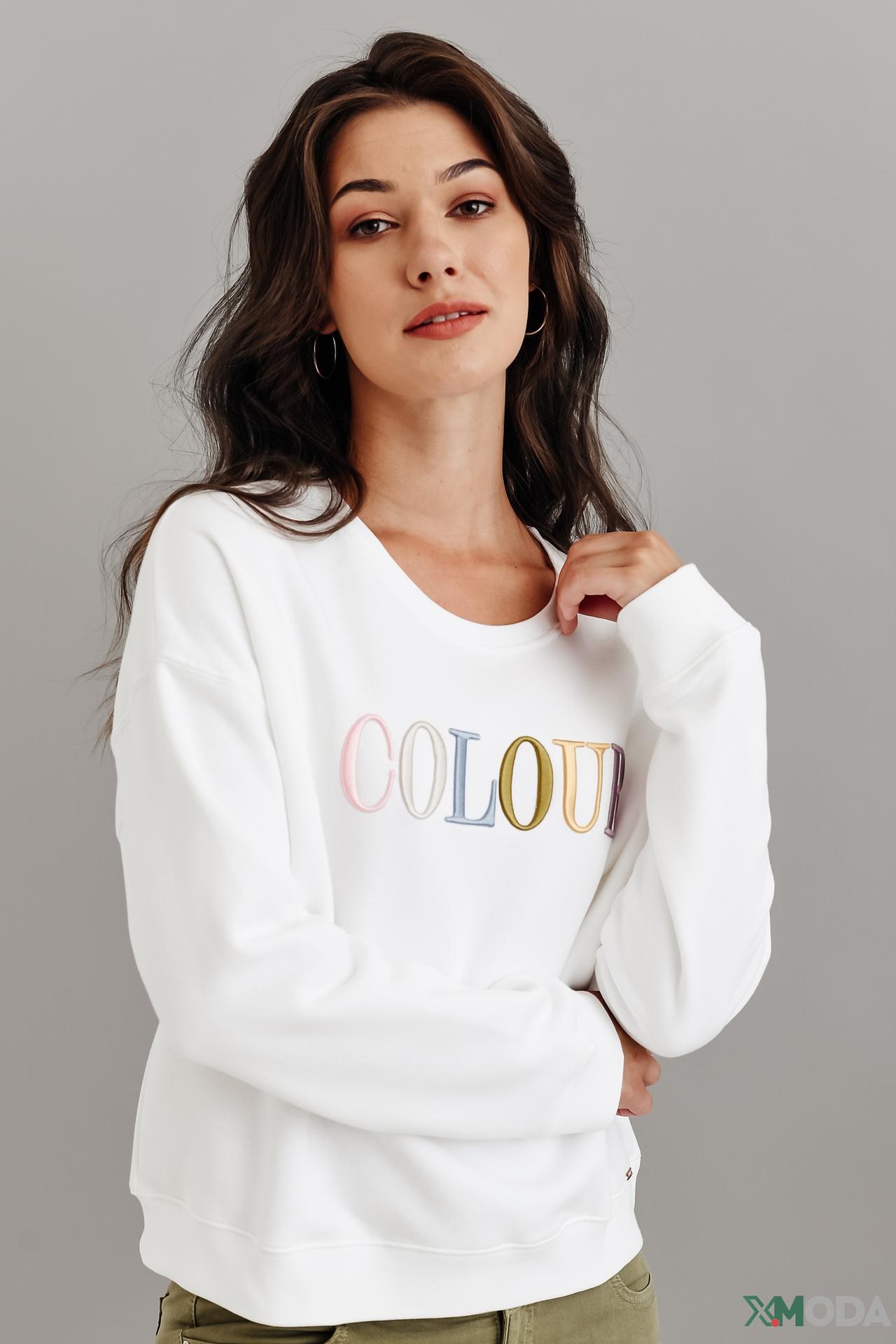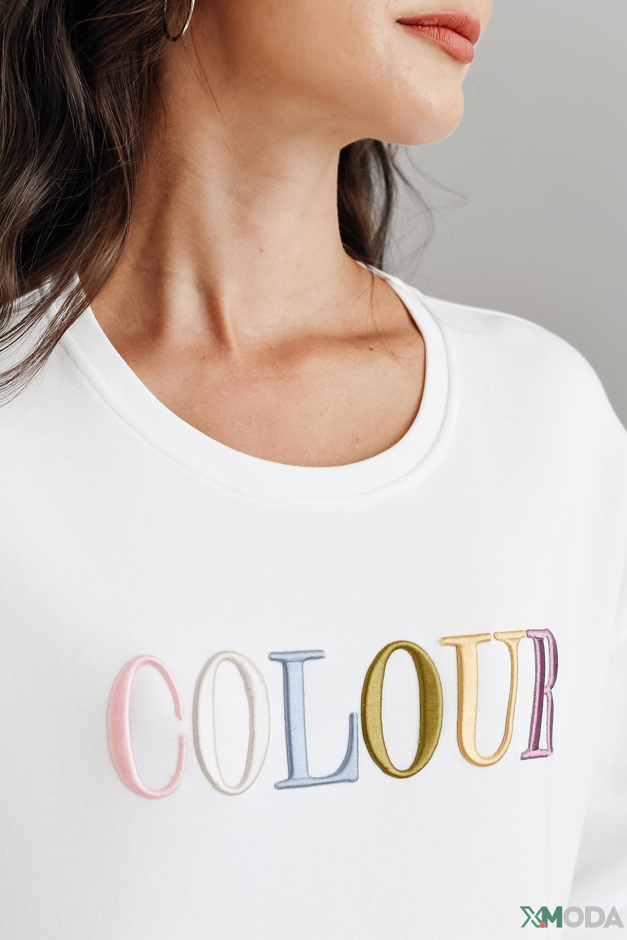 - Стильный дизайн: Белая толстовка украшена объемной вышивкой «COLOUR» разноцветными нитями, добавляющей оригинальный и игривый акцент. Классический круглый вырез и свободный крой создают непринужденный, современный образ.