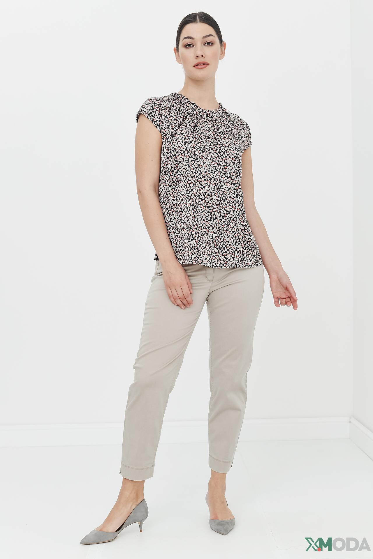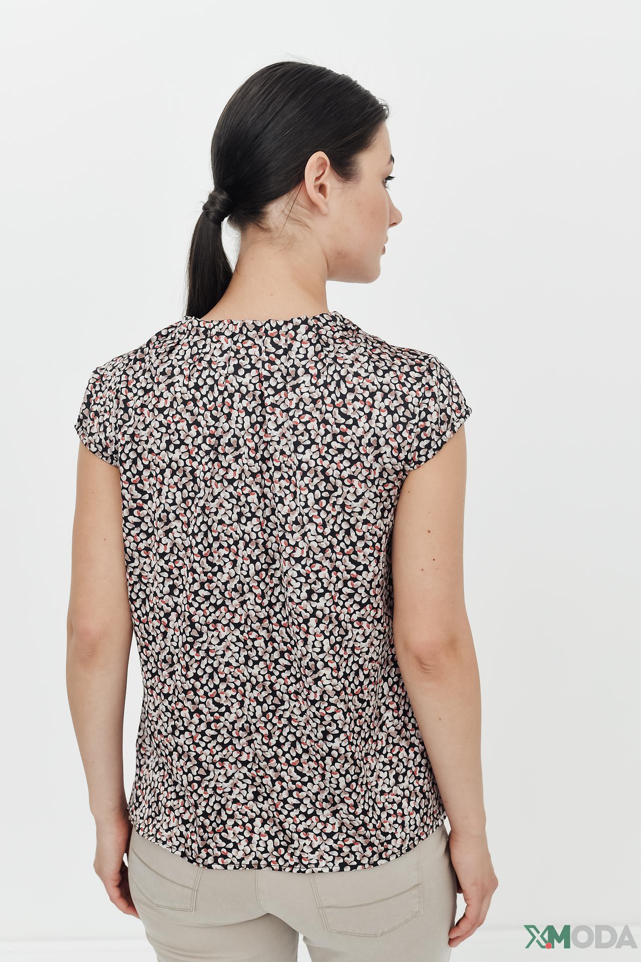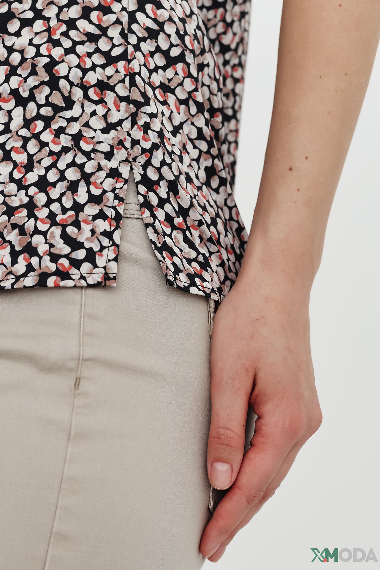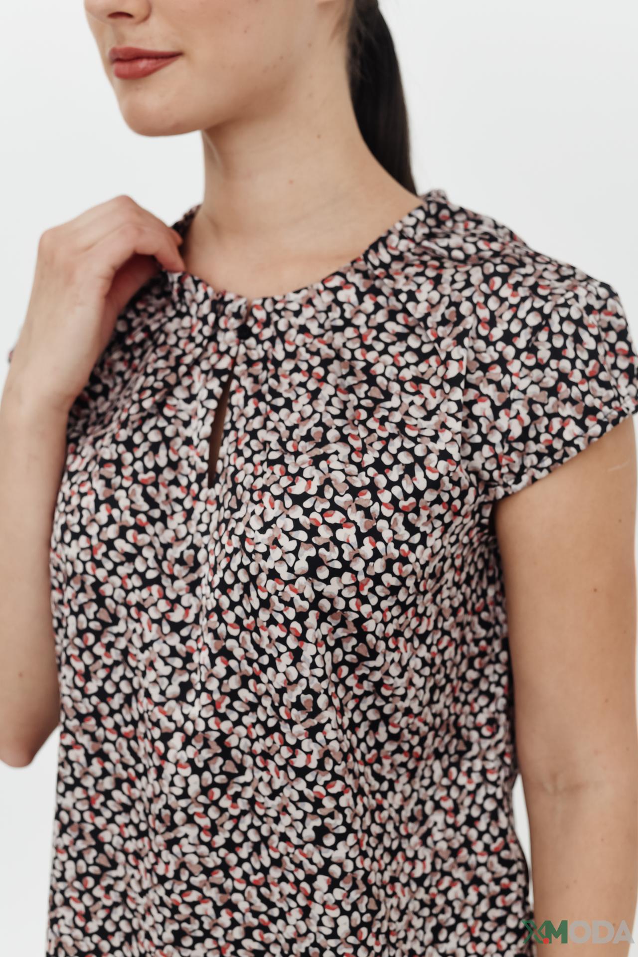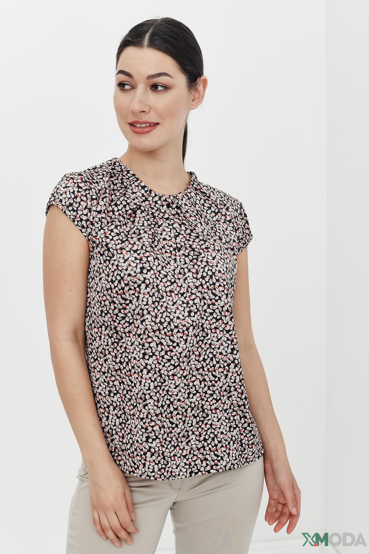 Блуза женская разноцветного цвета от бренда Betty and Co. Модель выполнена прямым фасоном. Изделие дополнено округлым воротом, короткими рукавами, передней застежкой на пуговицу, боковыми разрезами. По окружности расположены складки. Ткань блузы имеет разноцветный принт. Состав: 3% эластан, 97% полиэстер. Сочетать можно с различными брюками и юбками.