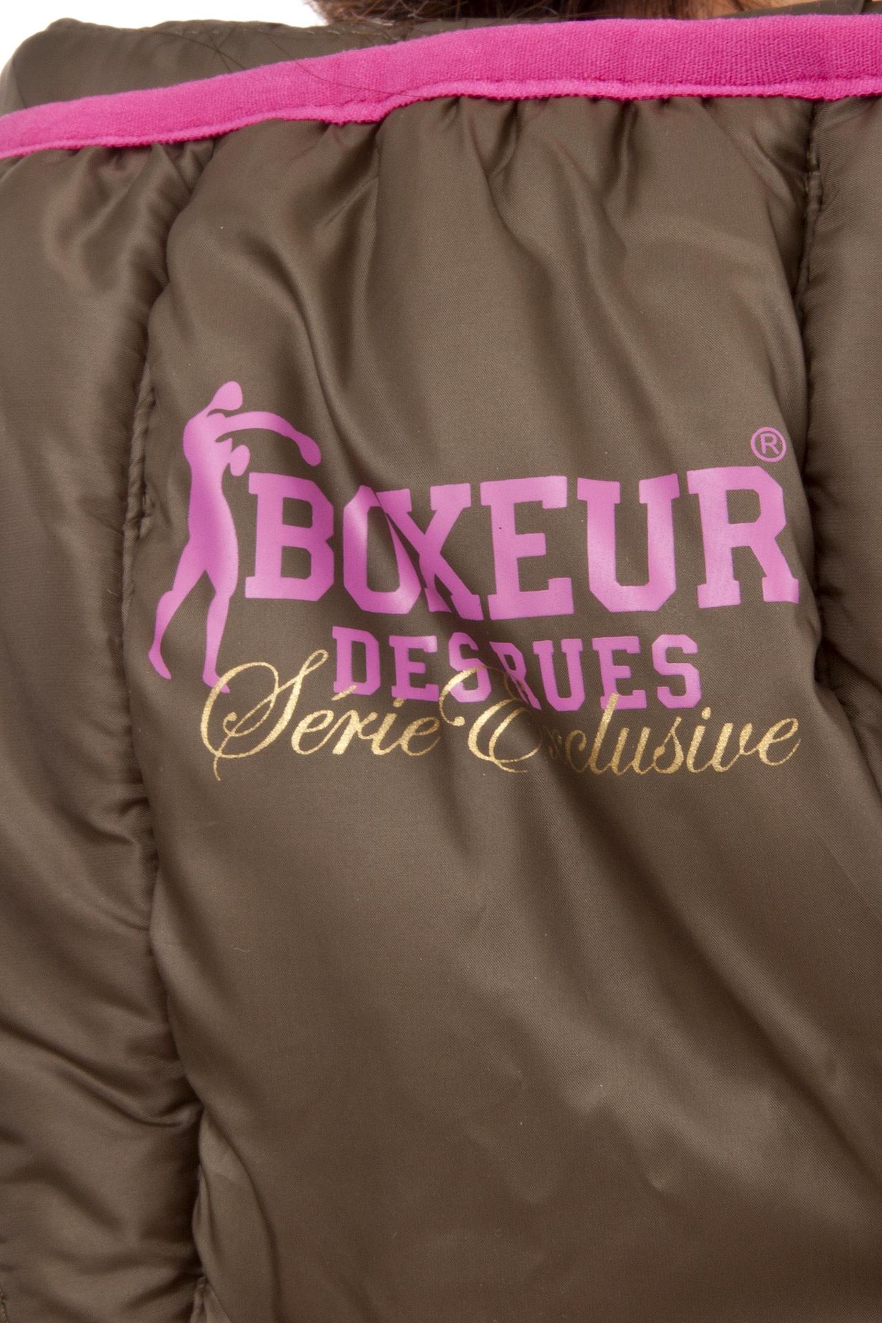 Стеганная оливковая куртка Boxeur Des Rues приталенного кроя. Изделие дополнено: капюшоном, двумя внешними боковыми карманами на ярко-розовой молнии, двумя внутренними карманами. Центральная часть изделия застегивается на молнию розового цвета с внутренней ветрозащитной планкой. Капюшон декорирован принтом с символикой и названием бренда, манжеты и нижний кант оформлены ярко-розовой оторочкой. Подкладка и утеплитель 100% полиэстер.