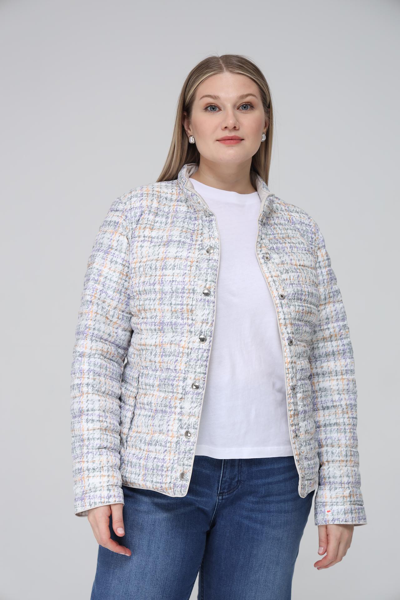 Двусторонний дизайн предлагает два варианта стиля в одном изделии: однотонный бежевый и с узором в клетку. Застежка на кнопках добавляет удобства и функциональности.