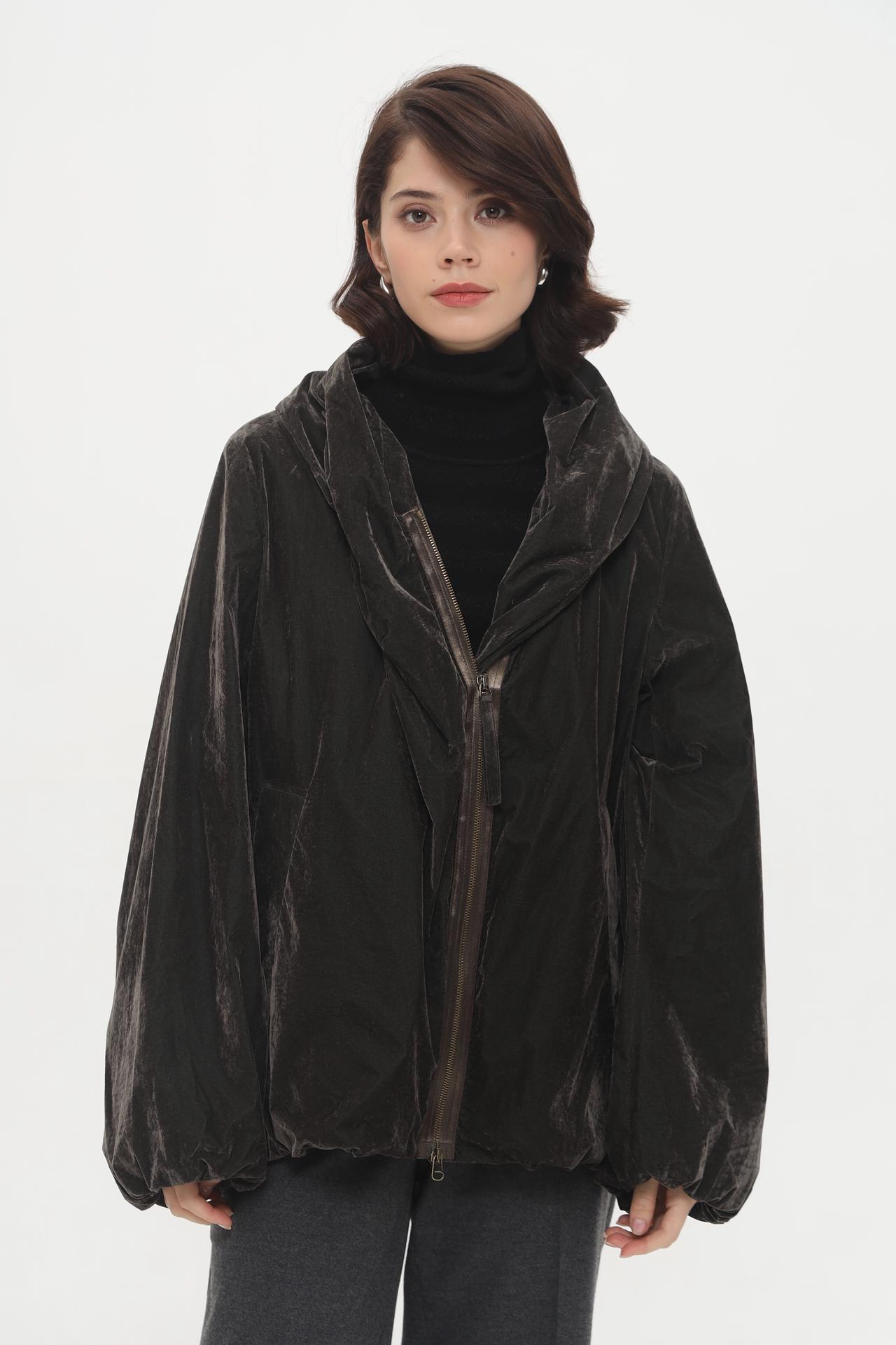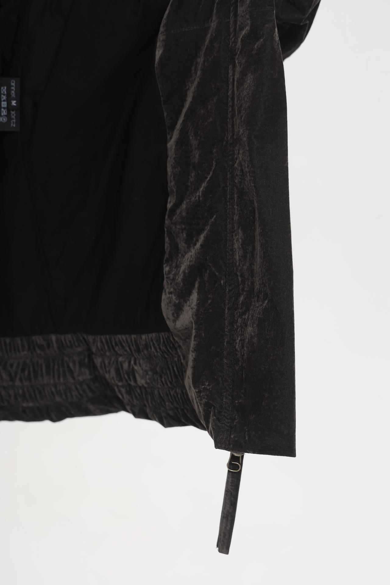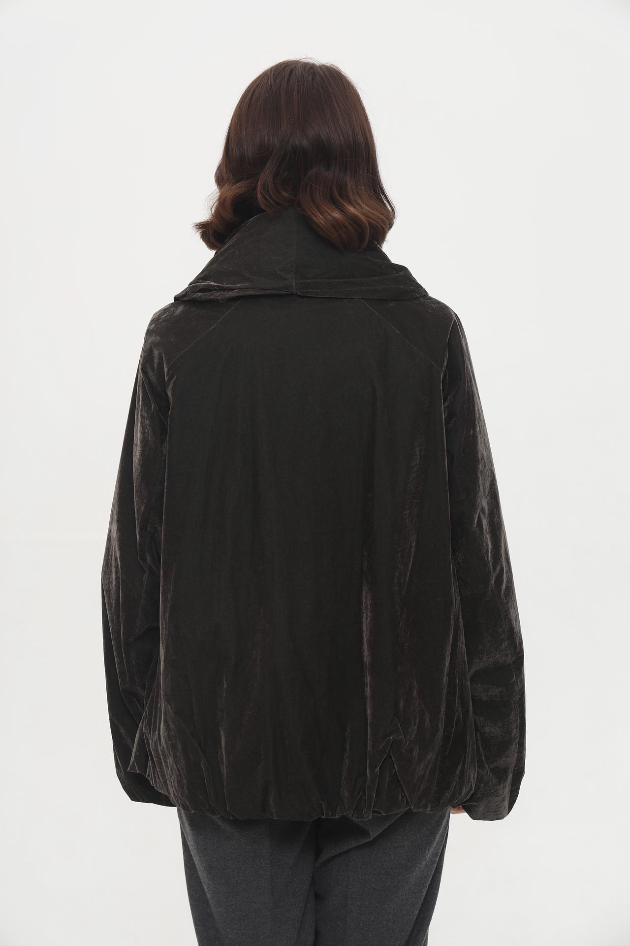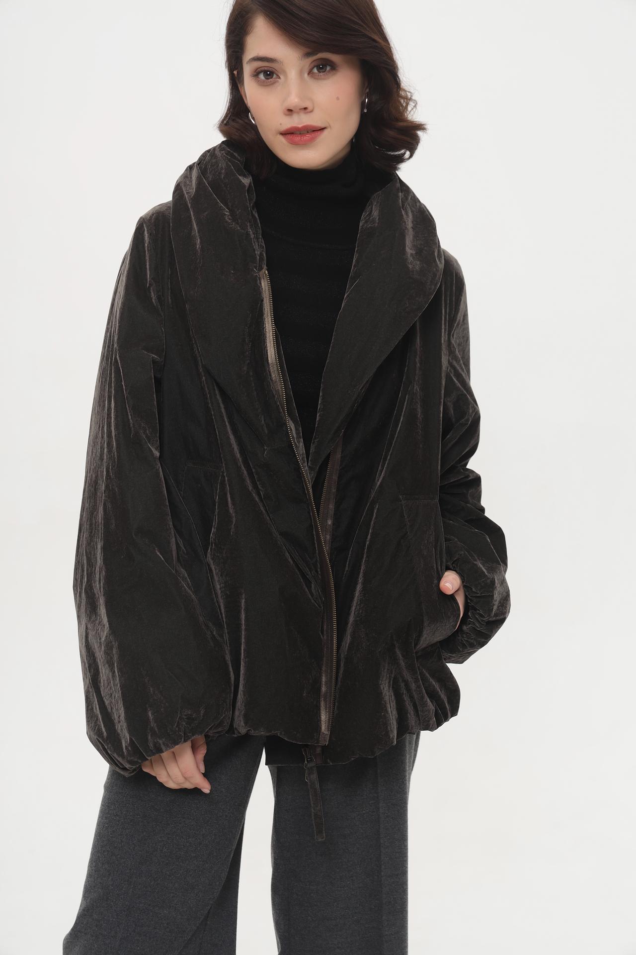 - Дизайн и крой: Объемный силуэт с заниженной линией плеча создает актуальный оверсайз образ, при этом сохраняя элегантность. Эластичный низ и манжеты рукавов формируют модный закругленный объем, добавляя куртке динамичности.