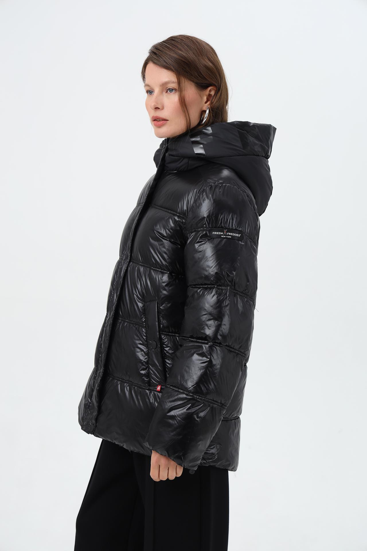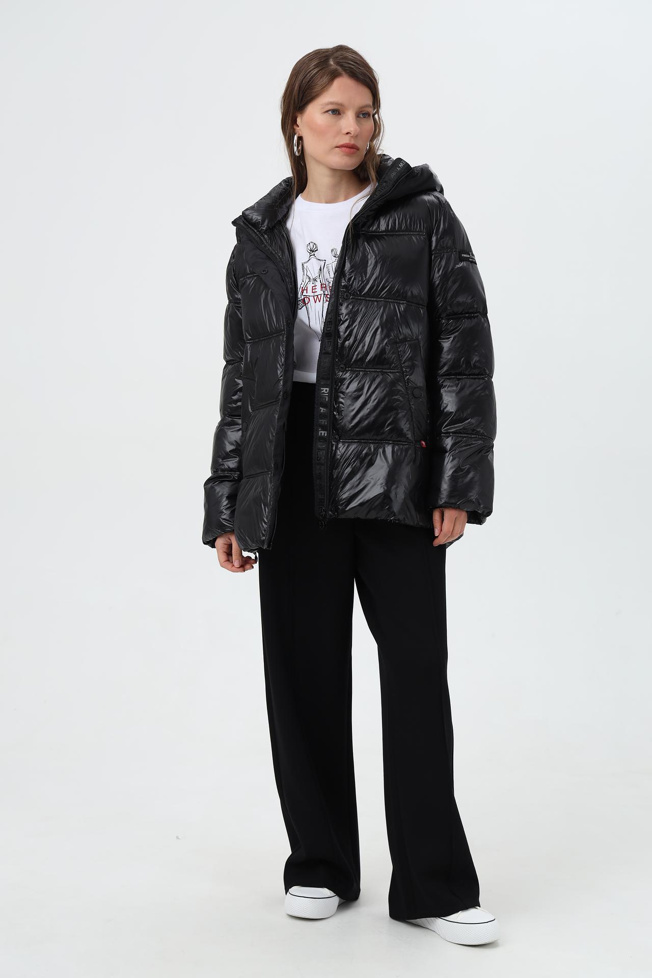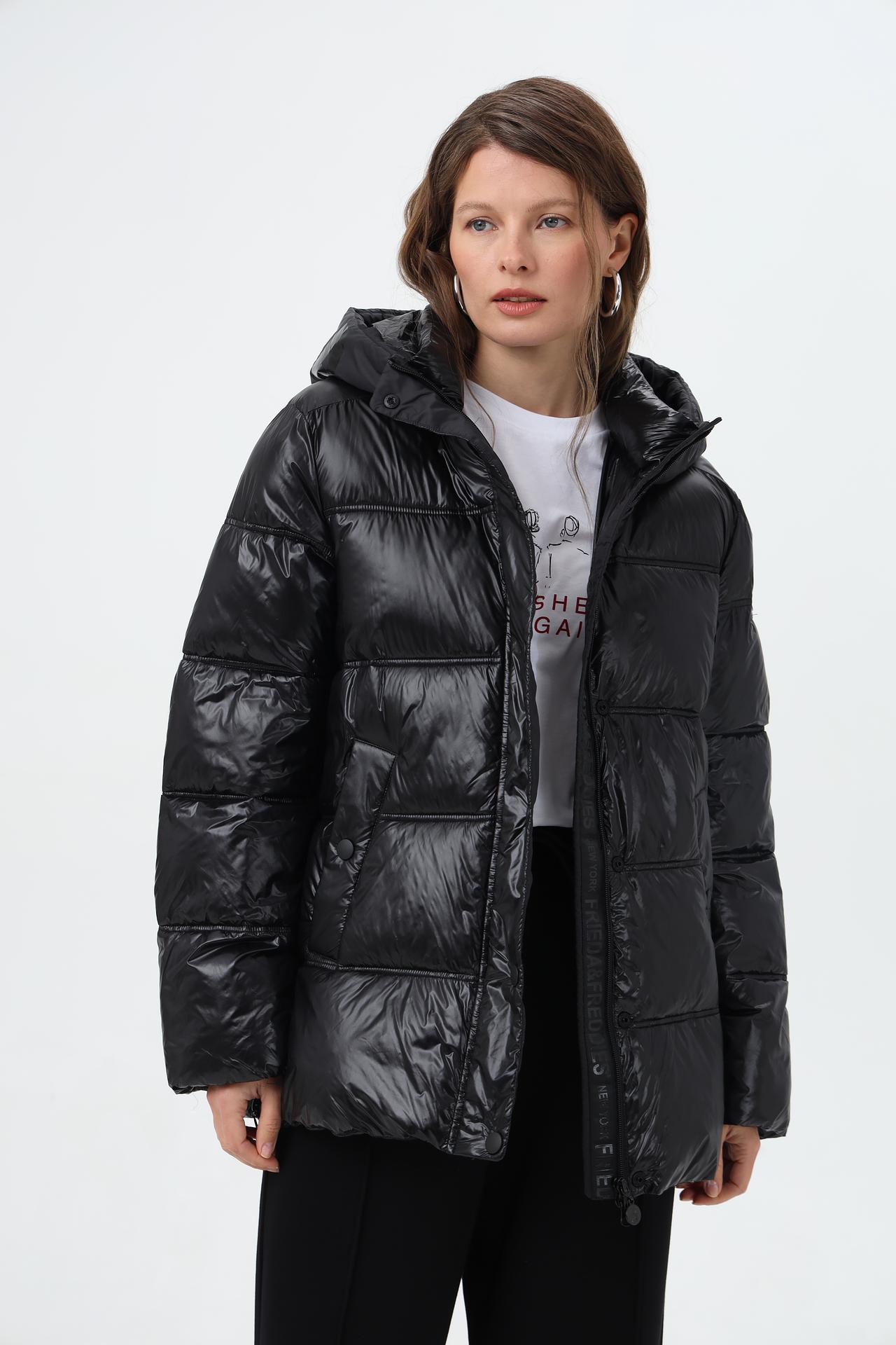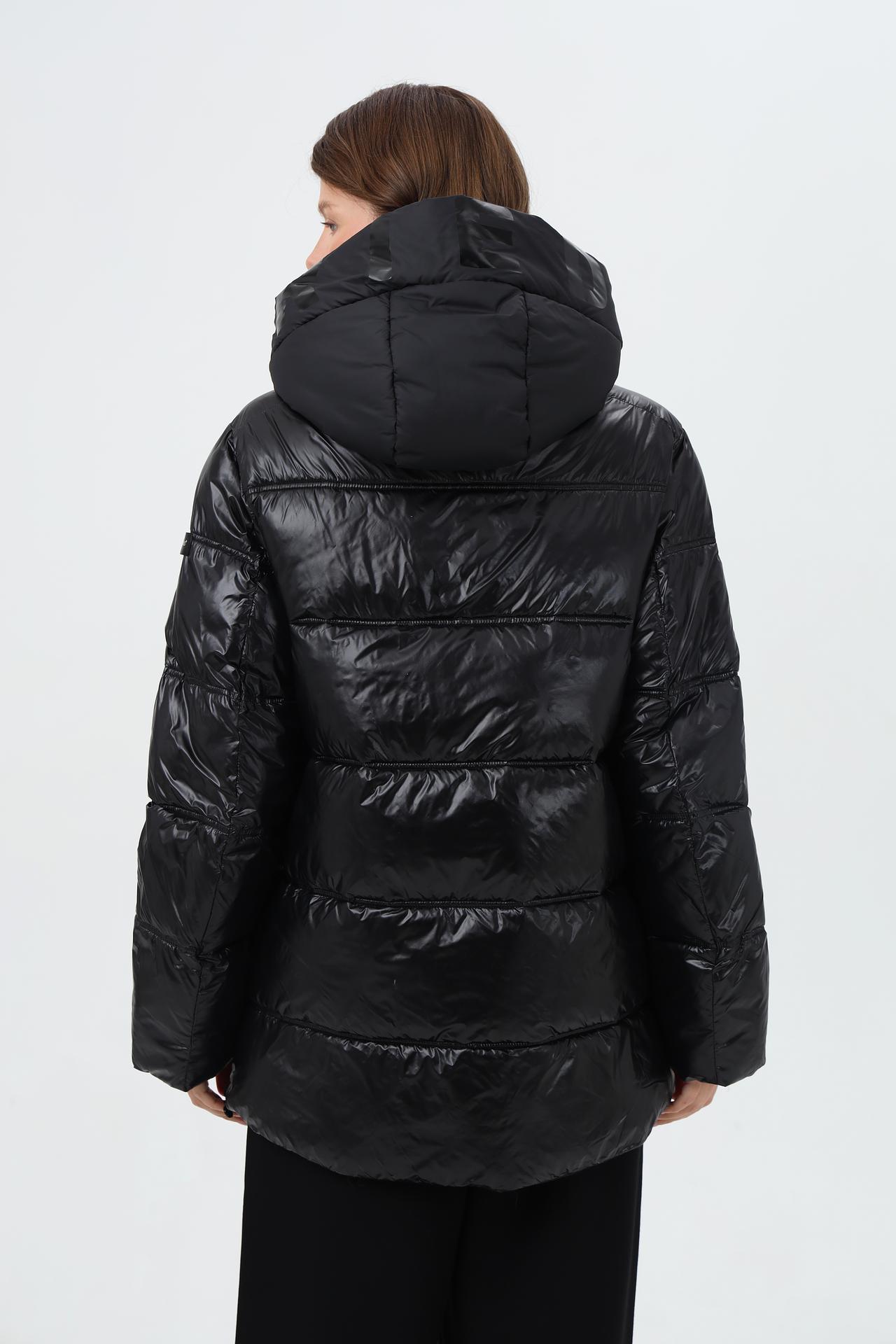 - Дизайн: Современный объемный крой с капюшоном. Куртка имеет глянцевую поверхность и горизонтальную простежку, которая создает элегантный внешний вид.