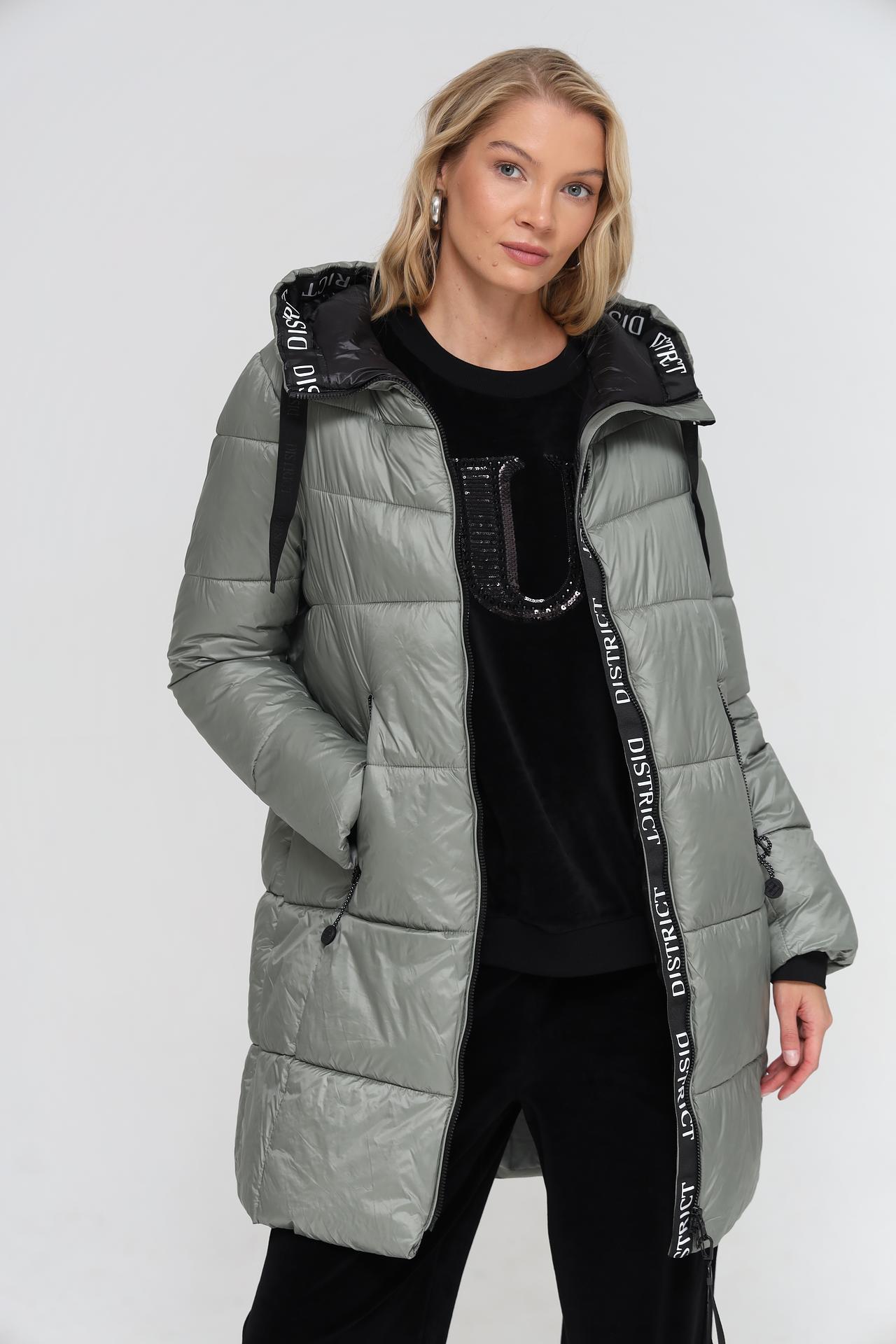 Пальто District, удлиненное, оливкового цвета, с надписями