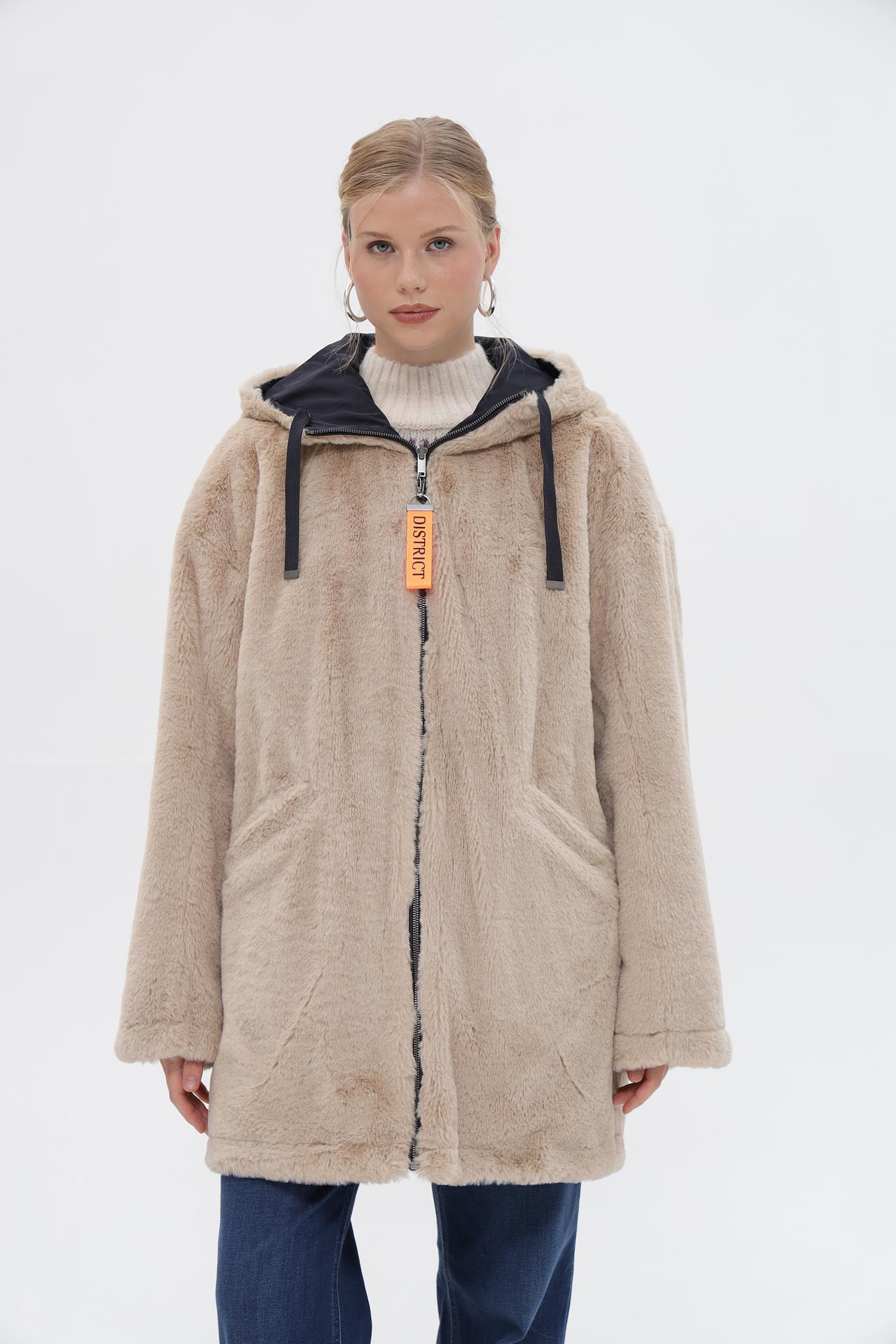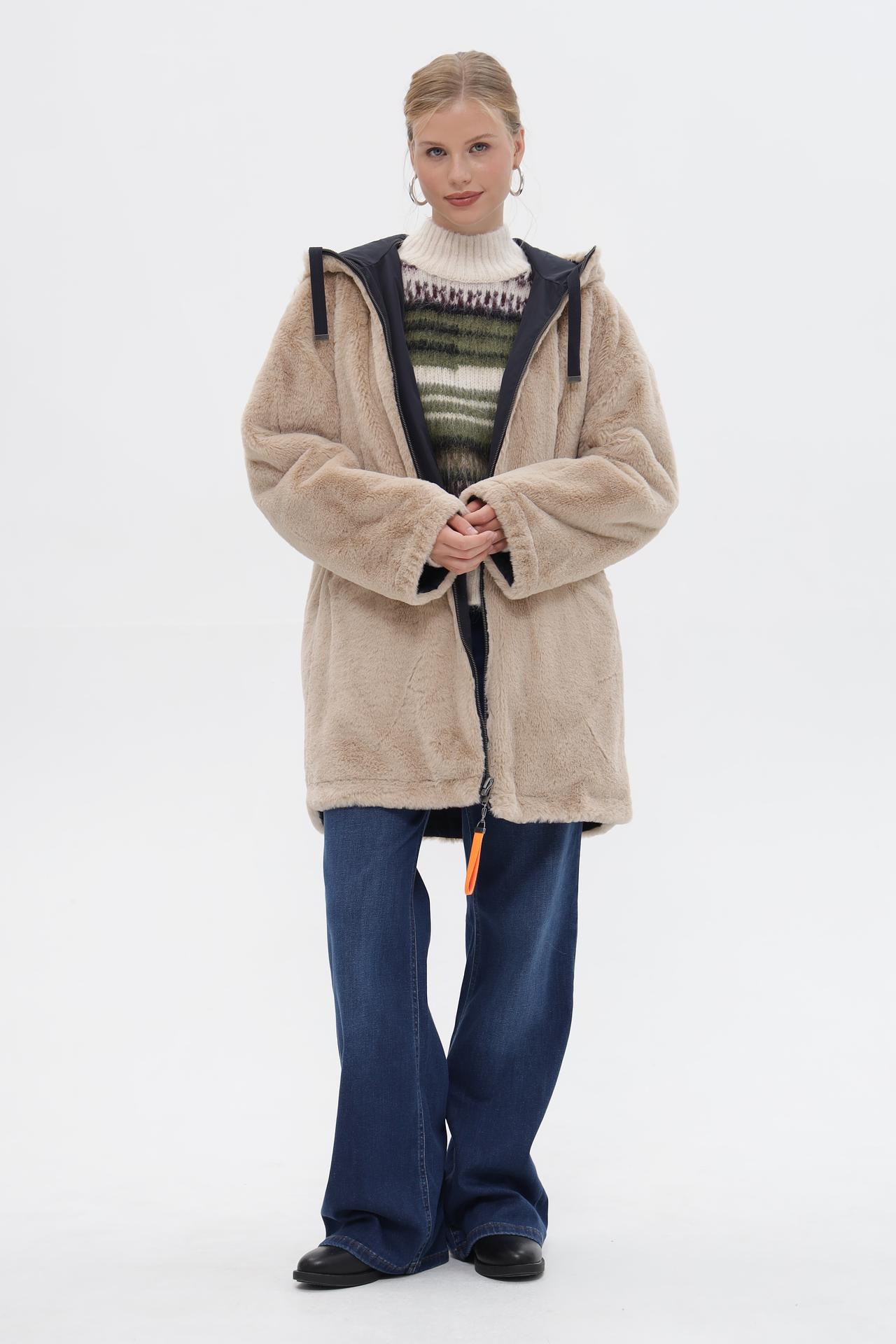 - Двусторонний дизайн: Одна сторона пальто изготовлена из уютного искусственного меха, другая — из практичного полиэстера. Это даёт возможность выбрать тот вариант, который подходит к вашему образу или погодным условиям.