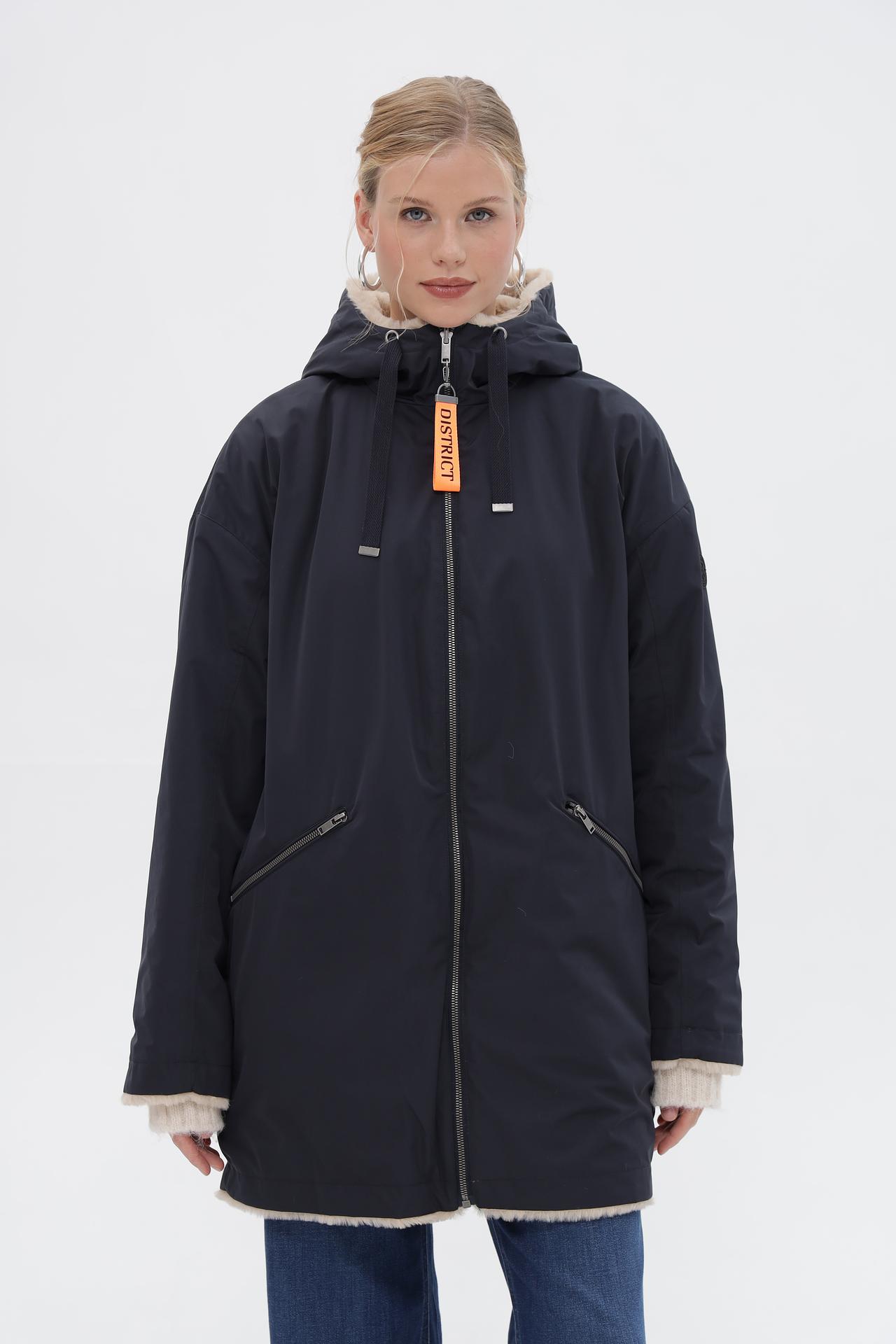 - Детали: Модель оснащена удобной молнией и функциональными карманами, а яркая оранжевая бирка с названием бренда District придаёт пальто оригинальность и узнаваемость.