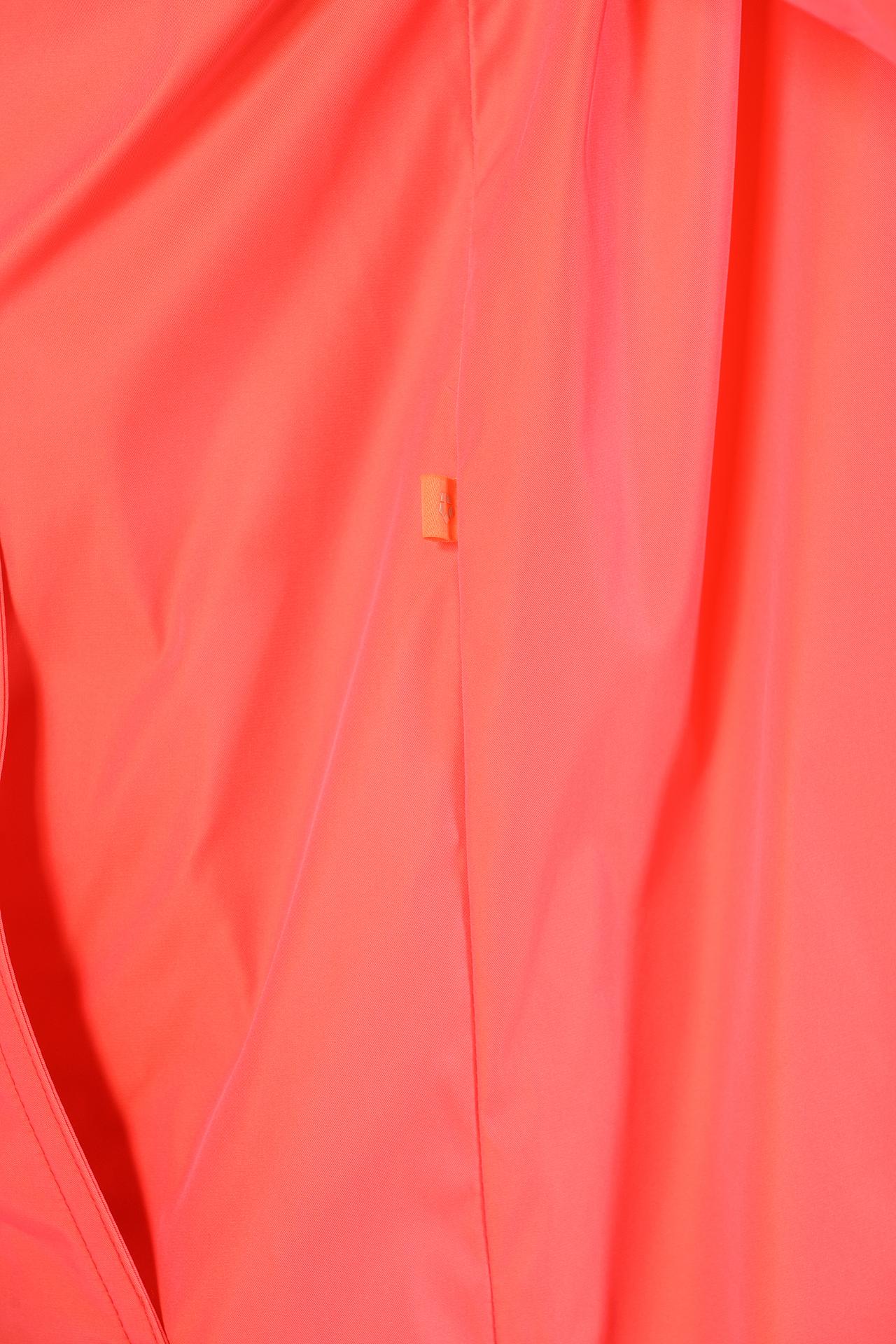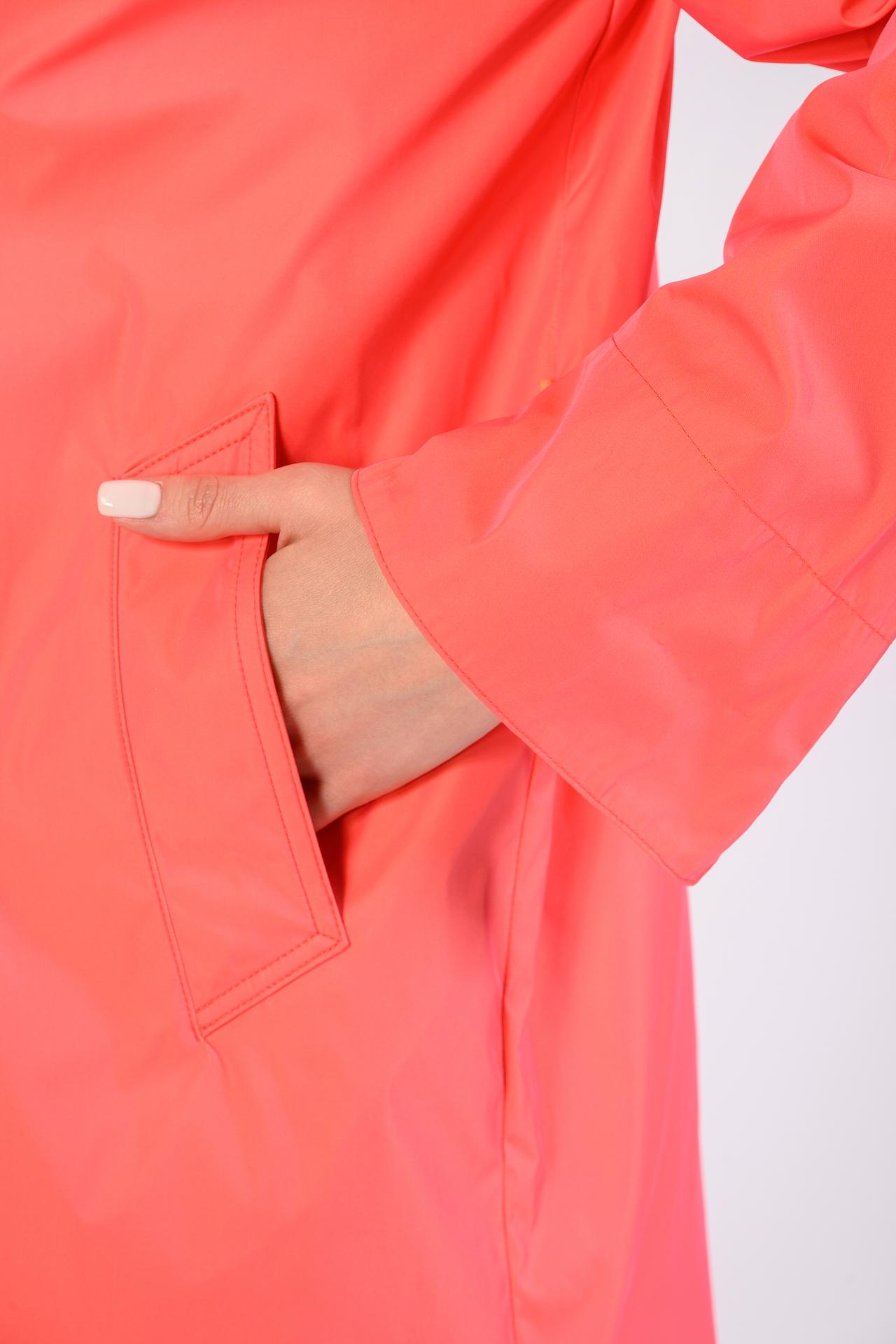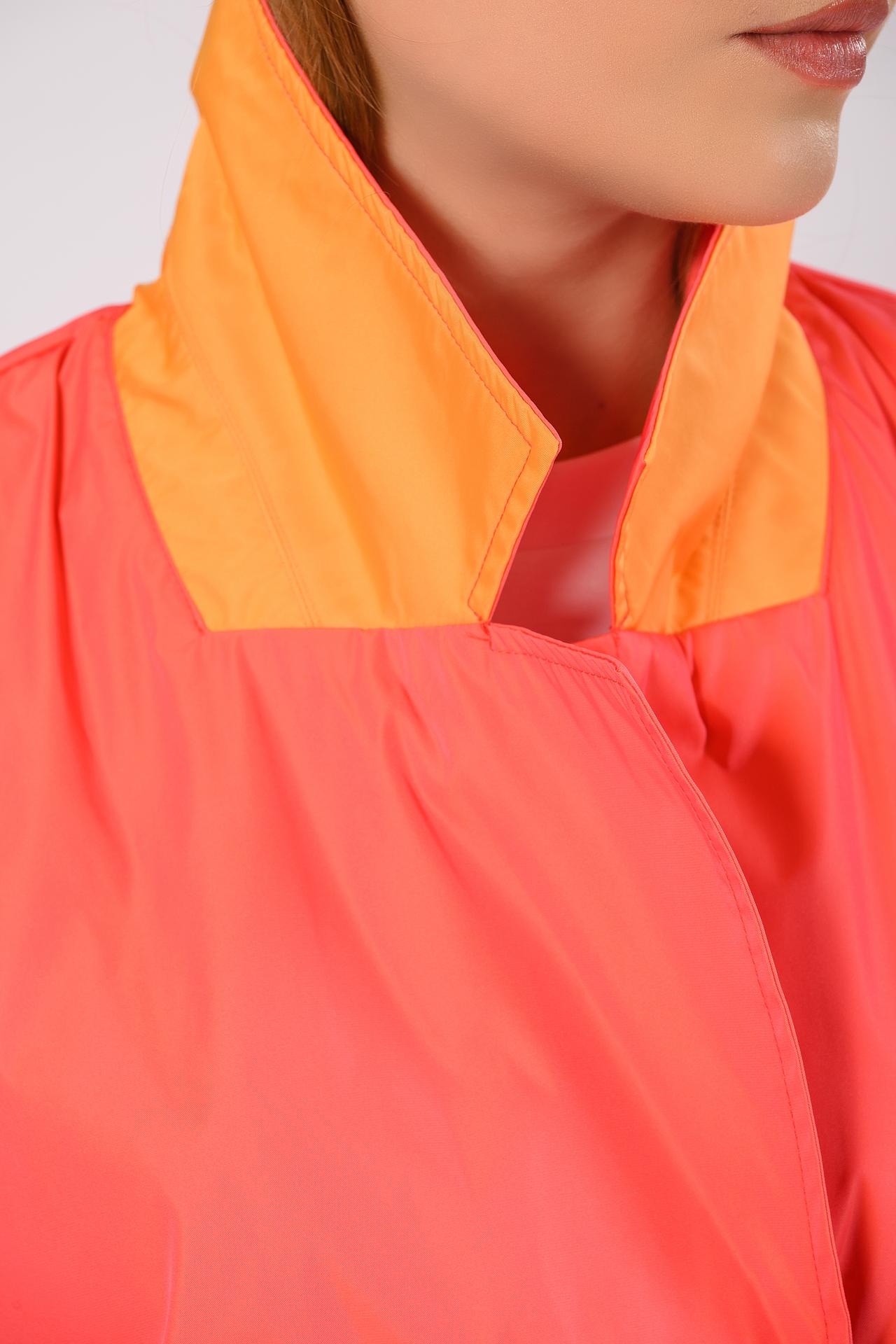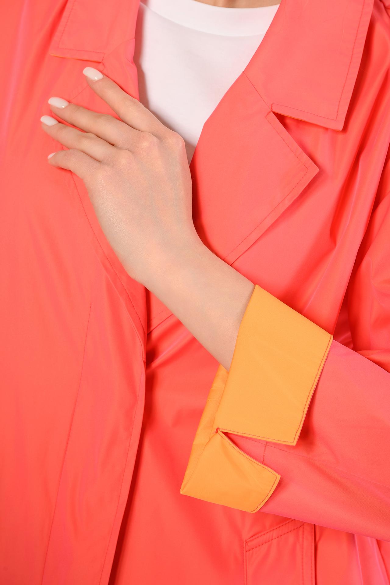 - Яркий акцент: Насыщенный оранжевый цвет делает плащ заметным элементом гардероба, поднимая настроение в пасмурные дни. Контрастная отделка на воротнике и манжетах придает изделию уникальный и современный вид.
