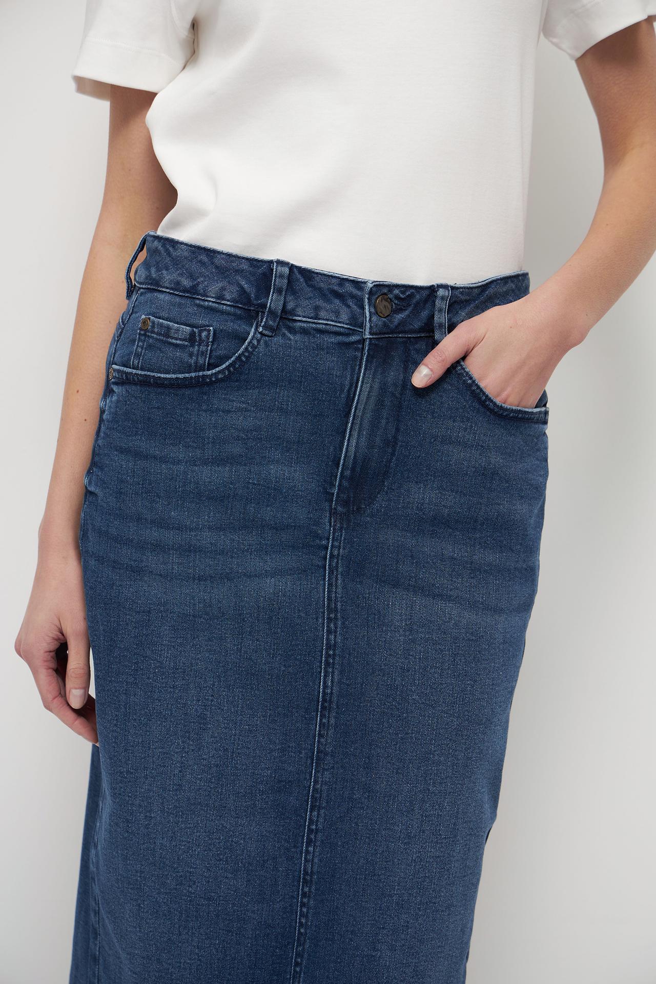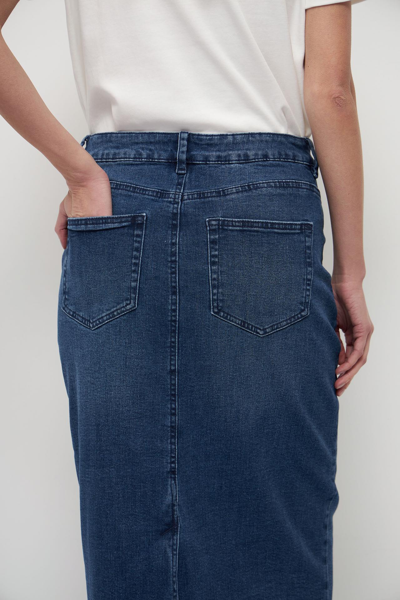 - Стильный дизайн: Классический джинсовый синий цвет и актуальная длина миди с необработанным краем создают современный и универсальный образ, легко сочетающийся с различной обувью и верхом.