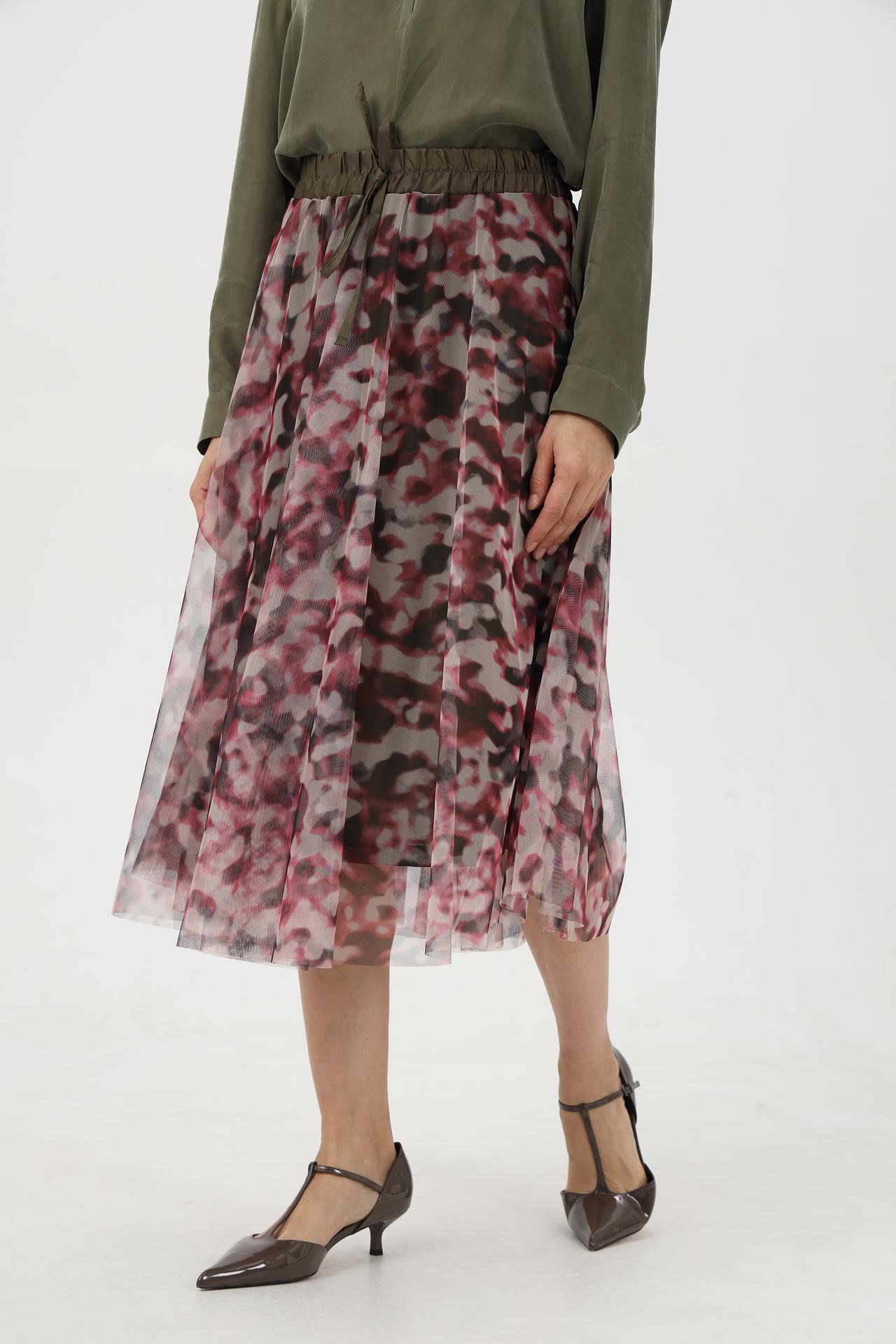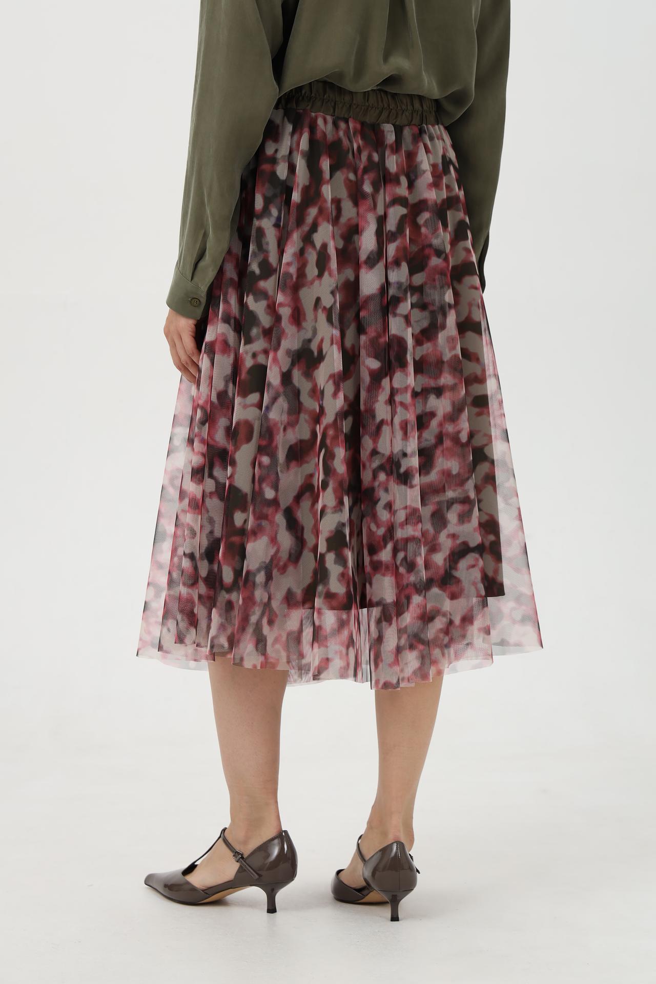 - Дизайн: Юбка отличается актуальным принтом, напоминающим акварельные разводы. Благодаря своей фактуре и крою, она придает образу женственности и утонченности.