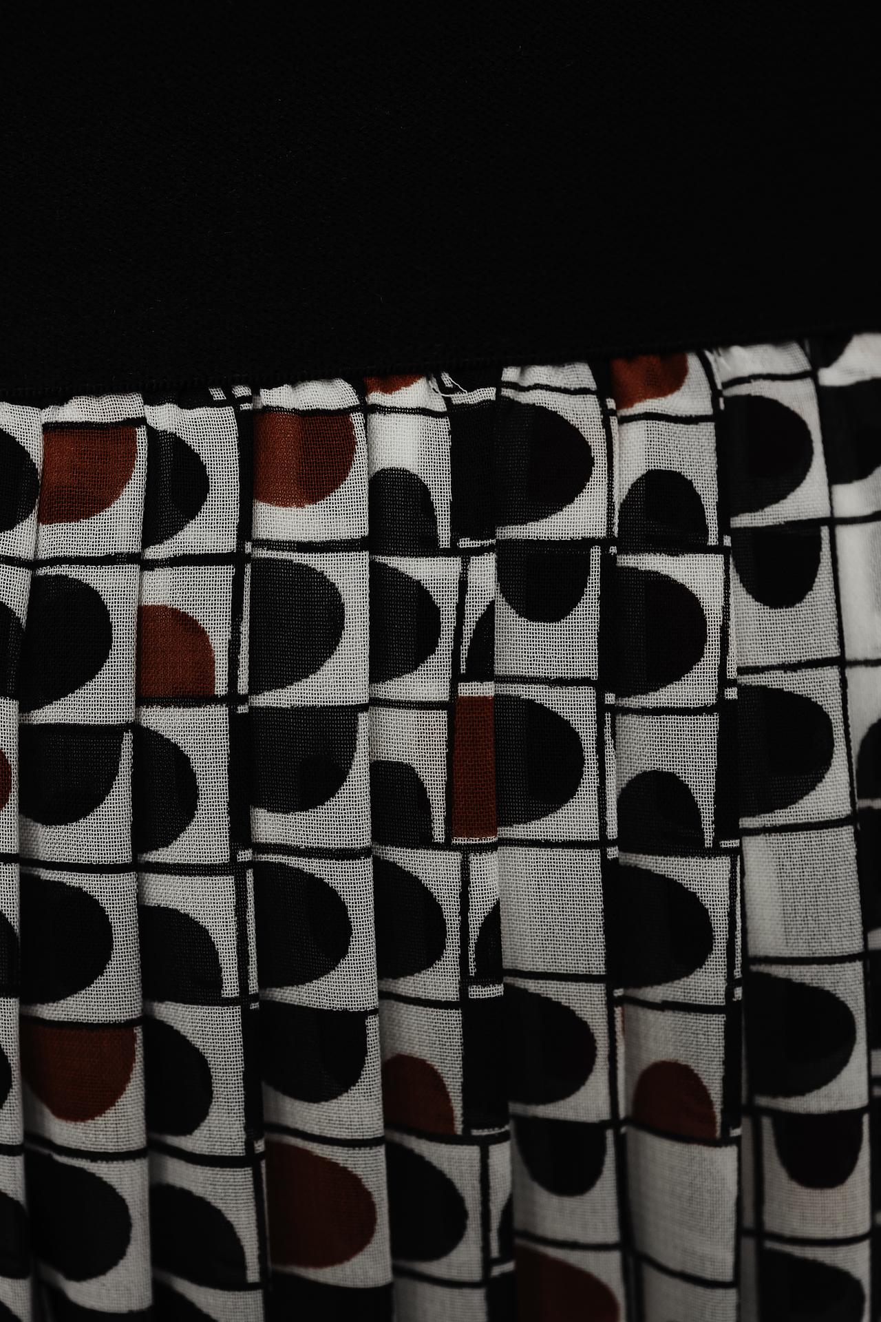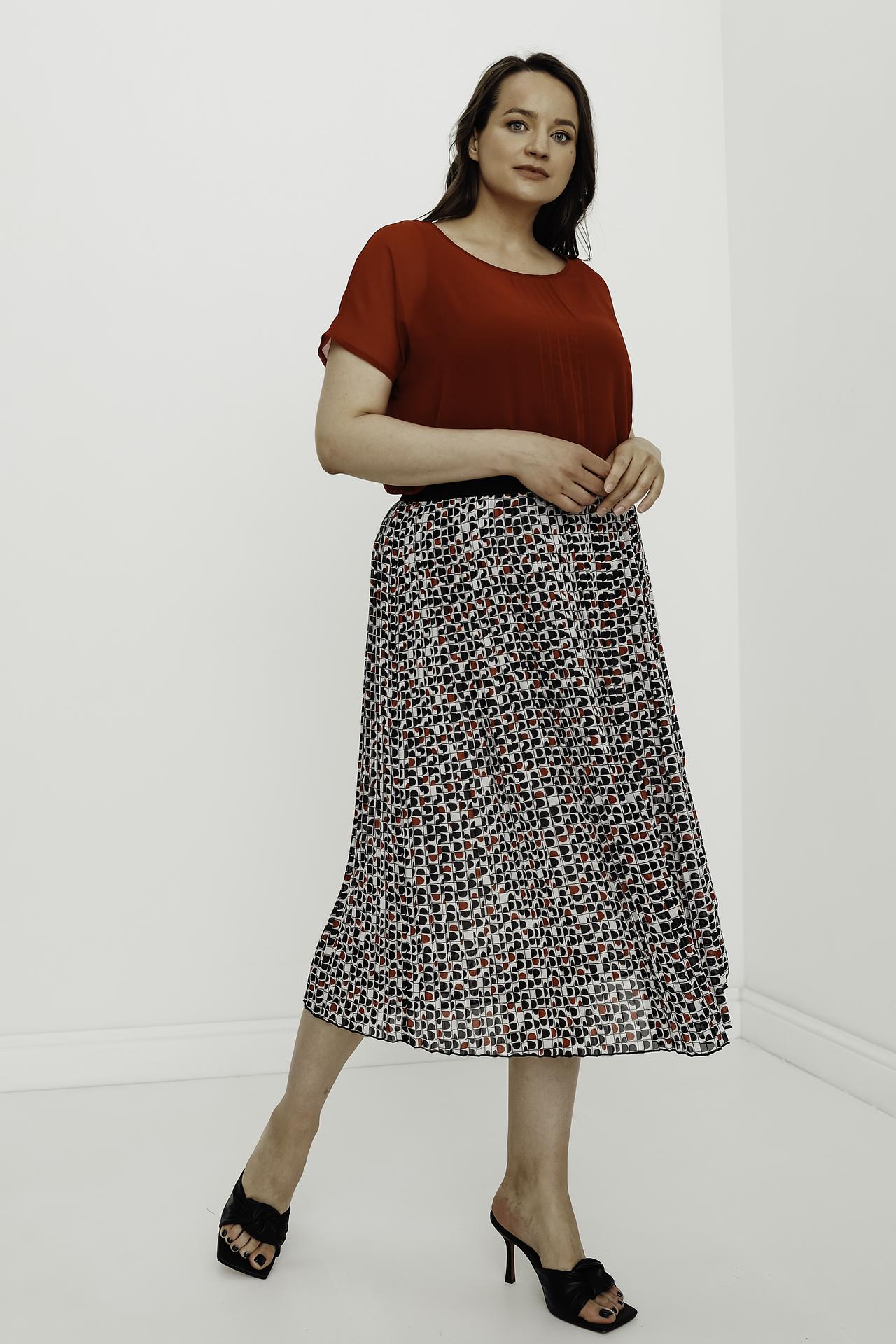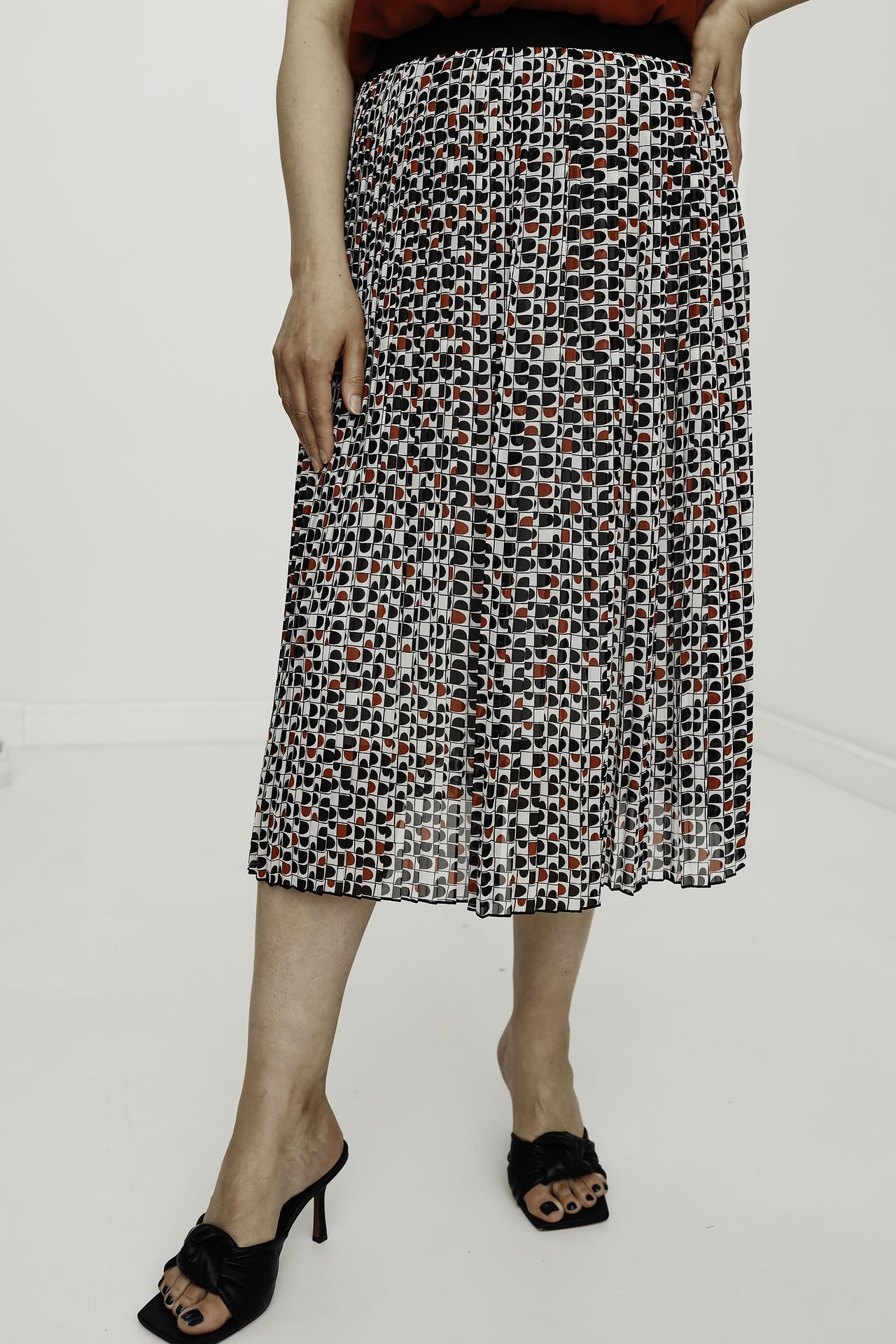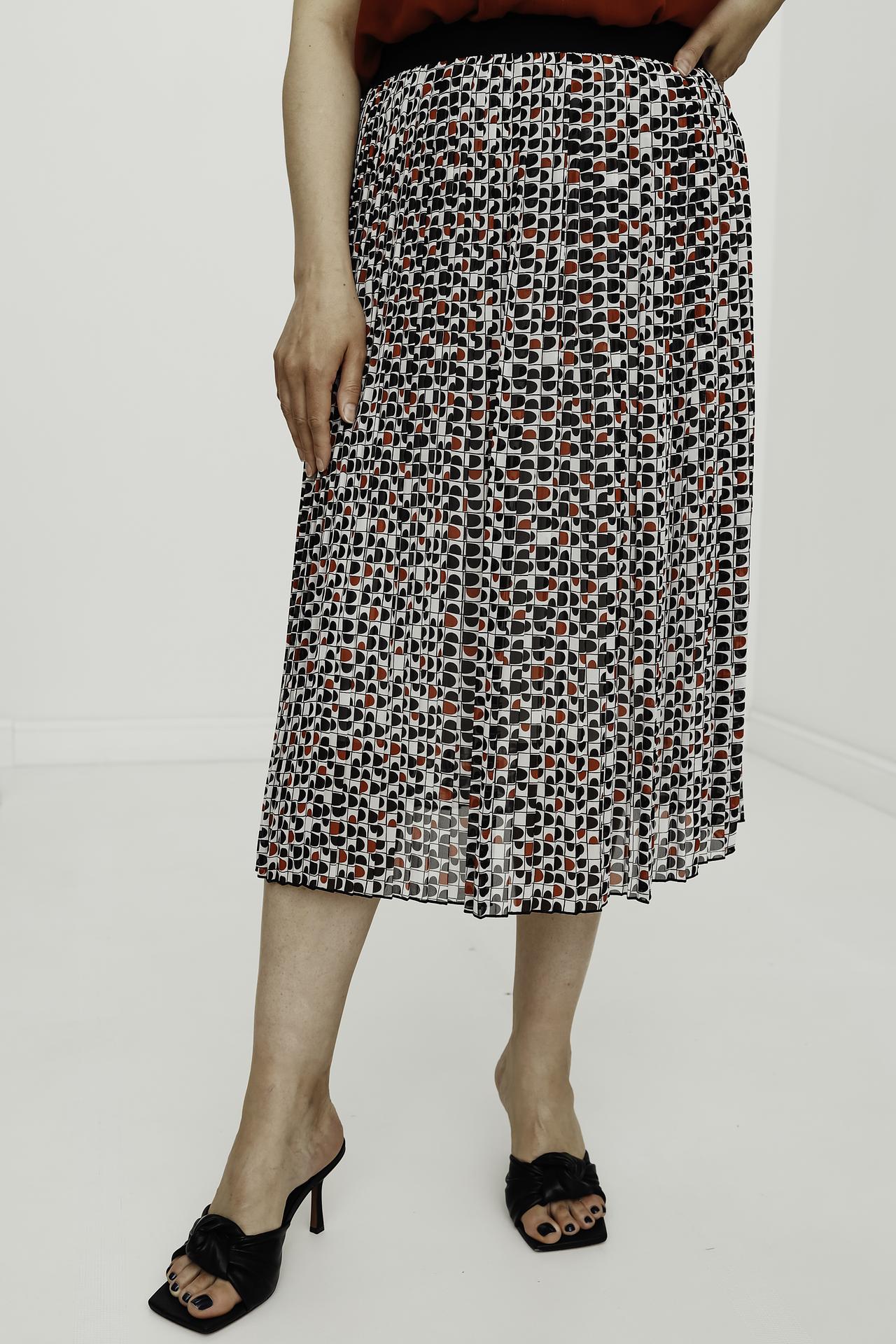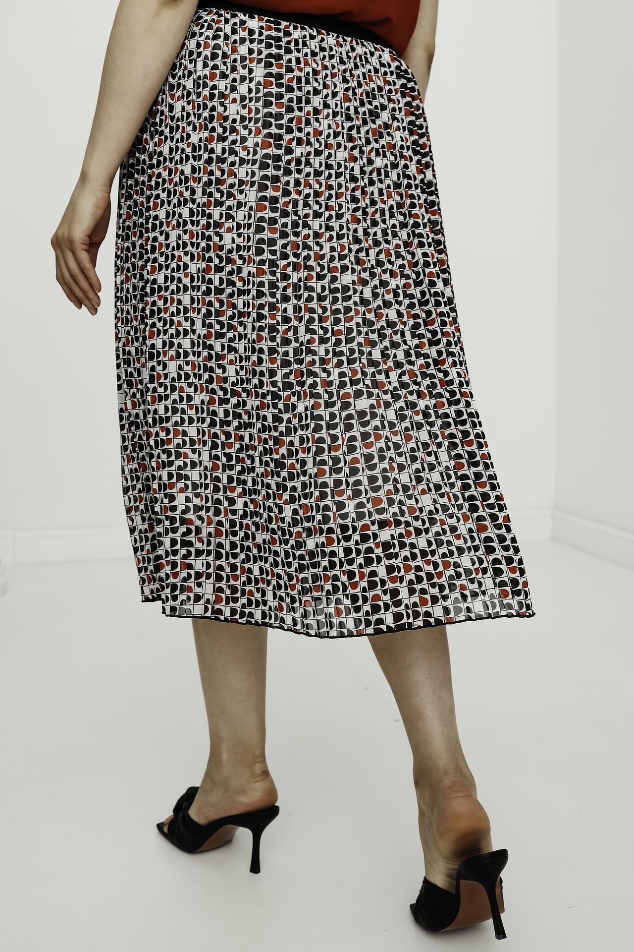 Женская плиссированная юбка миди Lebek из 100% полиэстера. Легкая ткань с уникальным геометрическим принтом в чёрно-красных тонах на белом фоне создает динамичный и стильный образ. Модель идеально подходит для весенне-летнего сезона, обеспечивая комфорт и непринужденность в движении.