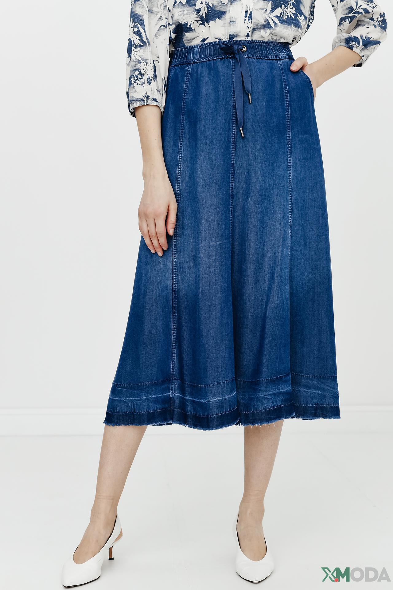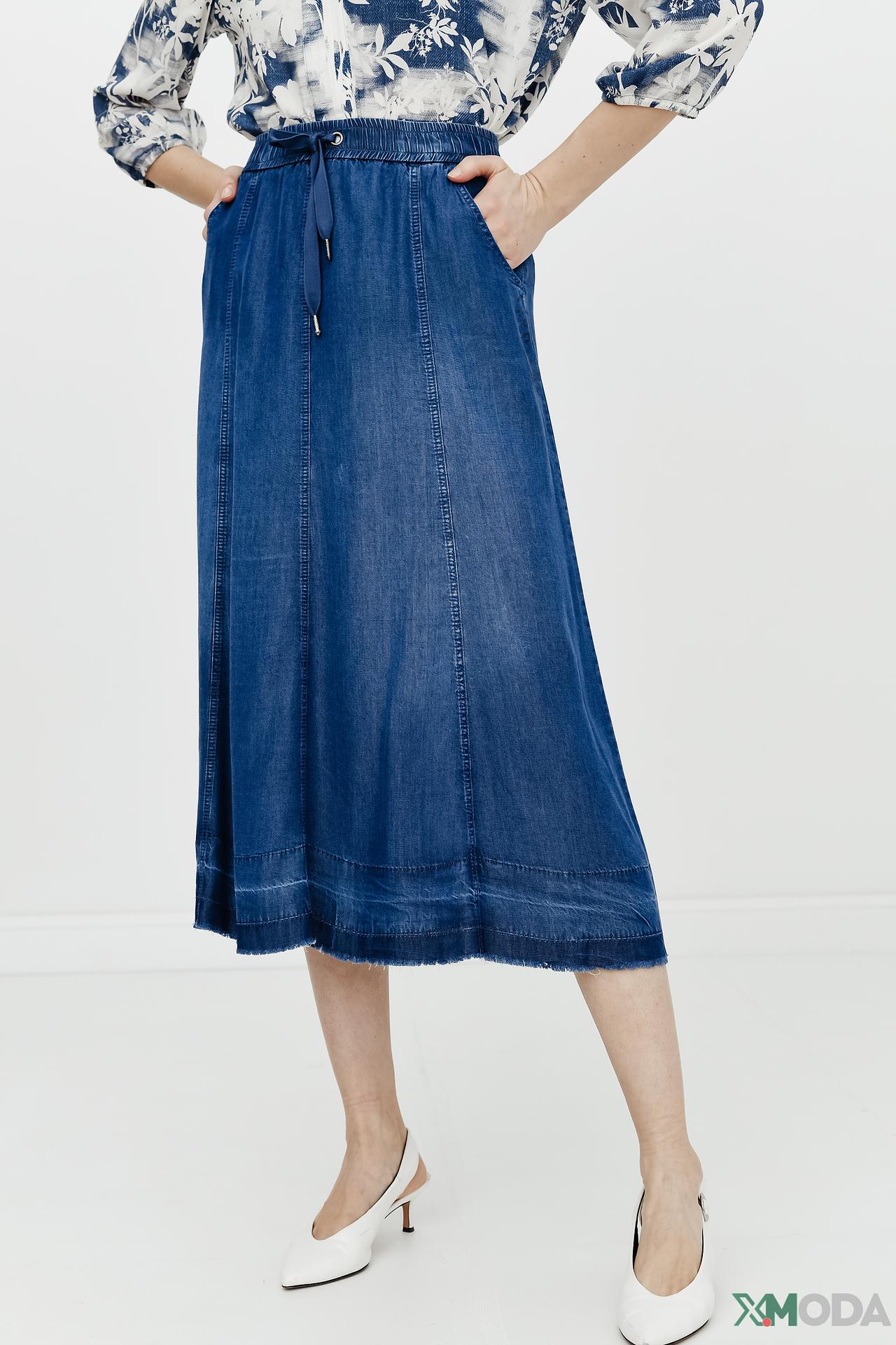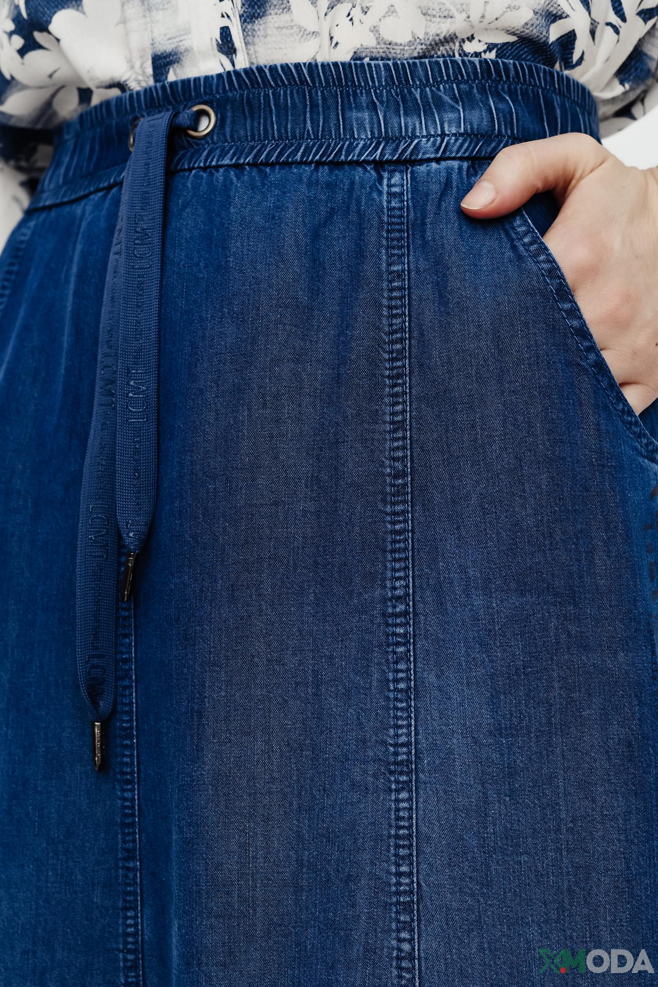 - Дизайн: Юбка выполнена в синем деним цвете с контрастной отстрочкой. Эластичный пояс со шнурком-завязкой обеспечивает идеальную посадку по фигуре. По бокам имеются удобные карманы. Низ юбки обработан эффектом необработанного края, что придает изделию модный вид.
