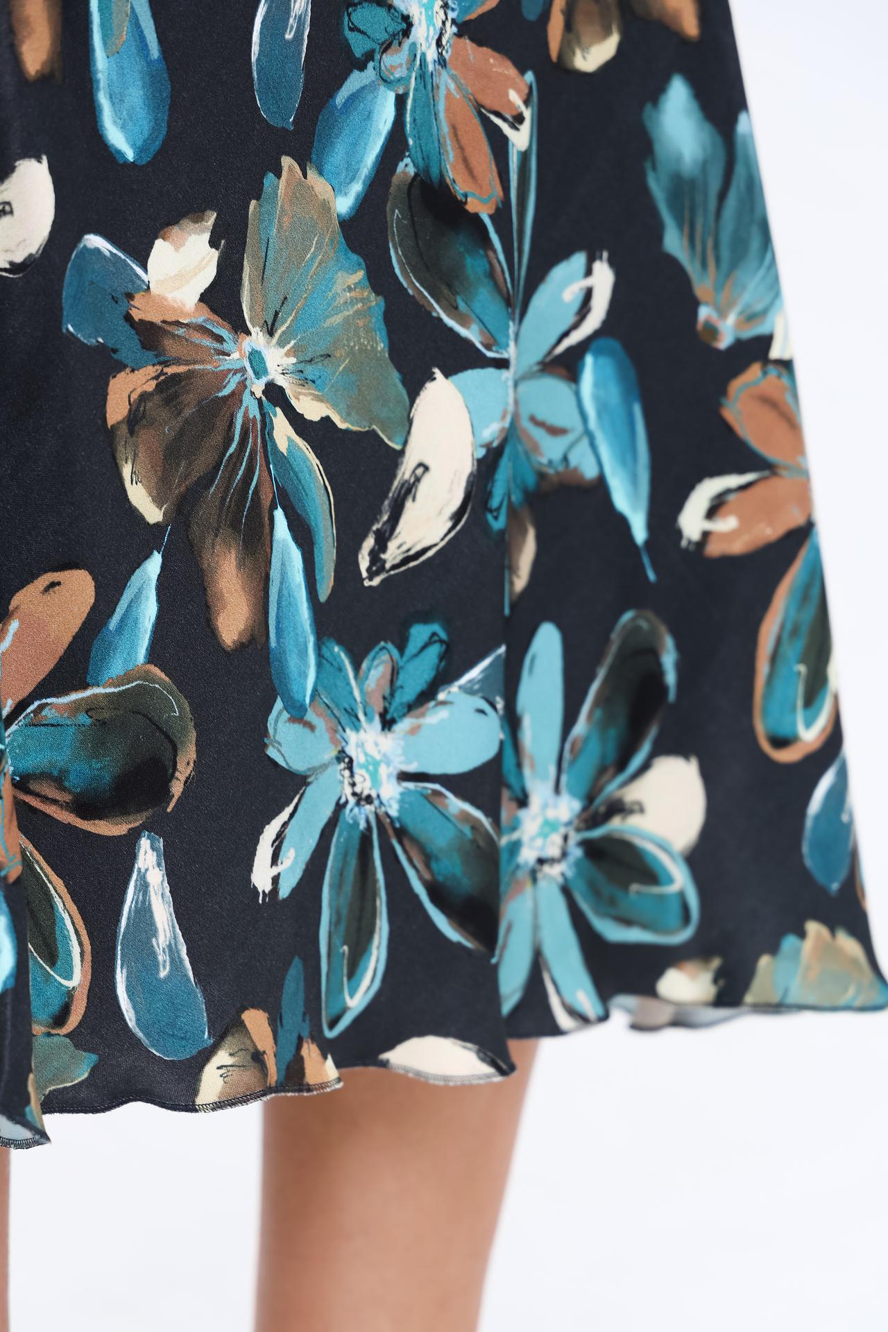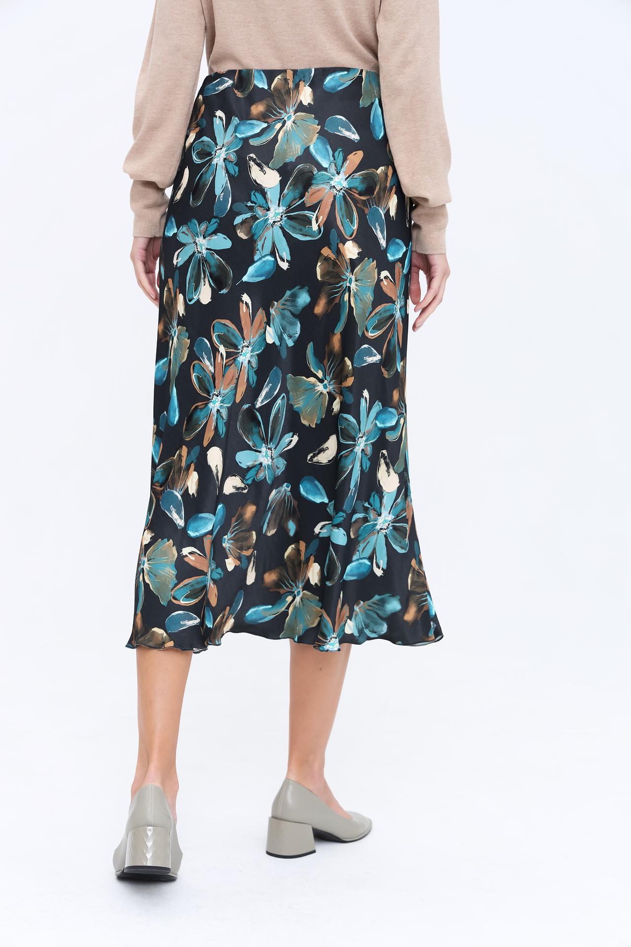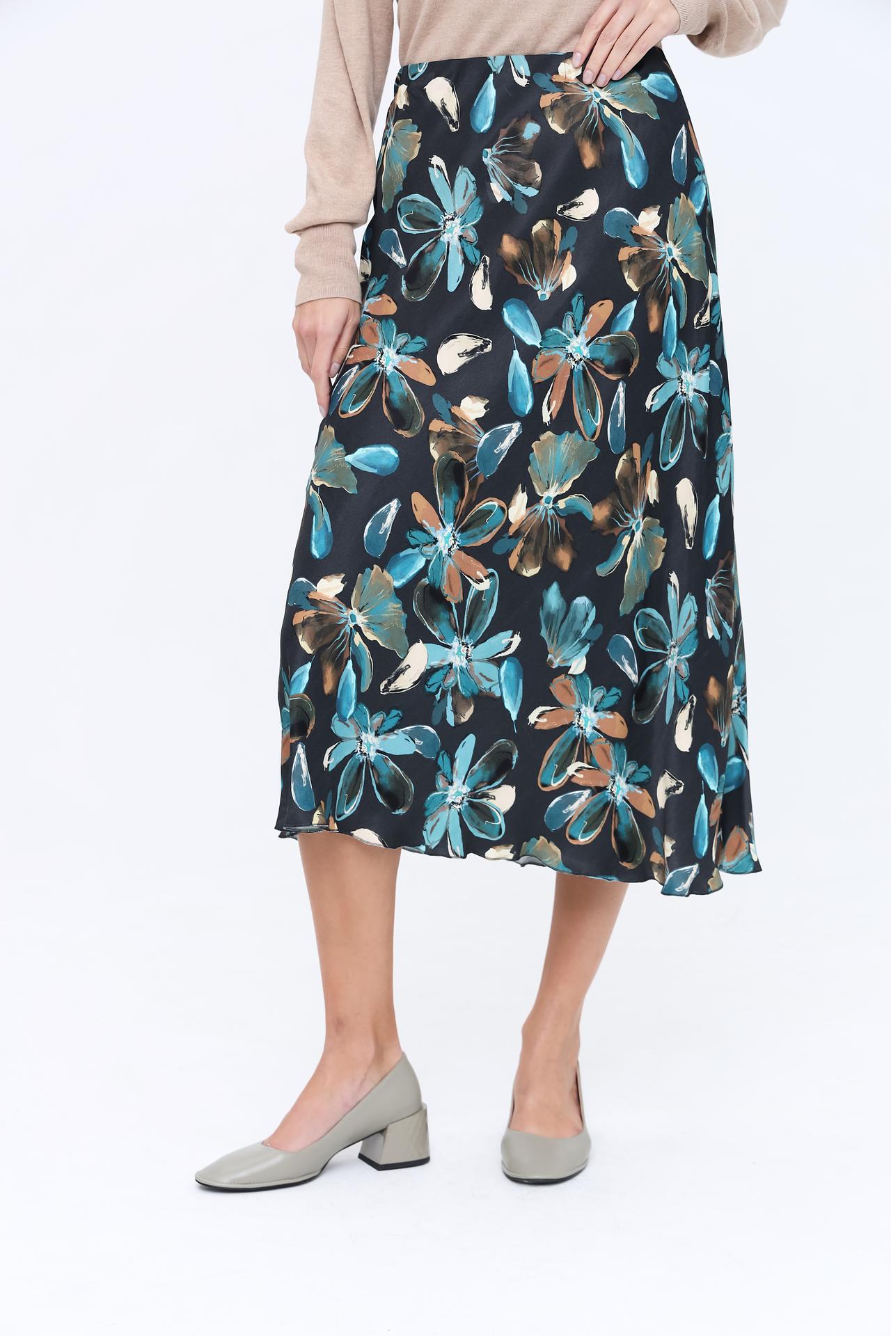 - Стильный дизайн: Цветочный принт на чёрном фоне придаёт юбке изысканность и универсальность. Рисунок гармонично вписывается в классический и современный стили.