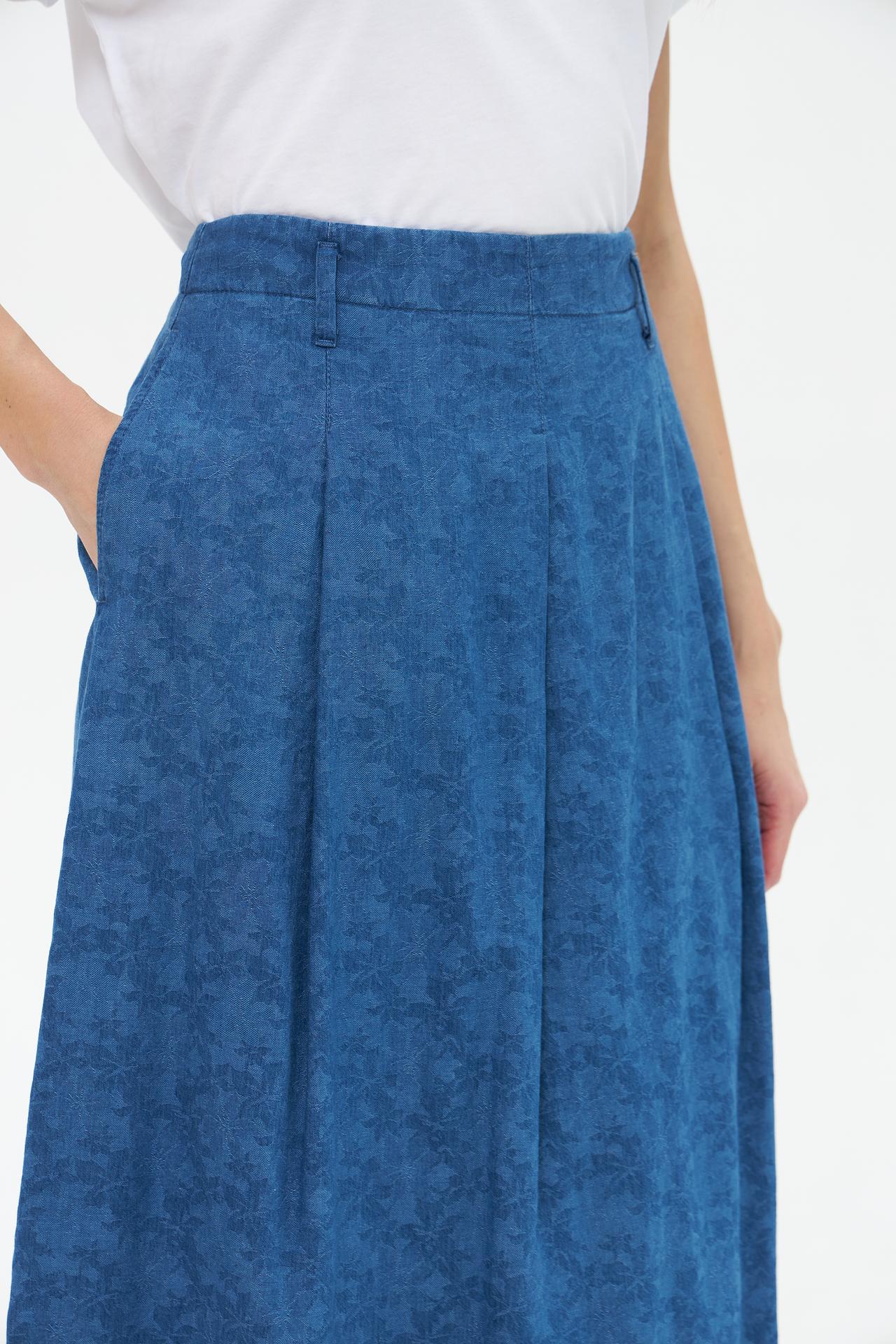 A-силуэт и деликатная плиссировка спереди создают женственный и летящий образ, выгодно подчеркивающий фигуру. Глубокий синий оттенок с едва заметным фактурным узором придает изделию особую изысканность, позволяя легко комбинировать юбку как с базовыми футболками, так и с элегантными блузами.