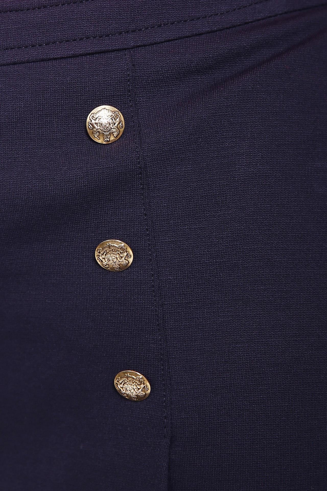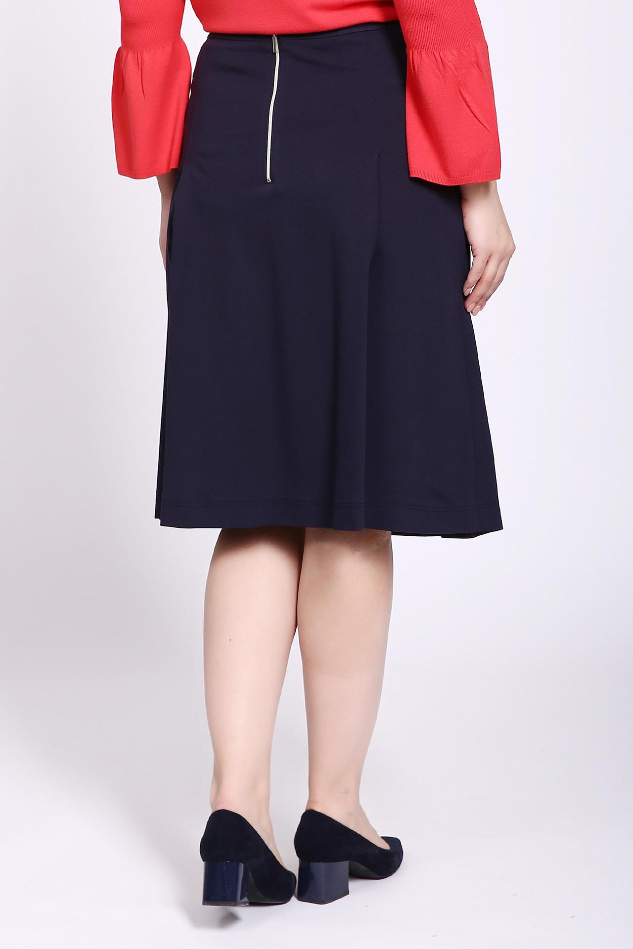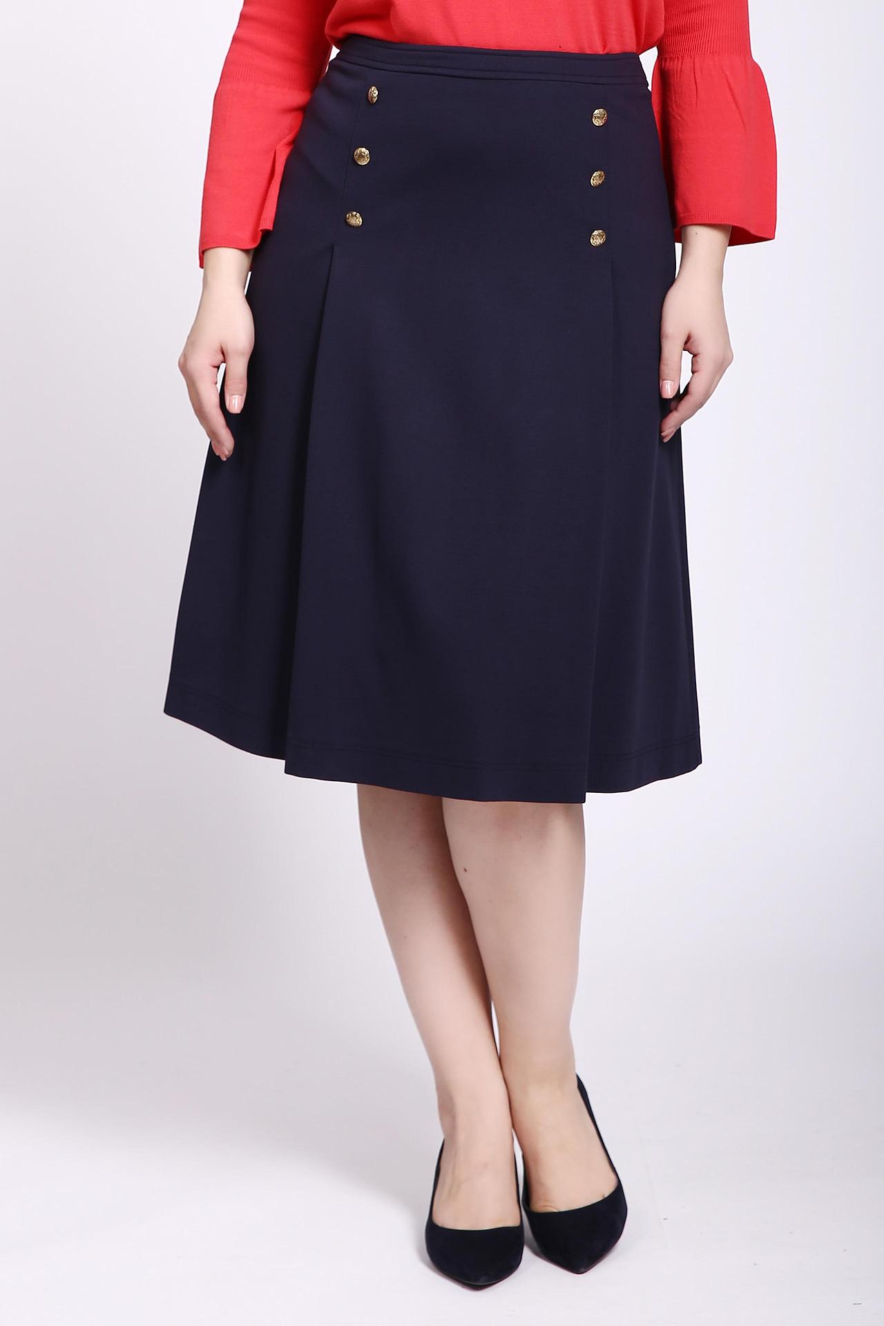Юбка синего цвета фирмы Eugen Klein. Ткань состоит из 5% эластана, 76% вискозы и 19% полиамида. Модель выполнена расклешенным фасоном. Изделие дополнено пришивным поясом, впереди складки украшены металлическими пуговицами, сзади складки. Такая модель подходит для комплектов для различных поводов.