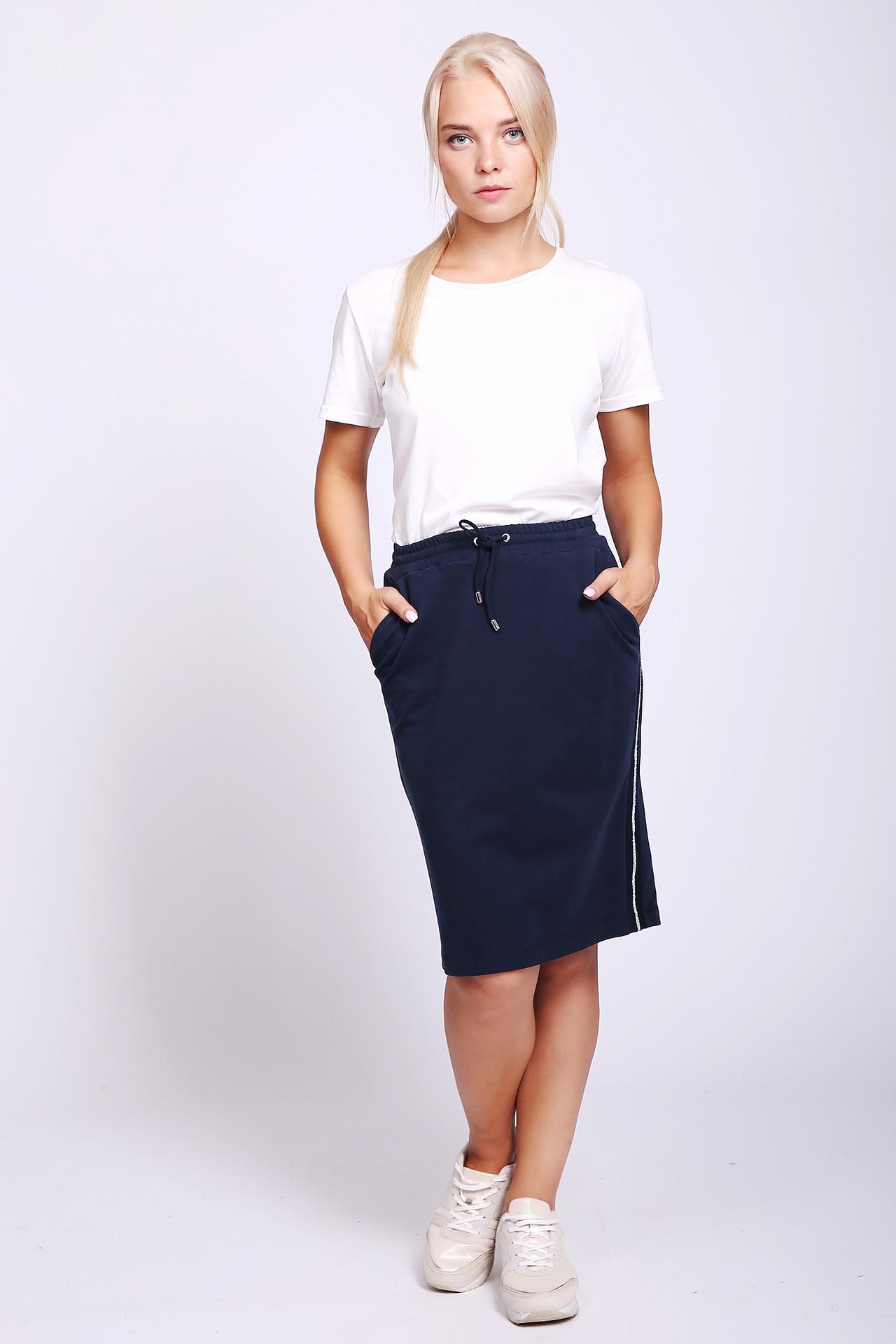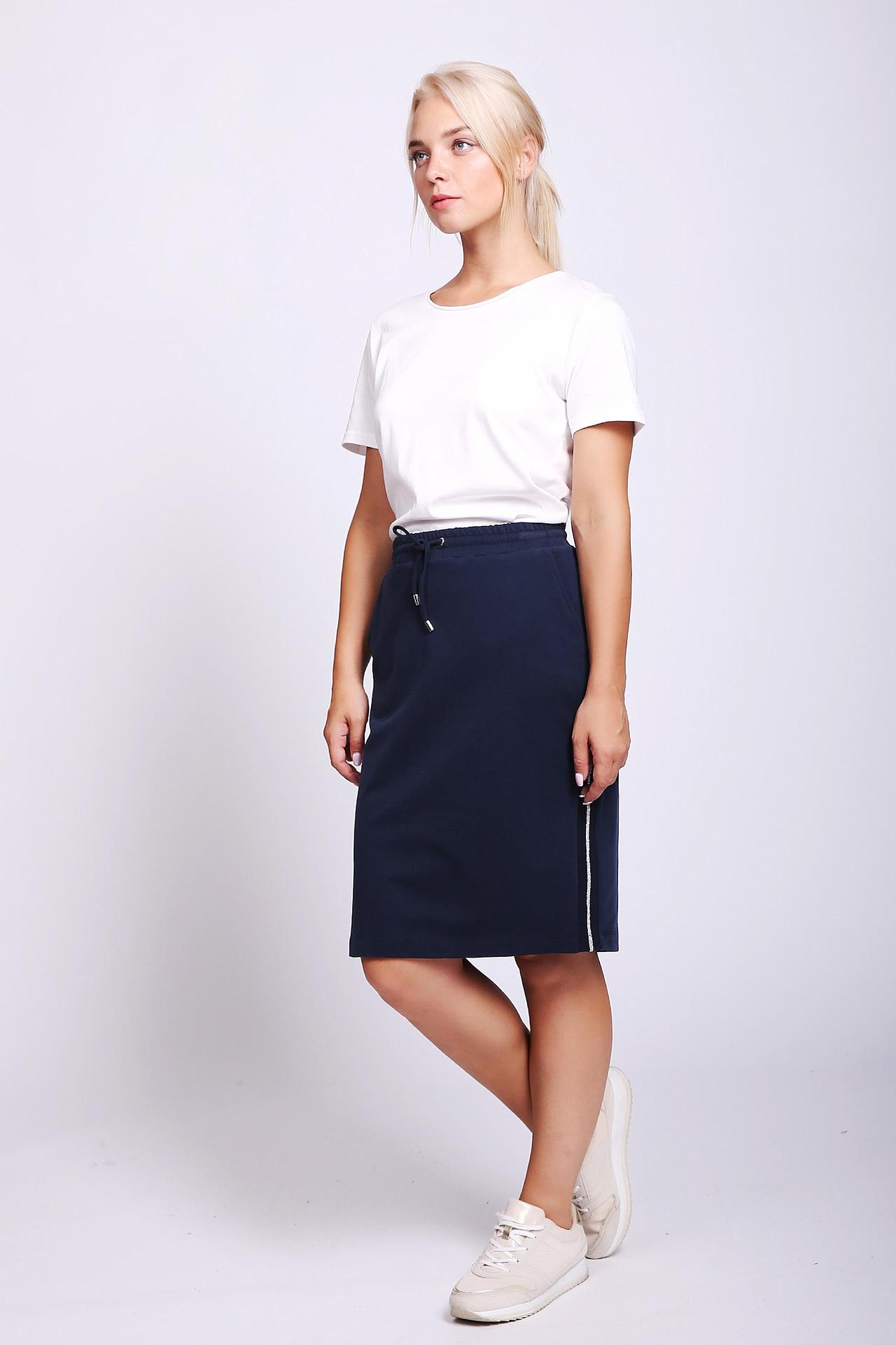 Юбка синего цвета фирмы Gerry Weber. Модель выполнена прямым фасоном. Изделие дополнено пришивным поясом с эластичной лентой и тесьмой, боковыми карманами. По боковым швам вшита тесьма белого цвета. Такая модель подходит для отдыха. Гармонировать может различными блузами и футболками.