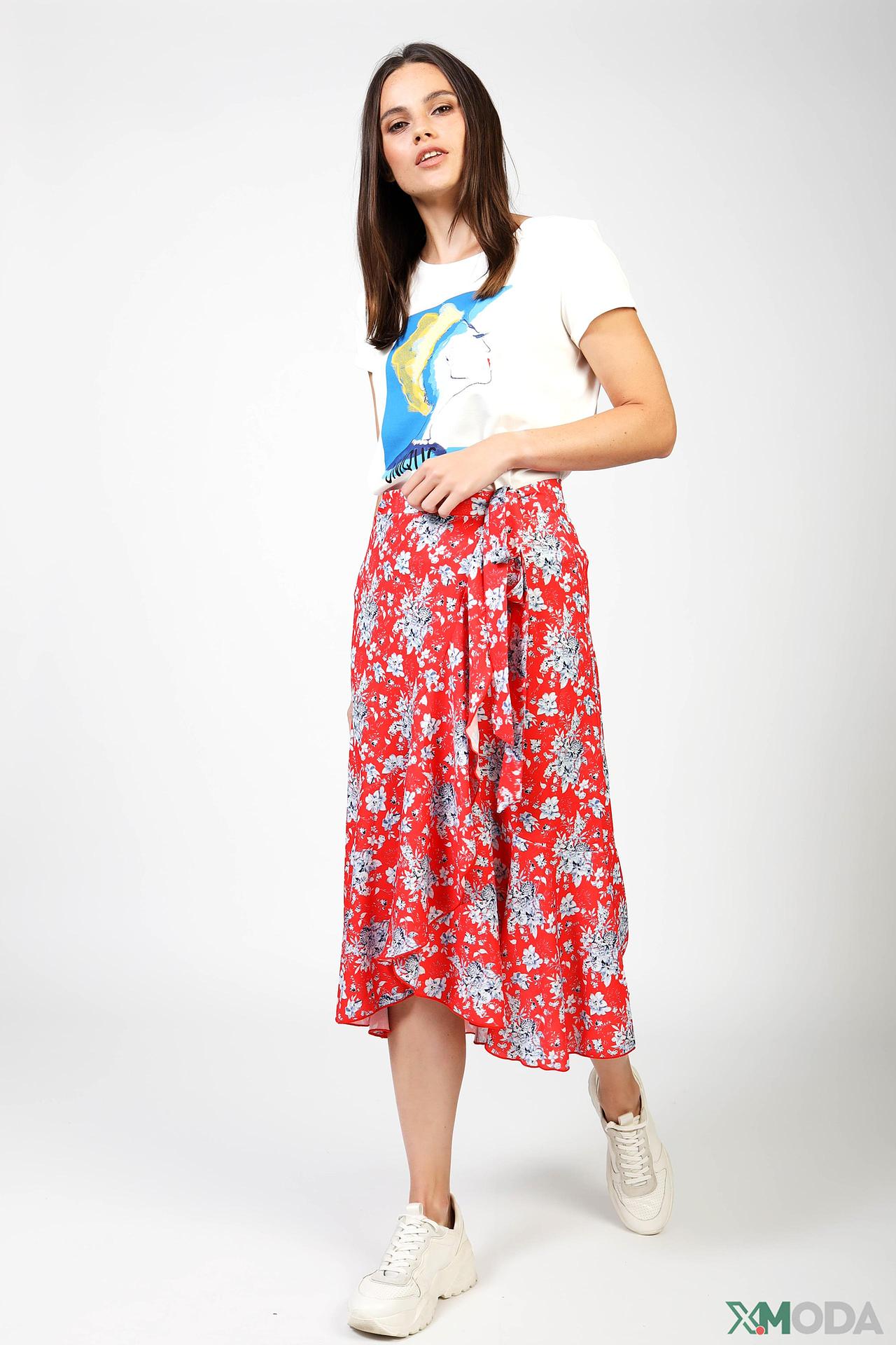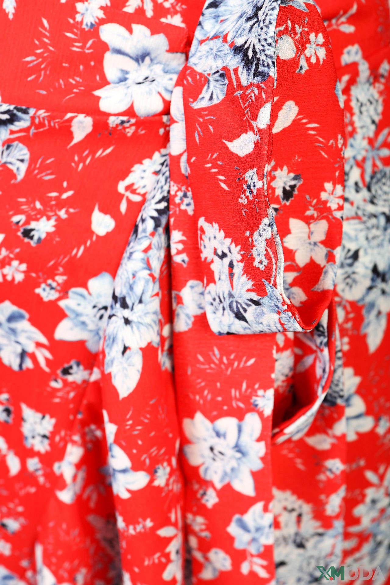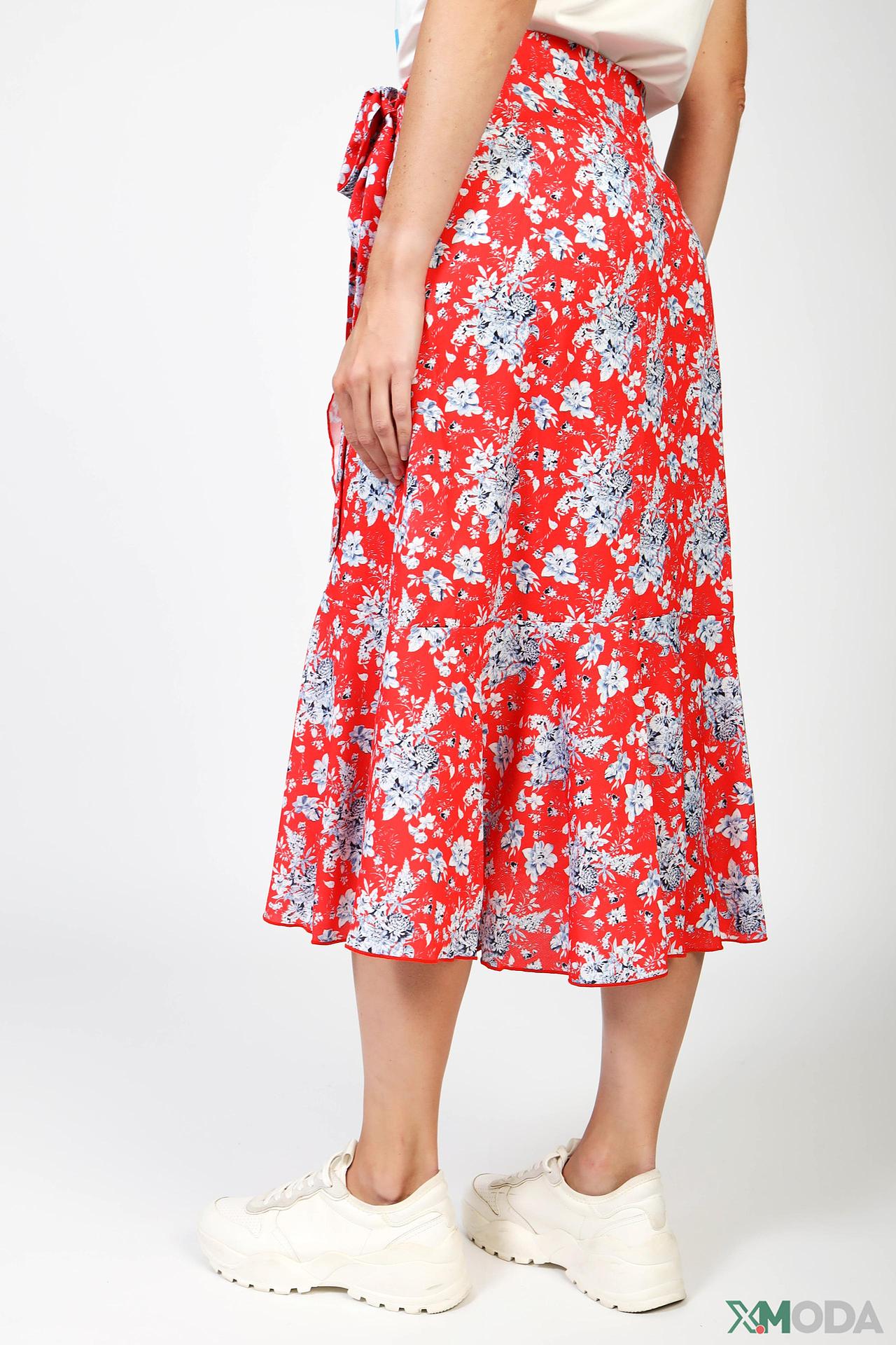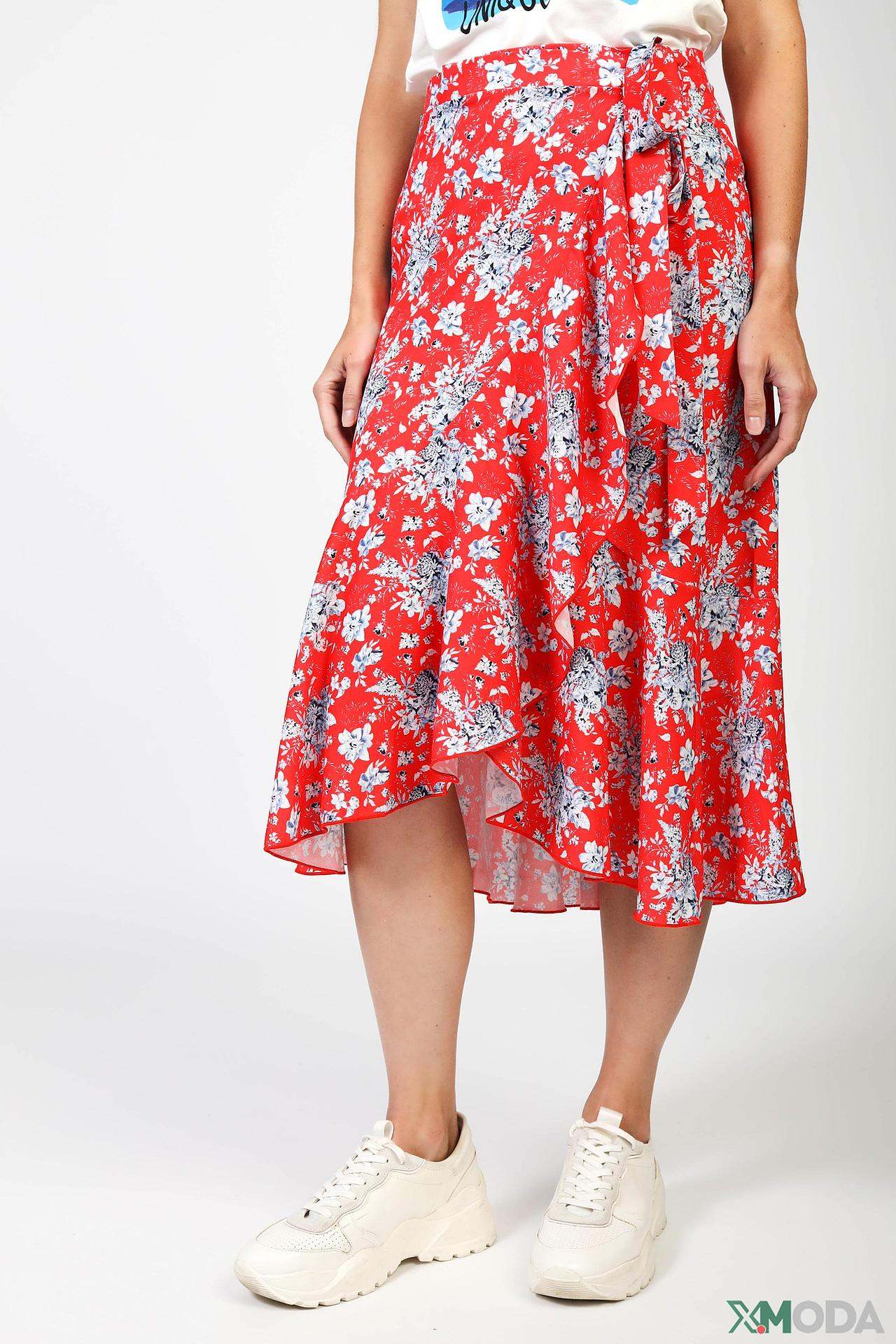 Дизайн: Юбка с запахом дополнена асимметричными воланами по низу, которые придают изделию динамичность и игривость. Яркий цветочный принт на красном фоне подчеркивает летнее настроение.