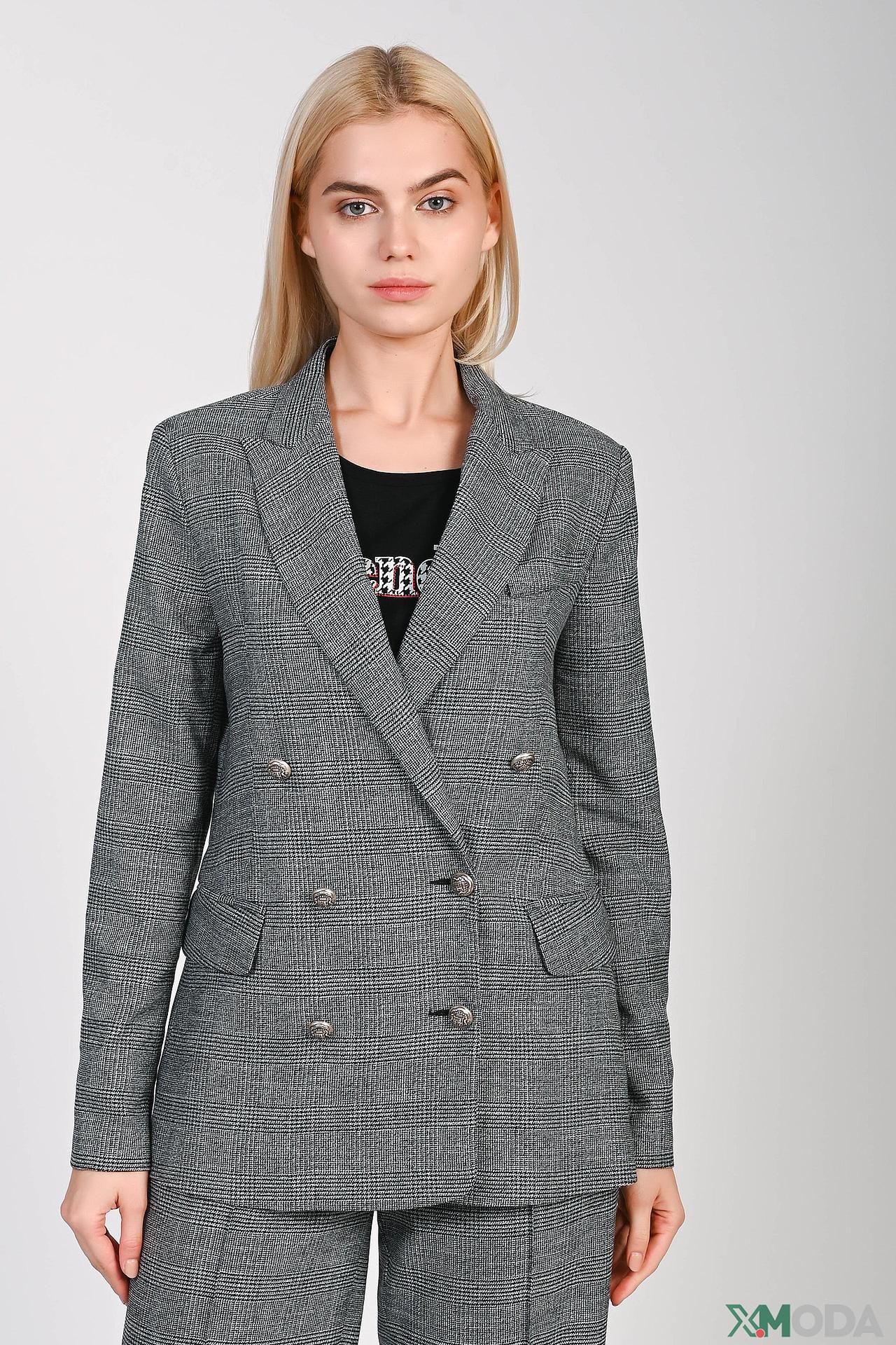 - Принт: Тонкая клетка в серо-черной гамме придает жакету сдержанный и элегантный вид, легко вписываясь в любой гардероб.