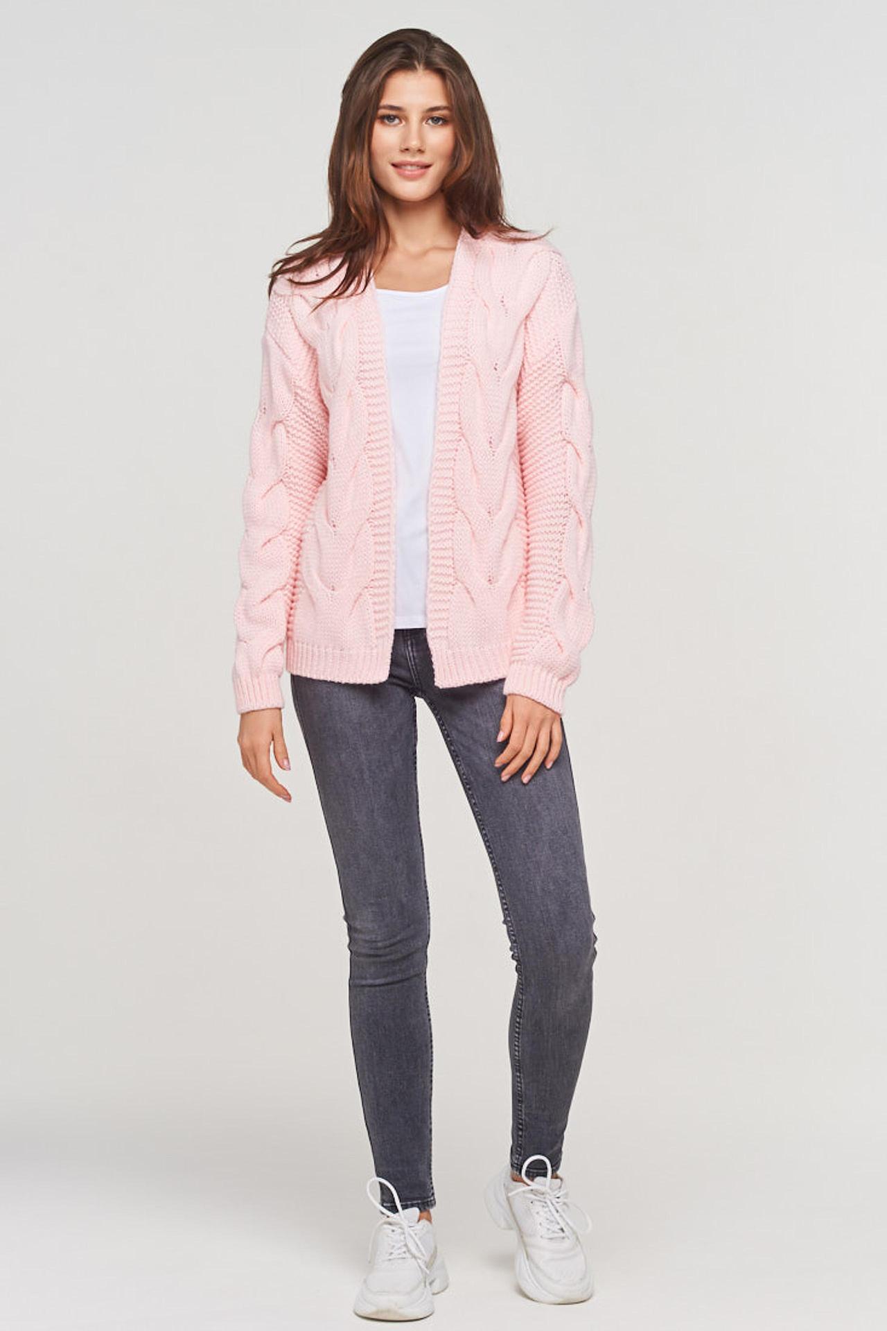 Жакет выполнен в нежном розовом цвете, который придаст образу свежесть и женственность. Оригинальная вязка косами на рукавах и по полочкам добавляет изысканности и делает жакет особенно привлекательным.