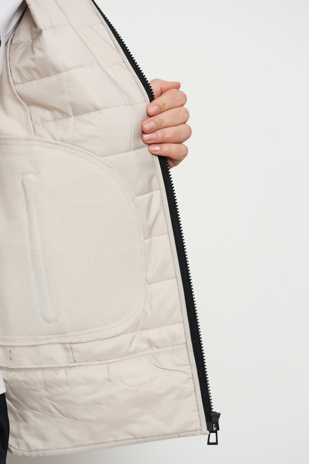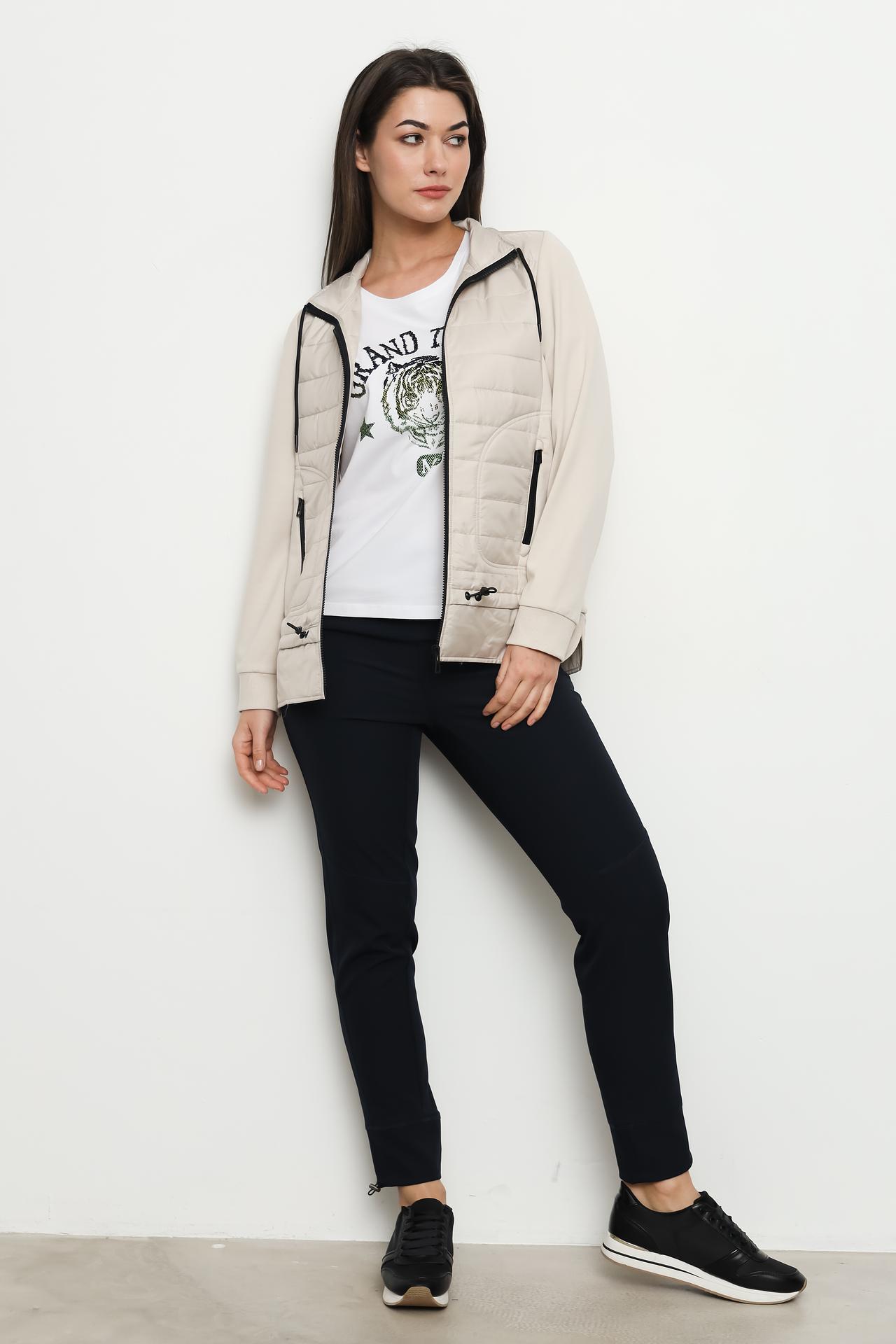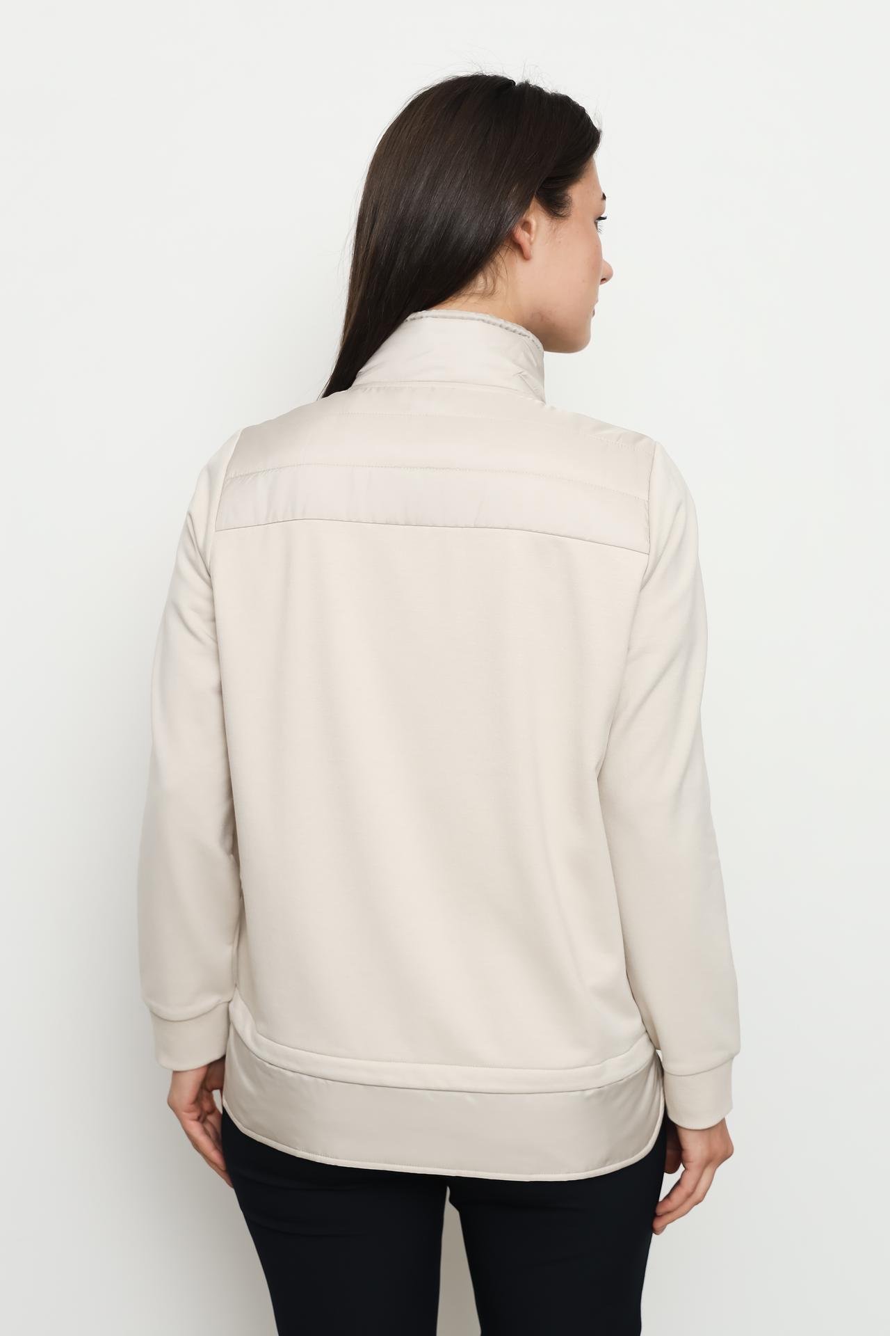 - Комбинированный дизайн: Передняя часть жакета выполнена из стеганого материала, а рукава и спинка – из гладкого трикотажа, что создает интересный визуальный эффект и обеспечивает свободу движений.