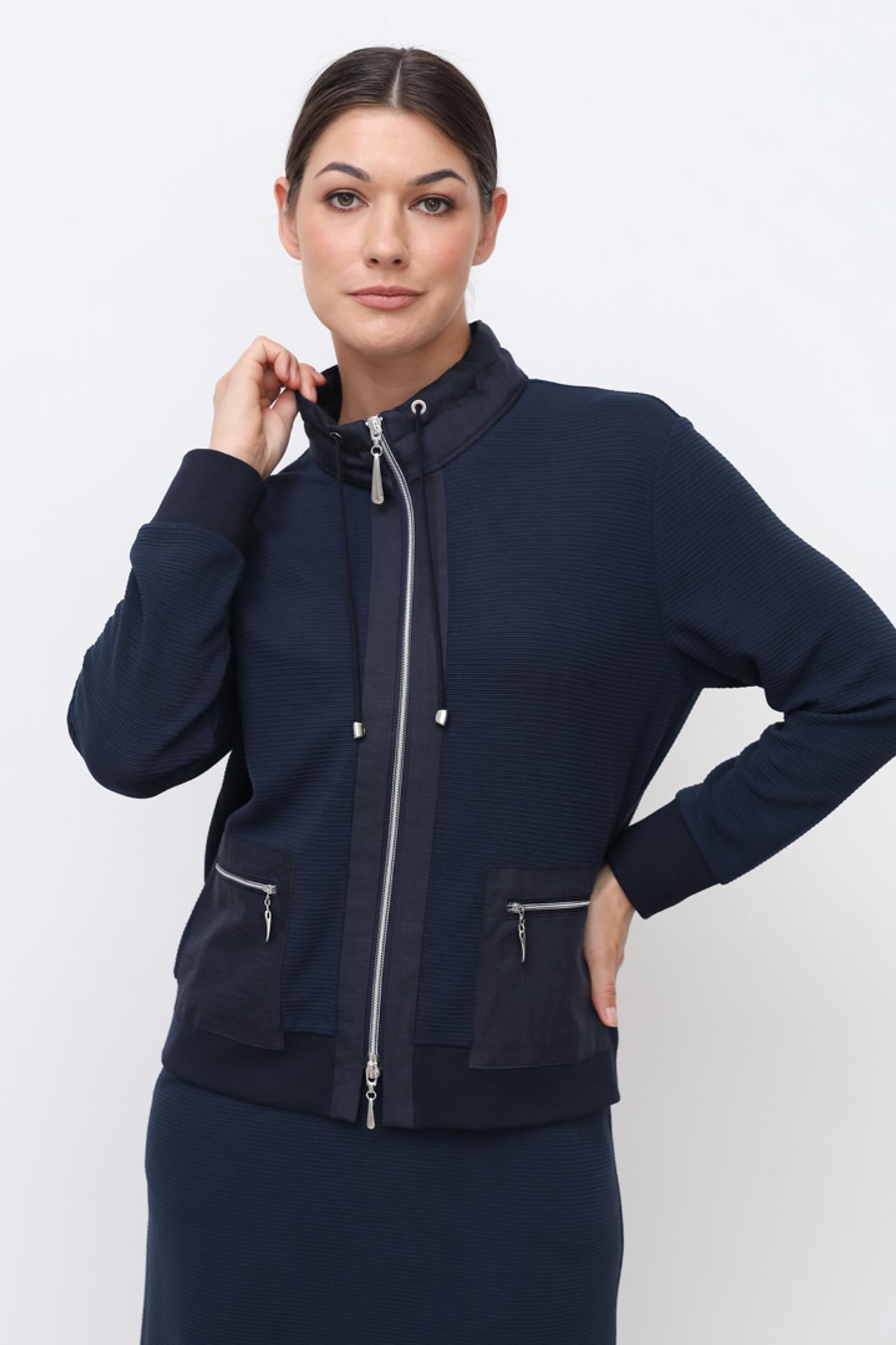 - Практичный дизайн: Модель оснащена удобной центральной молнией и двумя накладными карманами на молниях, что придает жакету функциональность и современный вид. Декоративные элементы на бегунках молний добавляют изысканности.