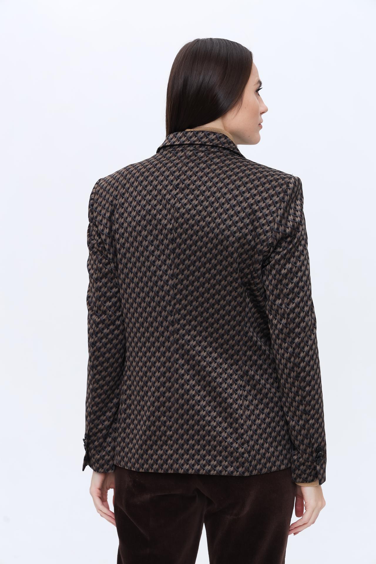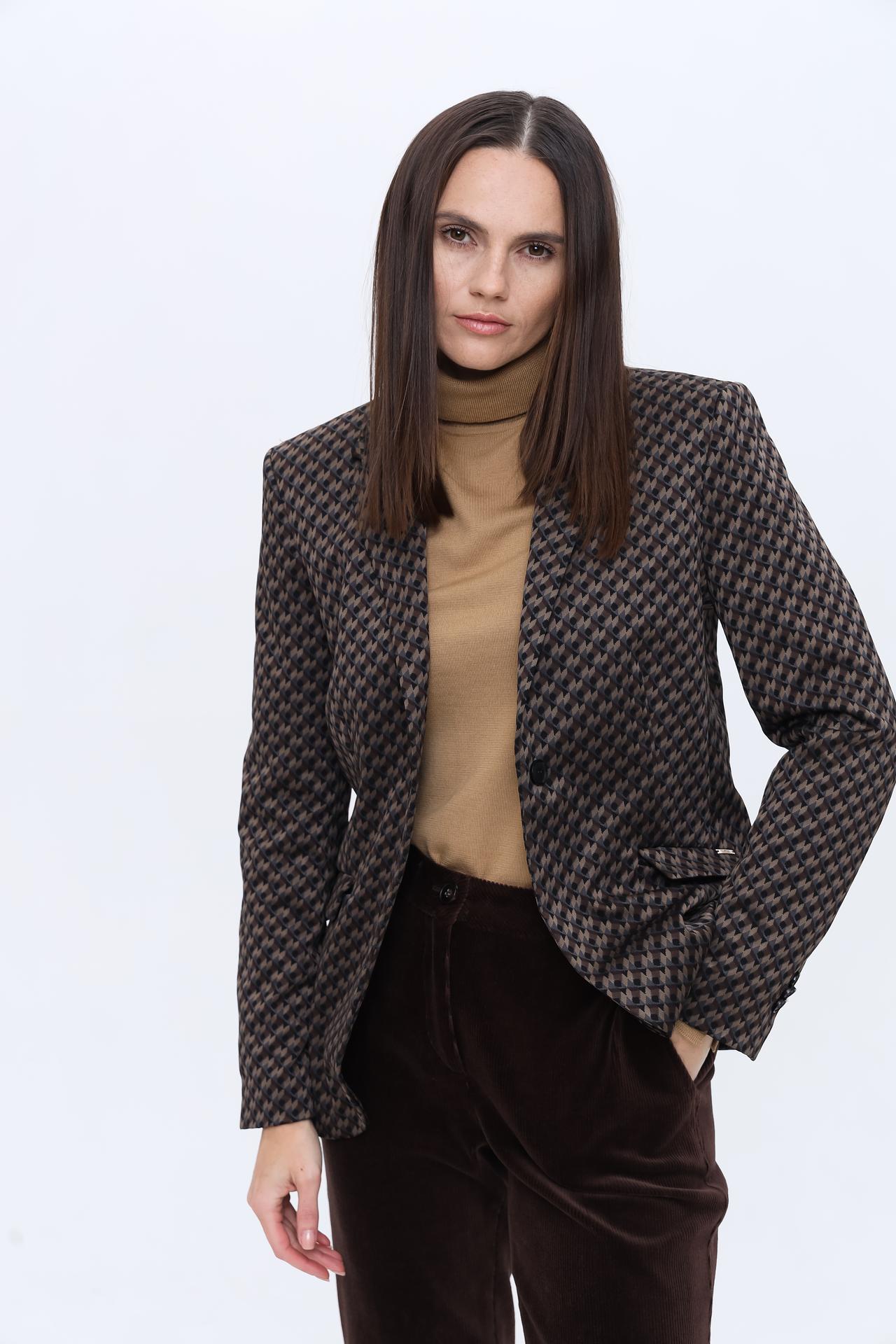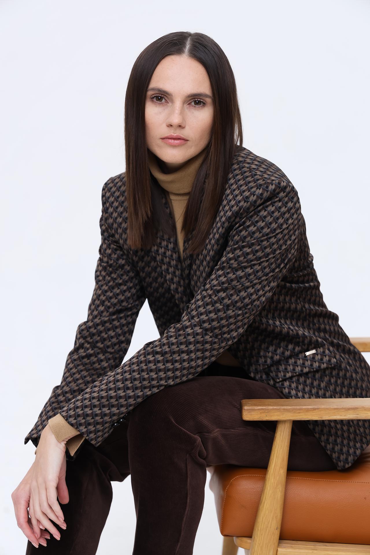 - Универсальный дизайн: Классический жакет с утонченным геометрическим узором легко сочетается как с деловыми брюками и юбками, так и с джинсами, позволяя создавать разнообразные ансамбли для любой ситуации. Это идеальное решение для офиса и элегантного повседневного стиля.