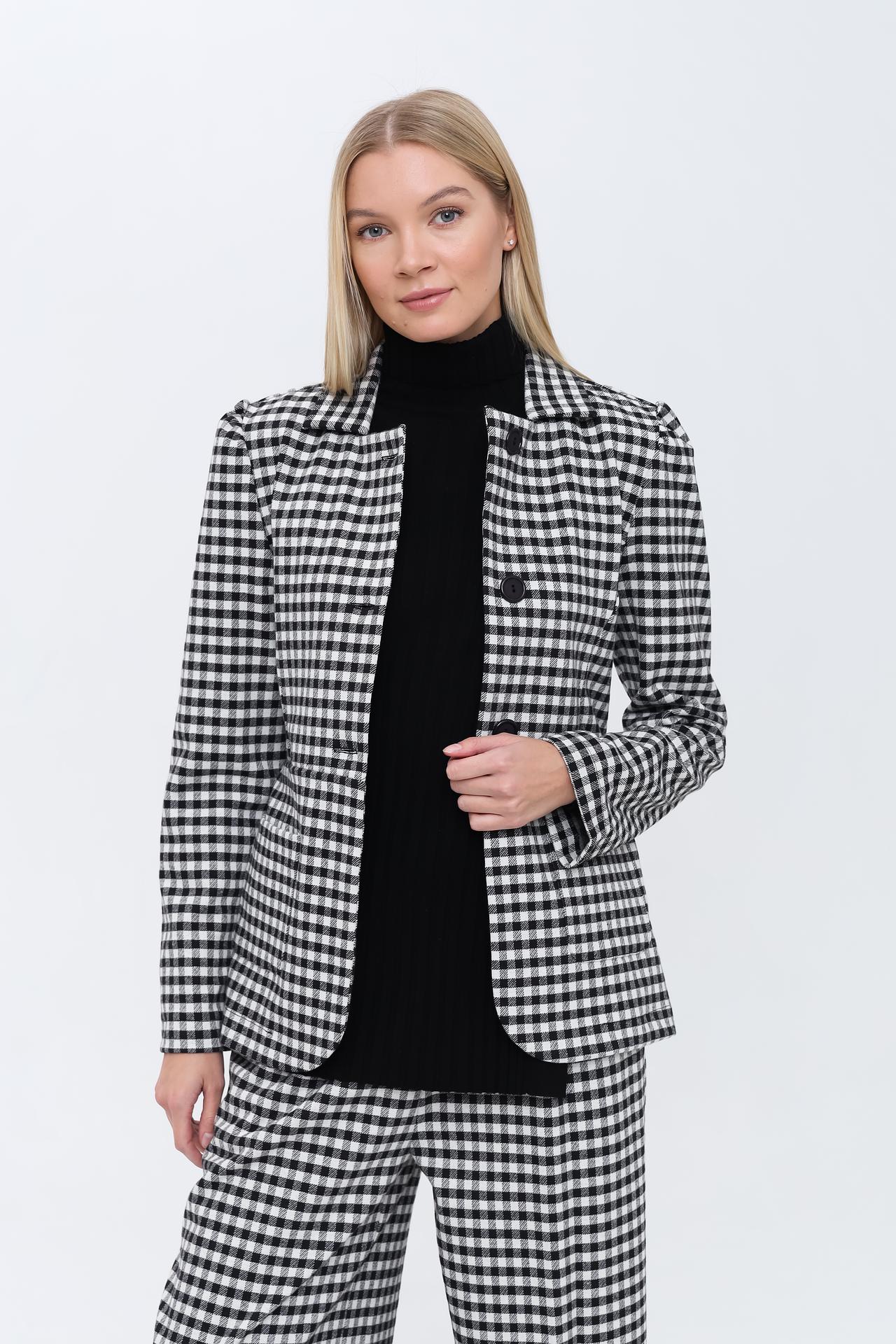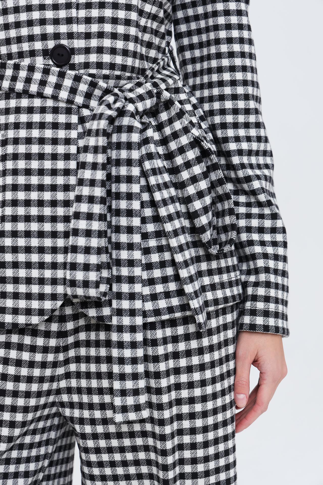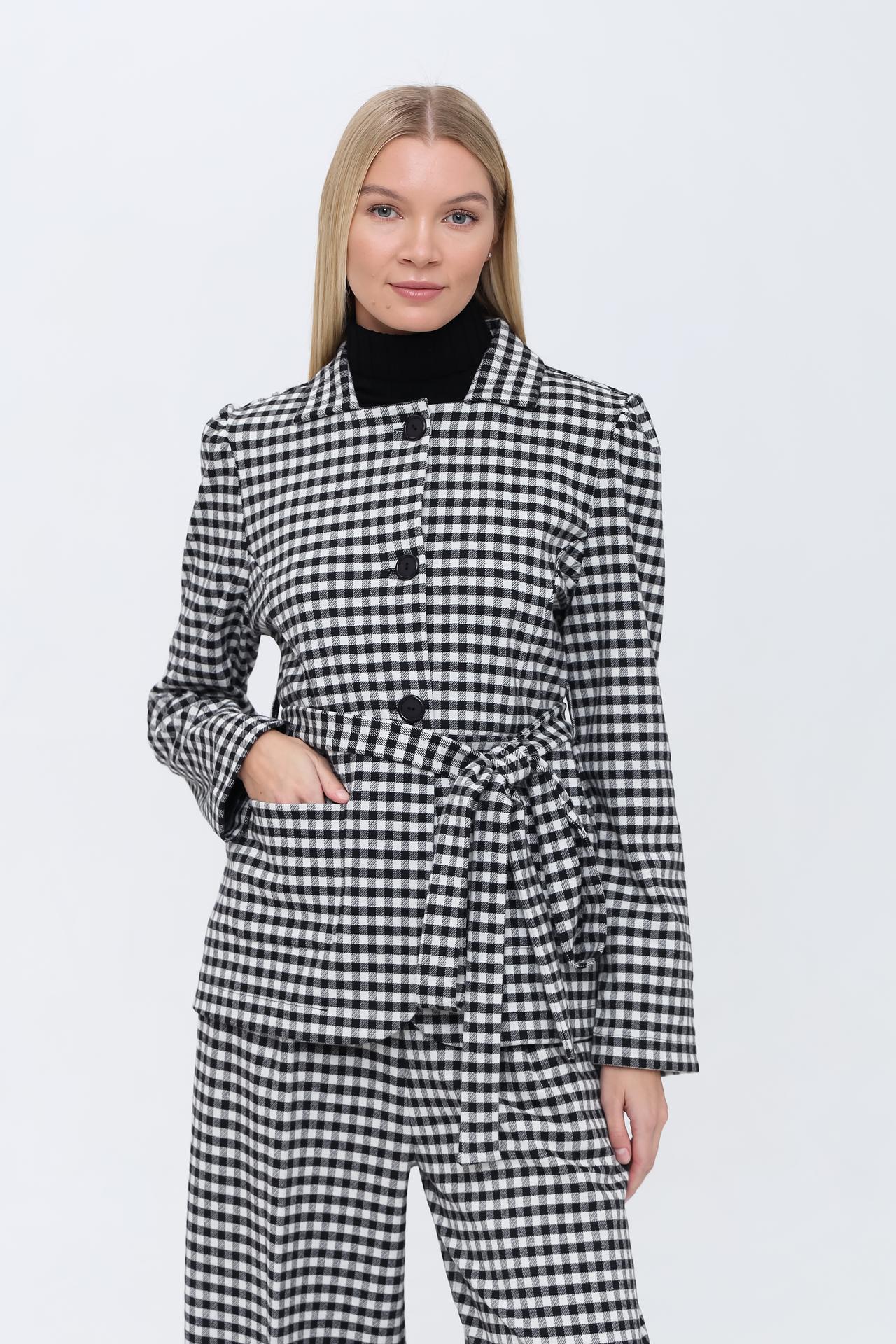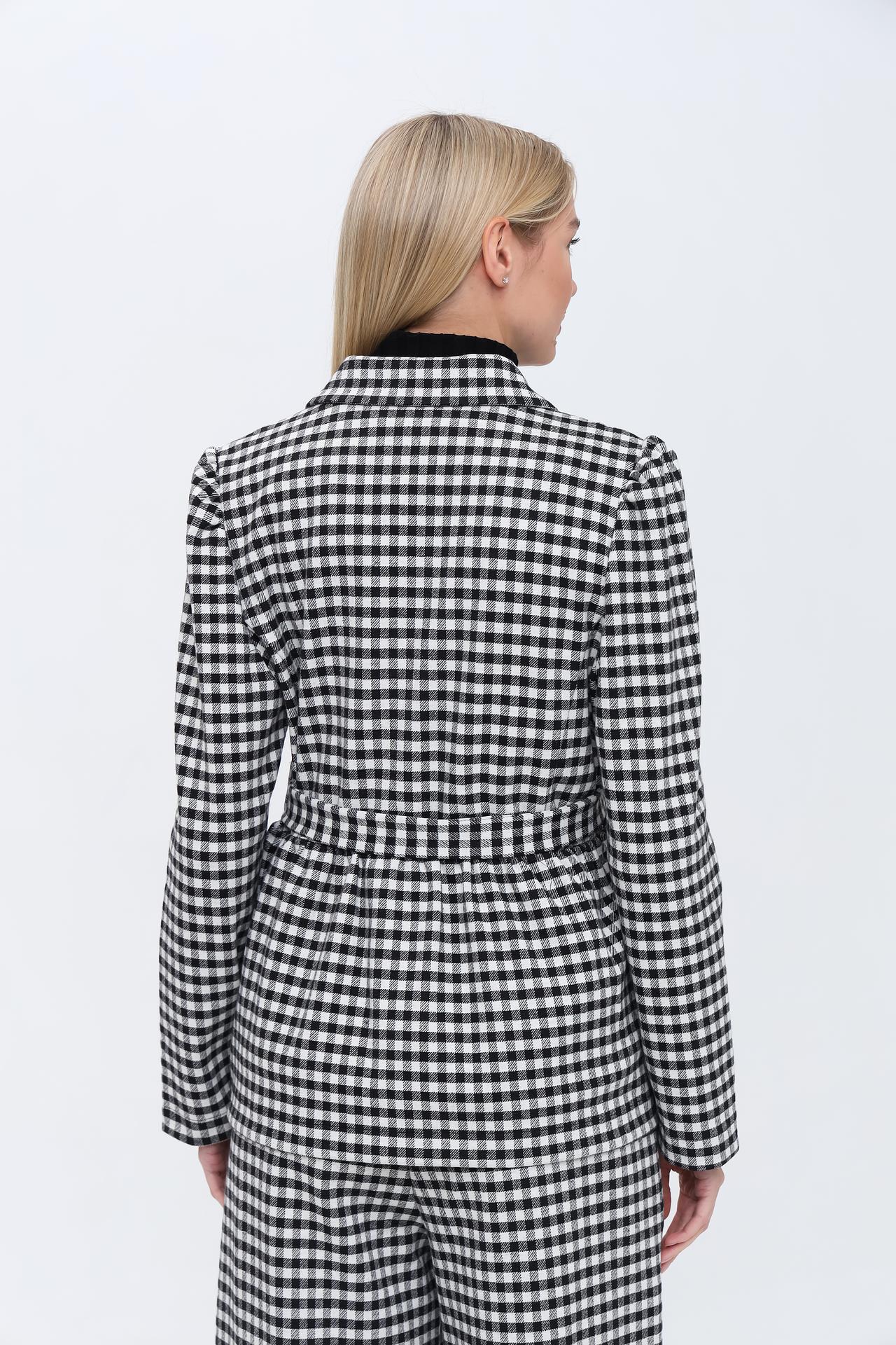 Состав ткани: 1% эластан, 40% хлопок, 59% полиэстер, что обеспечивает оптимальное сочетание прочности, мягкости и эластичности. Жакет отлично держит форму и приятен к телу. Классический крой и актуальный принт в клетку делают эту модель универсальной и модной. Пояс подчеркивает талию и создает женственный силуэт.
