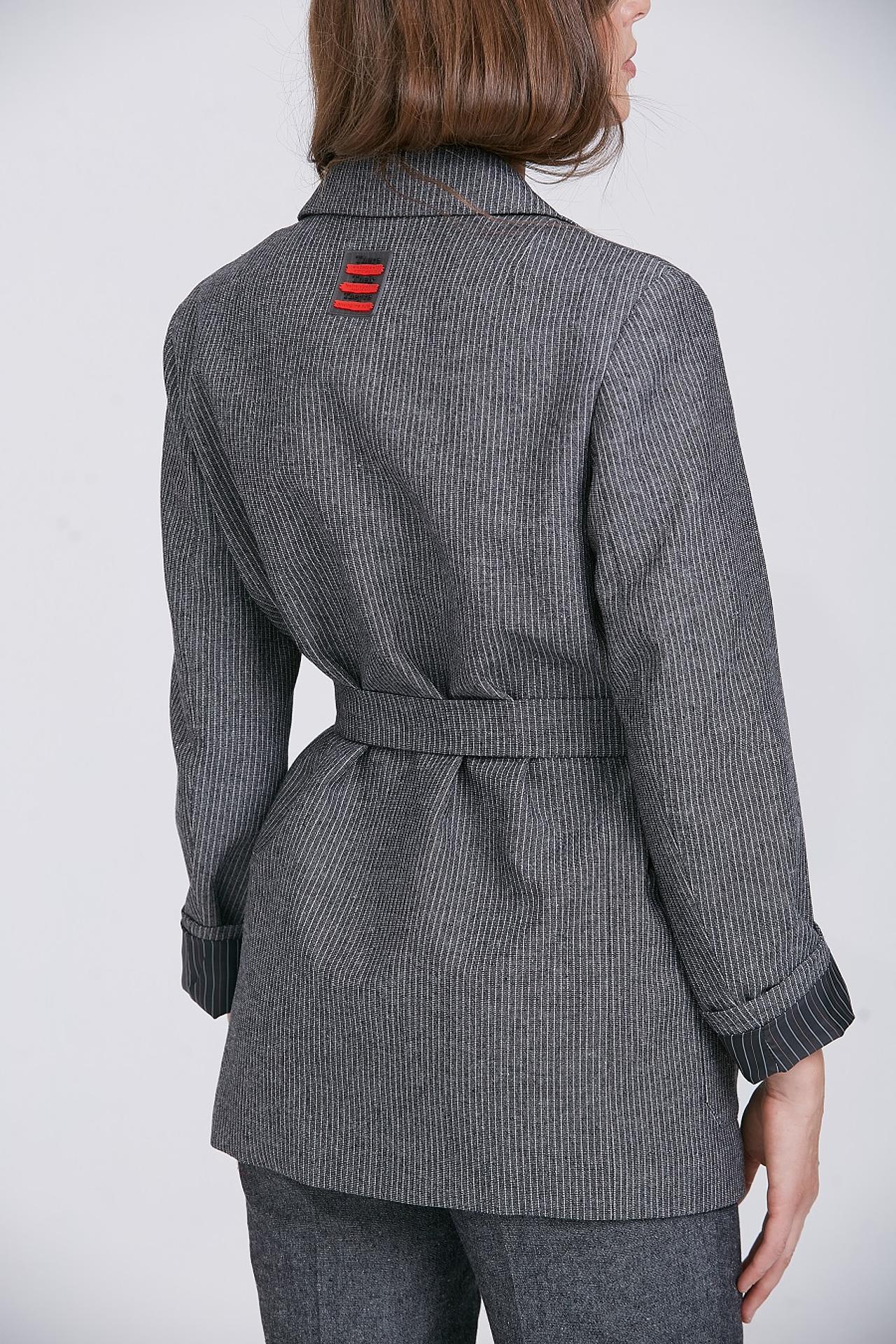 Изделие сшито из высококачественной ткани, содержащей 60% хлопка и 15% льна, что обеспечивает комфорт и воздухопроницаемость, а добавление 21% полиэстера и 4% эластана гарантирует износостойкость и идеальную посадку. Классическая тонкая полоска и оригинальные акценты в виде красной строчки на лацканах и карманах добавляют изысканности. Отложной воротник и накладные карманы с клапанами подчеркивают функциональность и стиль.