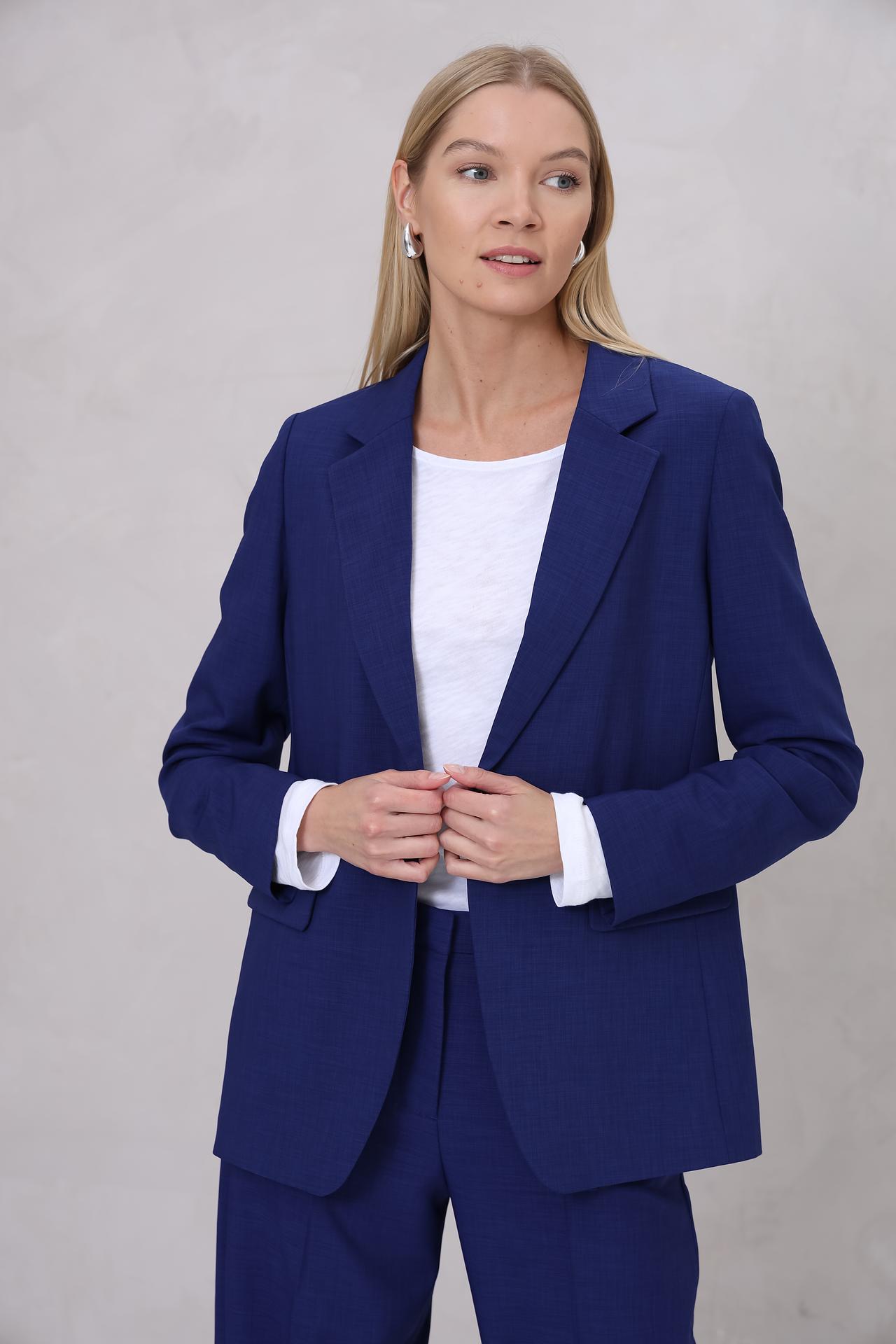 - Цвет: Насыщенный синий цвет добавляет глубины и универсальности, позволяя легко комбинировать жакет с различными оттенками и элементами гардероба.