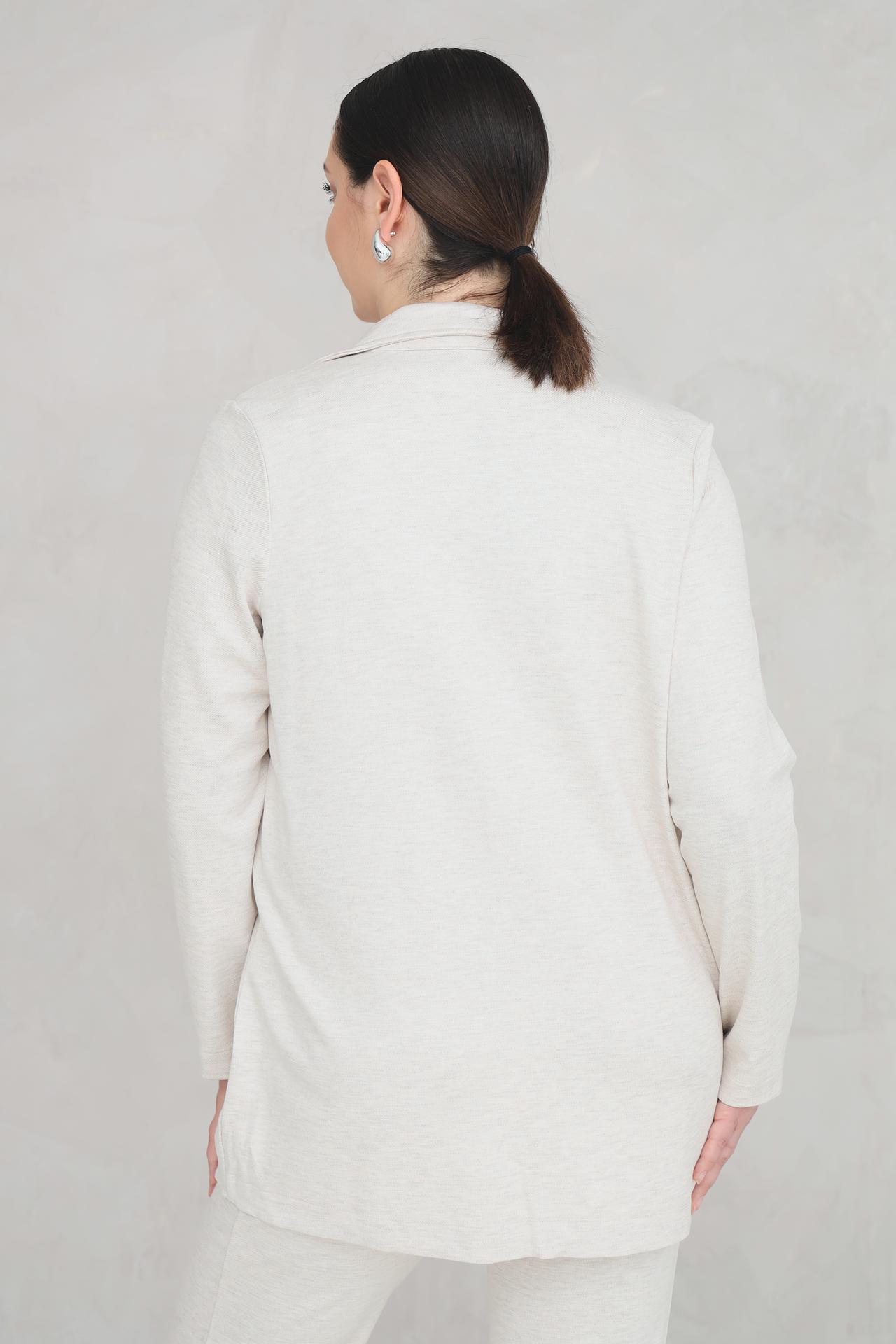 - Комфортная посадка: Благодаря эластану в составе, жакет идеально садится по фигуре, не сковывая движений.