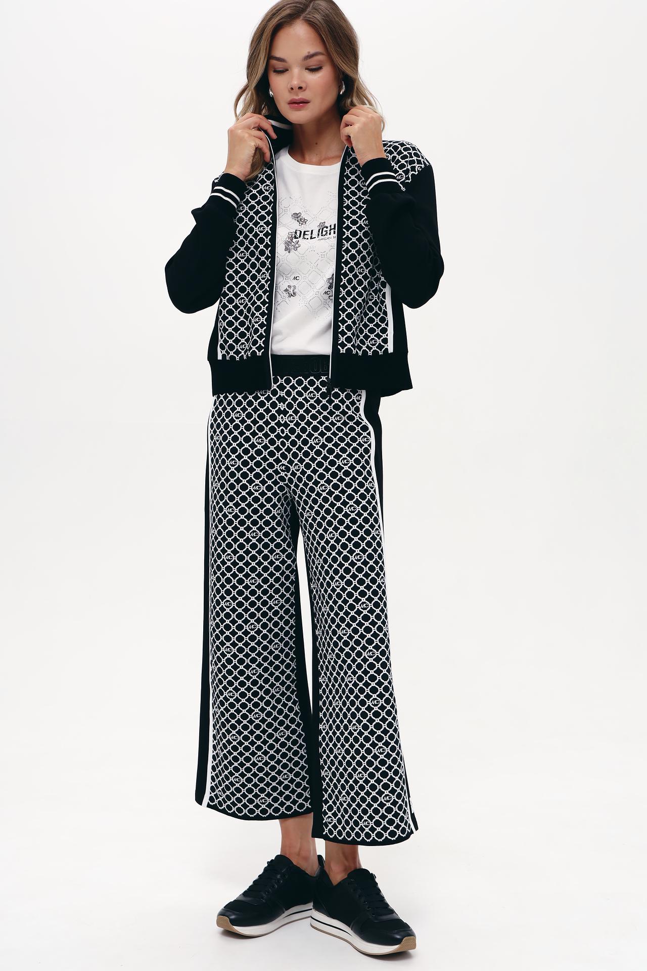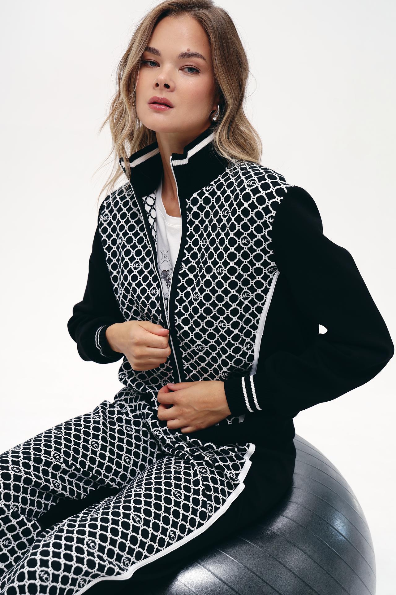 Элегантный жакет от Marc Cain — идеальный выбор для современных женщин, ценящих стиль и комфорт. Модель выполнена в классическом чёрном цвете и украшена оригинальным принтом-монограммой, который добавляет изысканности образу. Жакет застёгивается на молнию и имеет удобный воротник-стойку, дополненный контрастной полосой. Эластичные манжеты и нижняя часть изделия обеспечивают идеальную посадку.