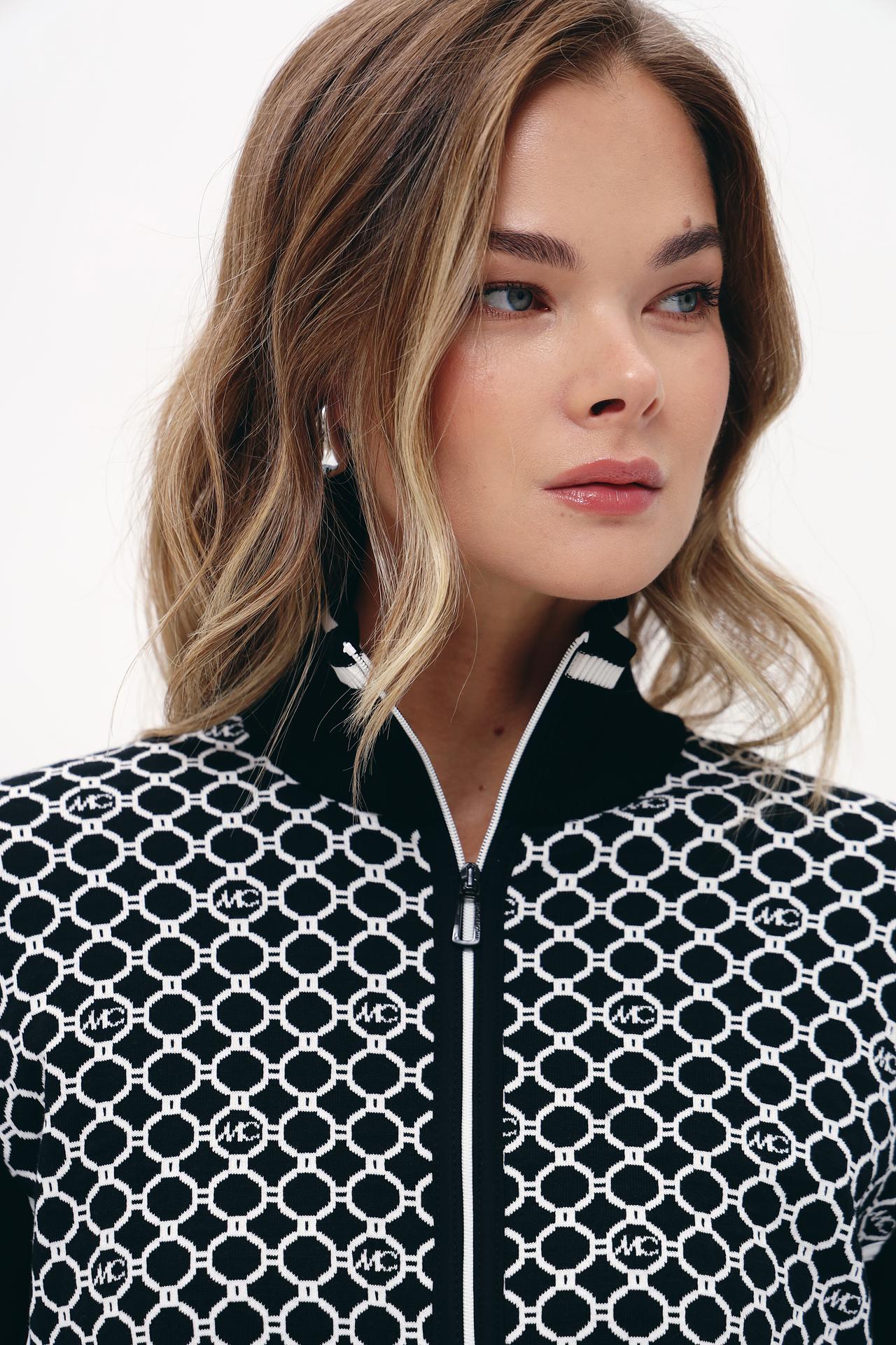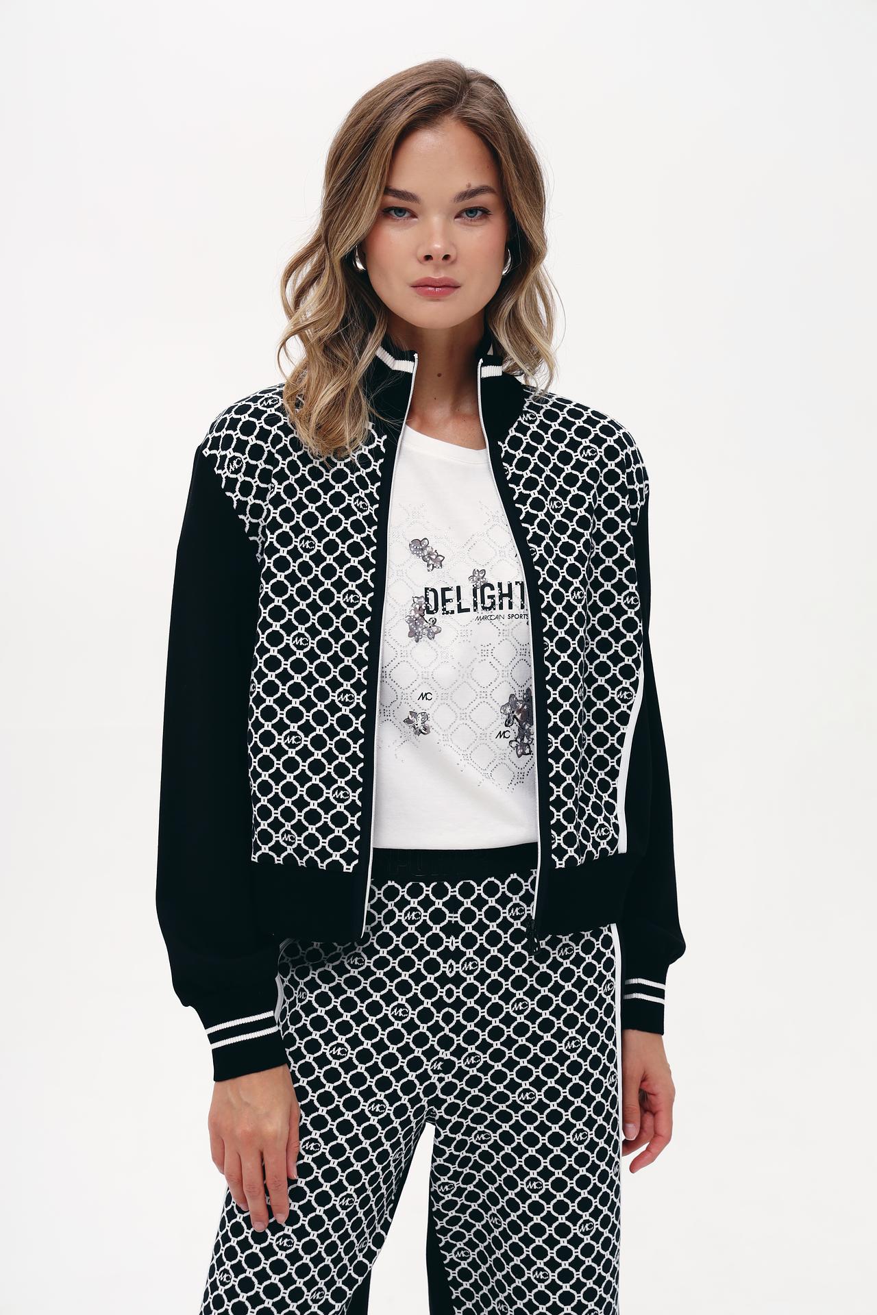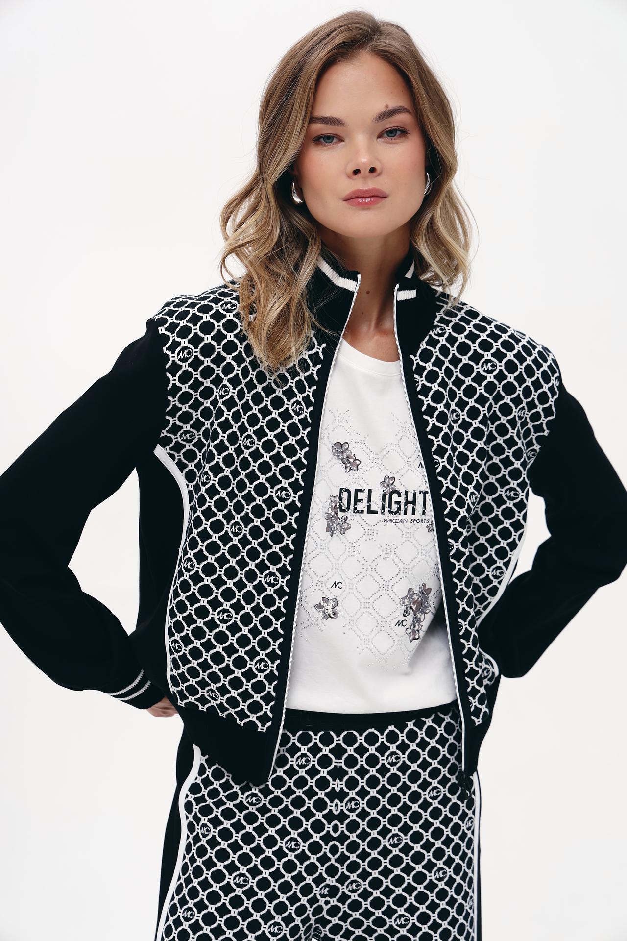 - Дизайн: Классический крой жакета-бомбера с современным принтом. Оригинальный узор в виде монограммы MC добавляет изделию эксклюзивности, а контрастные вставки по бокам и на манжетах подчеркивают динамичность стиля.