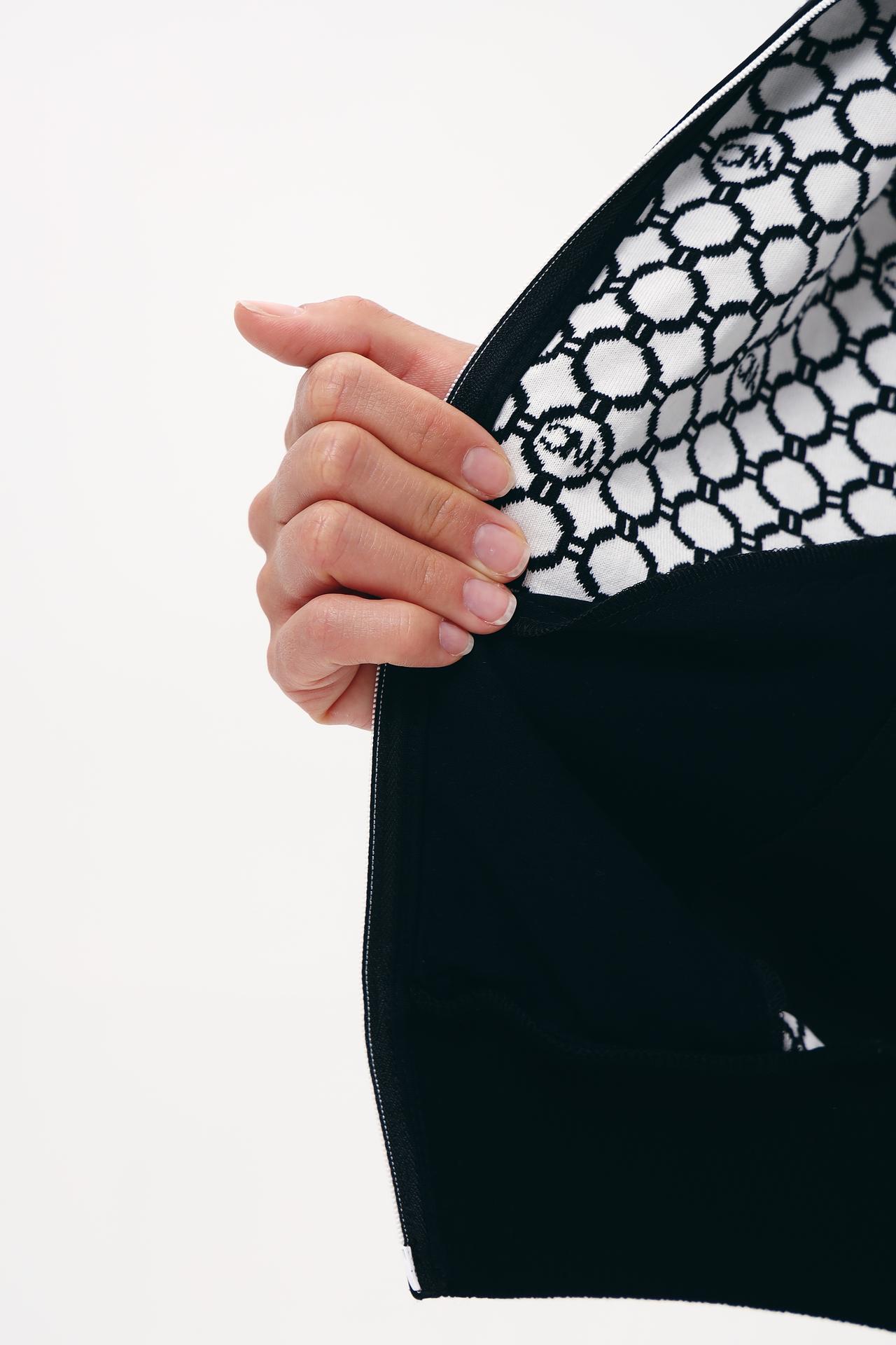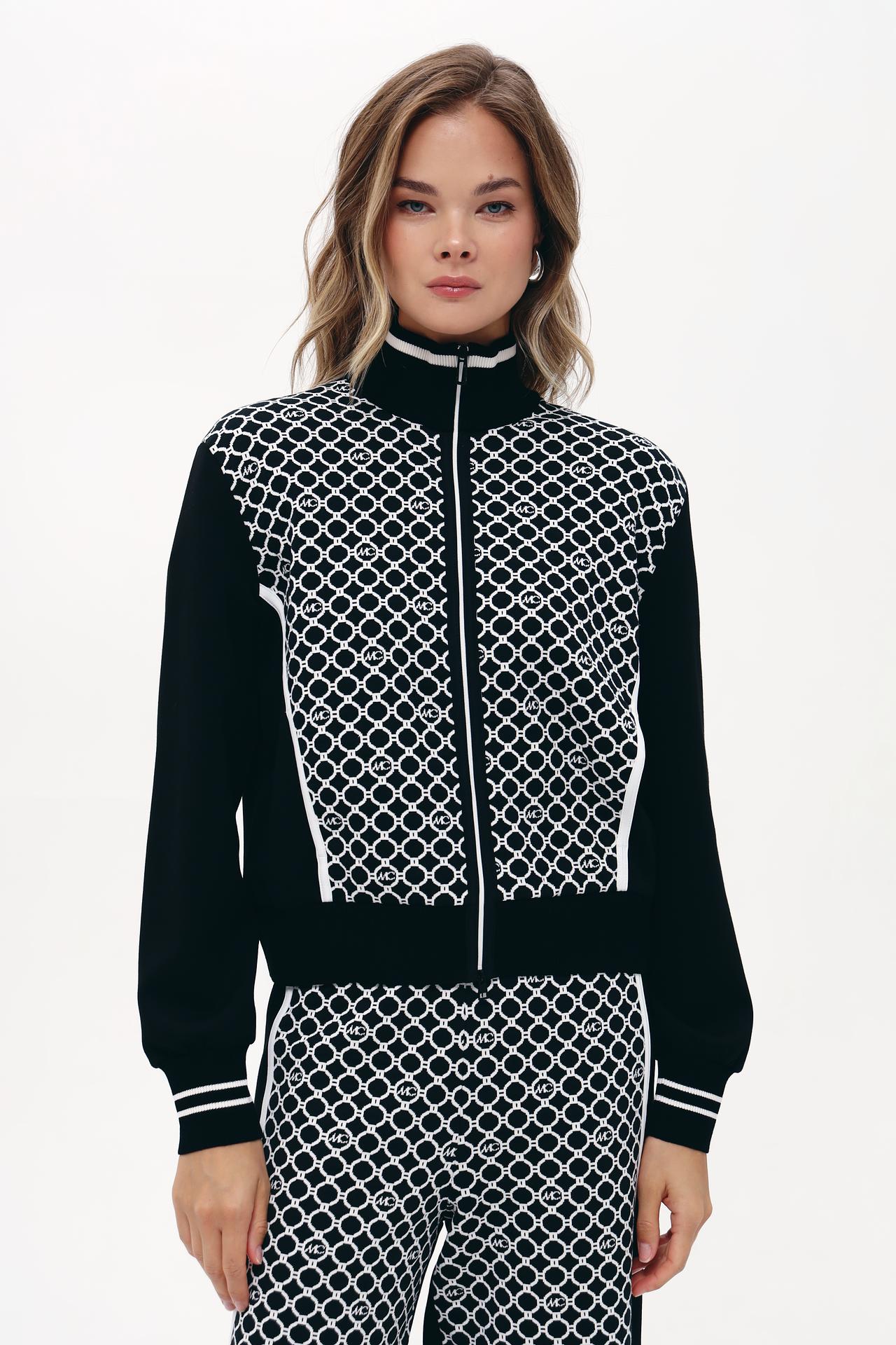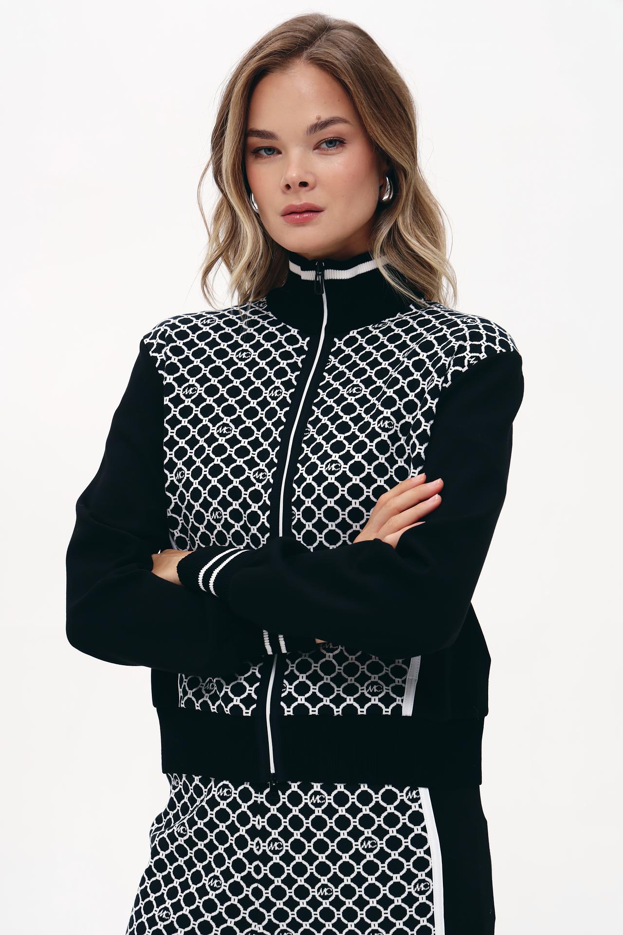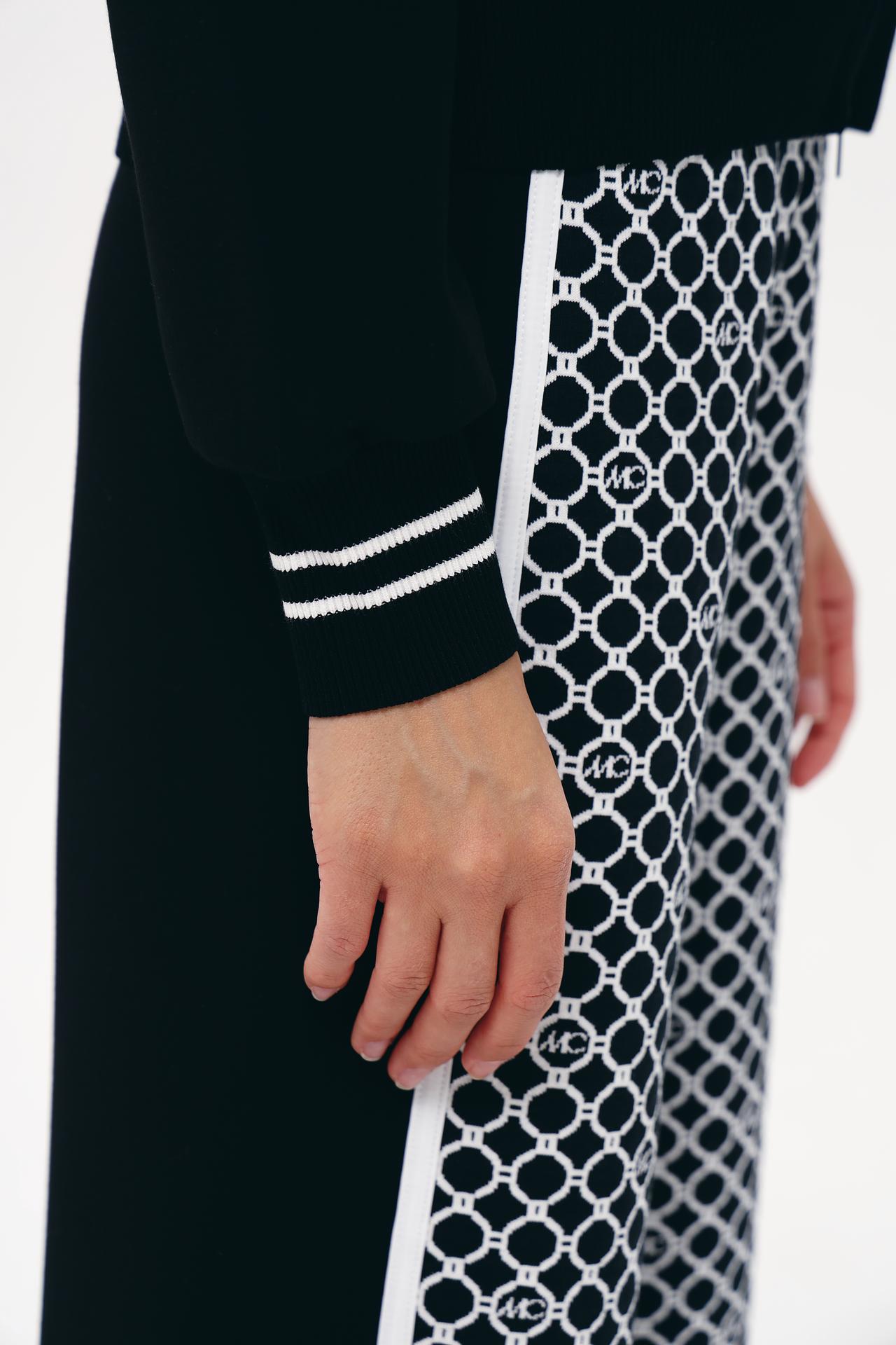 - Дизайн: Классический крой жакета-бомбера с современным принтом. Оригинальный узор в виде монограммы MC добавляет изделию эксклюзивности, а контрастные вставки по бокам и на манжетах подчеркивают динамичность стиля.