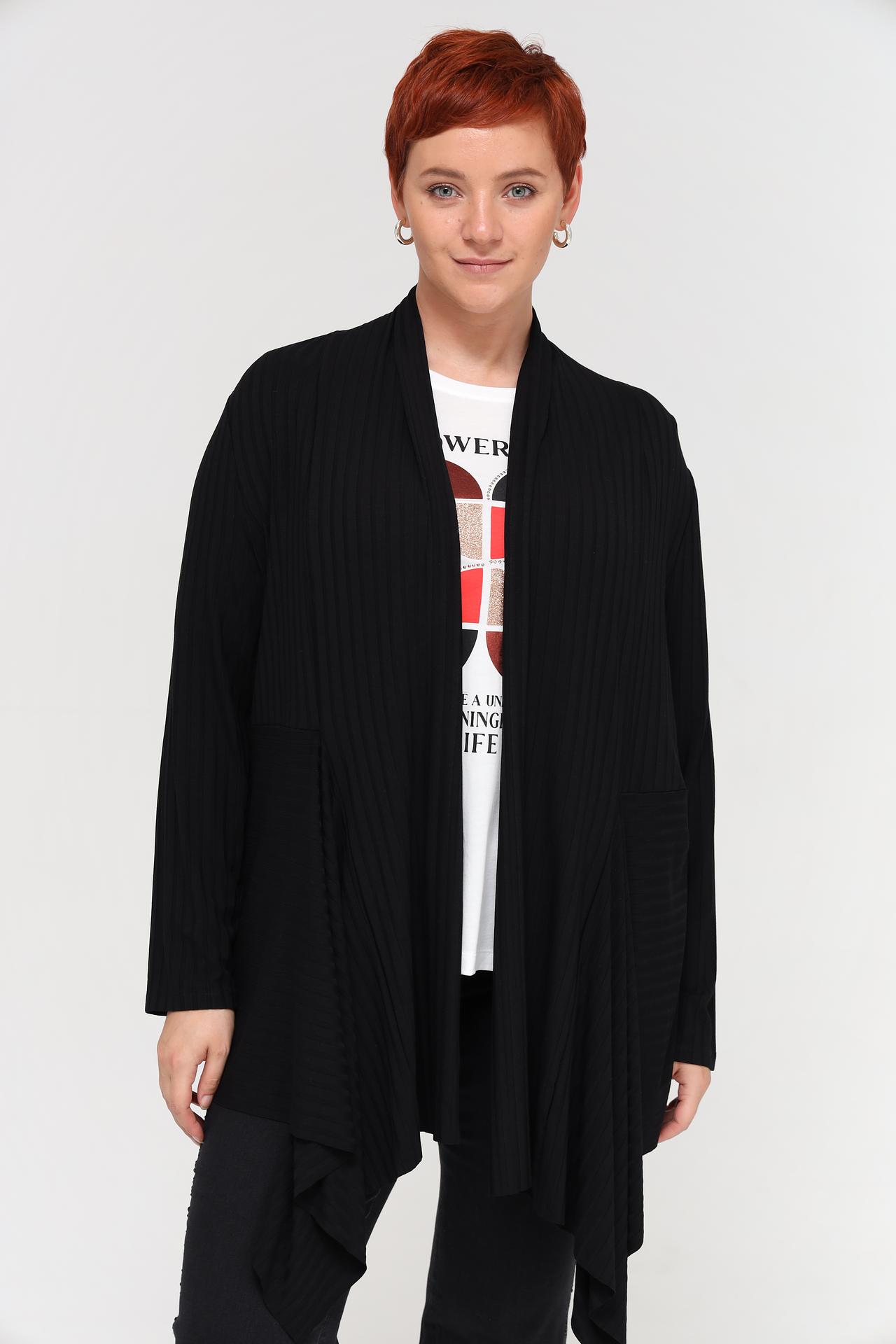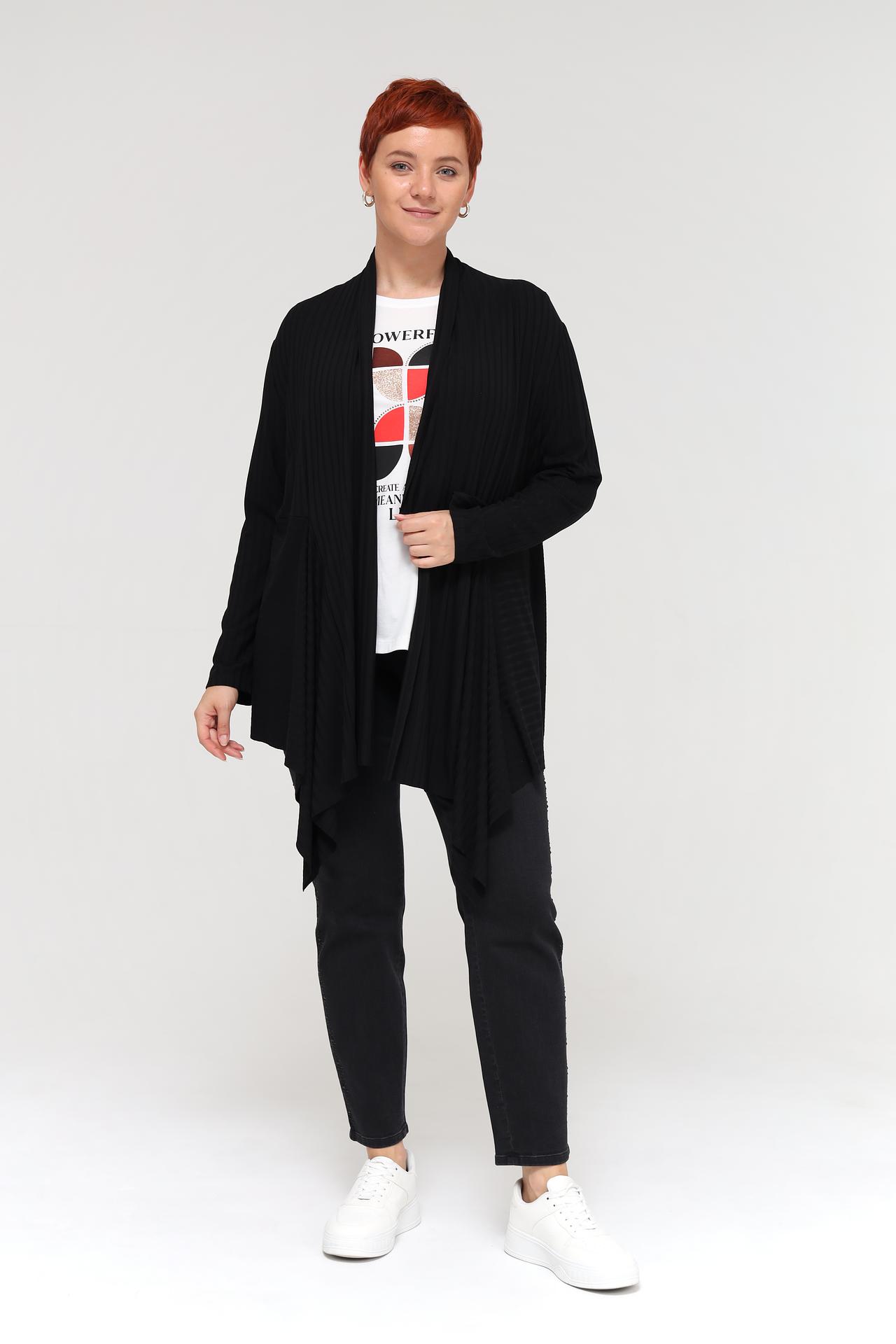 - Дизайн: Кардиган без застежки с асимметричным подолом и элегантной драпировкой. Свободный крой обеспечивает свободу движений и создает непринужденный силуэт.