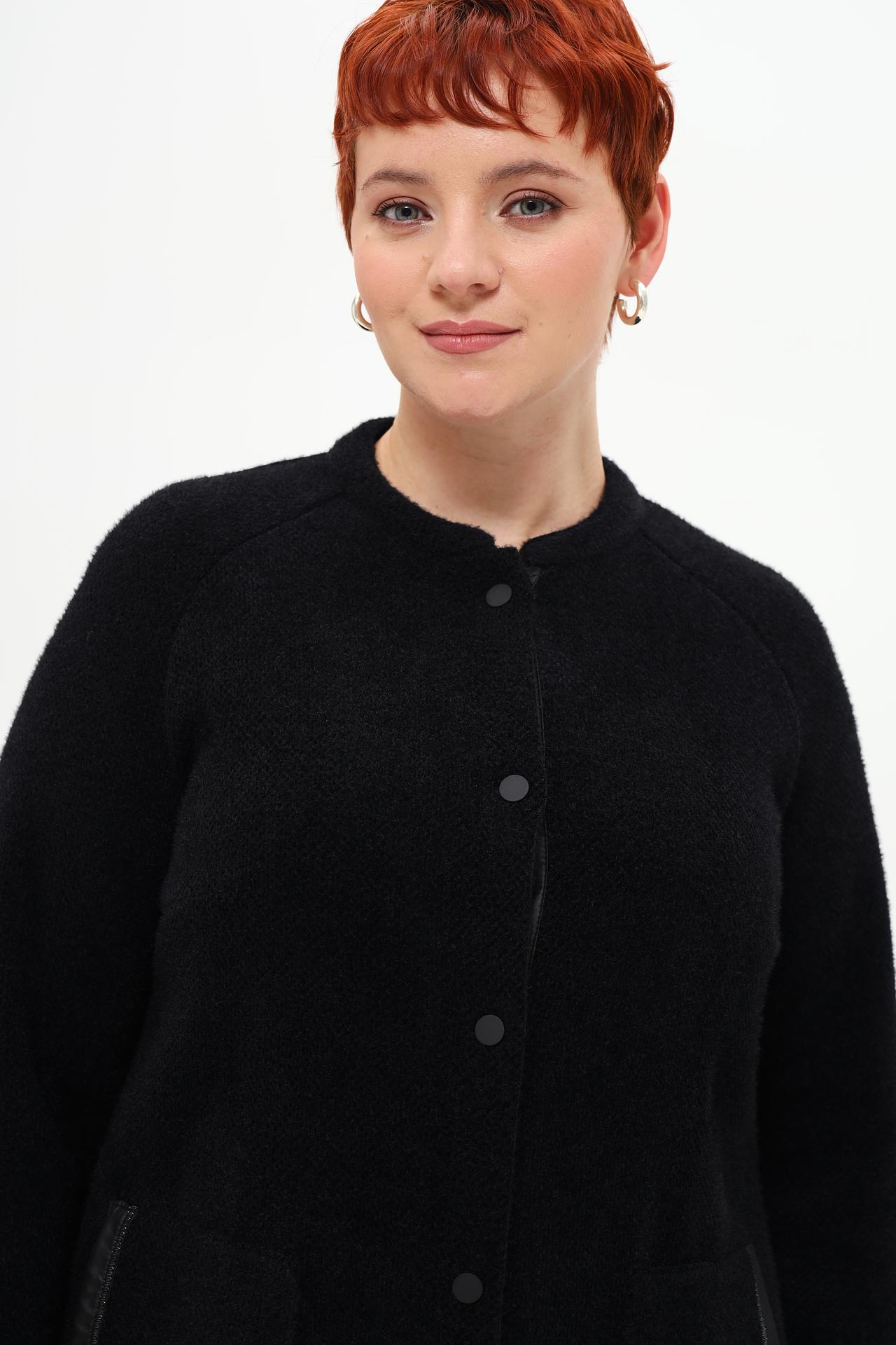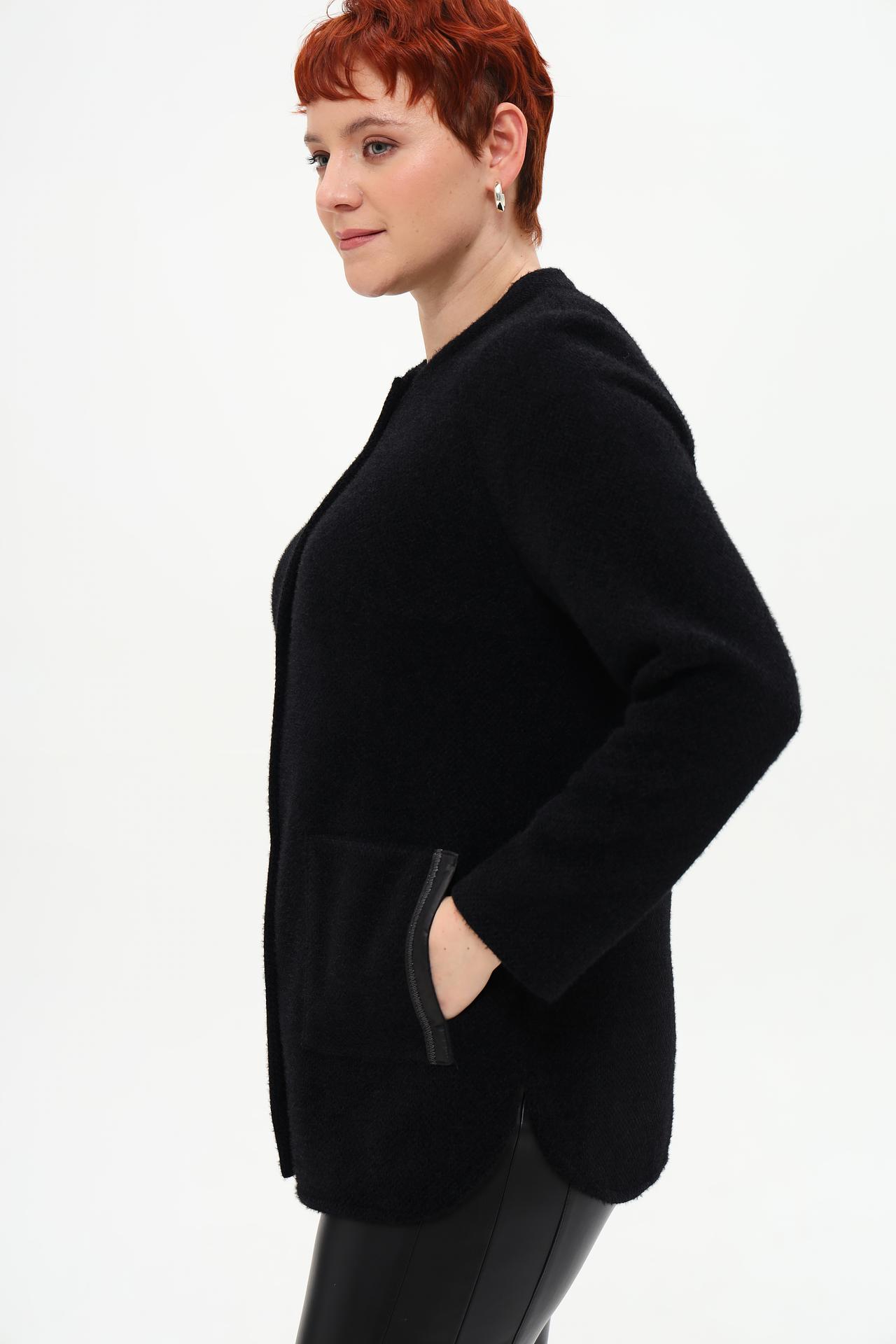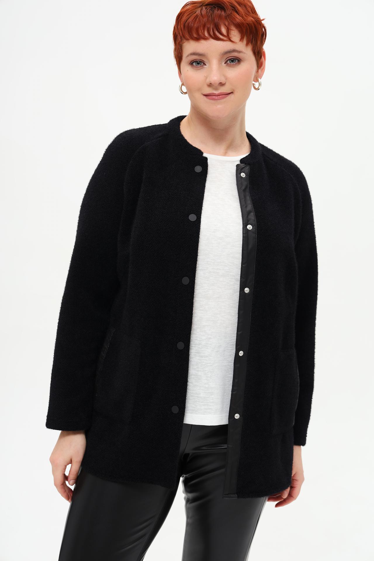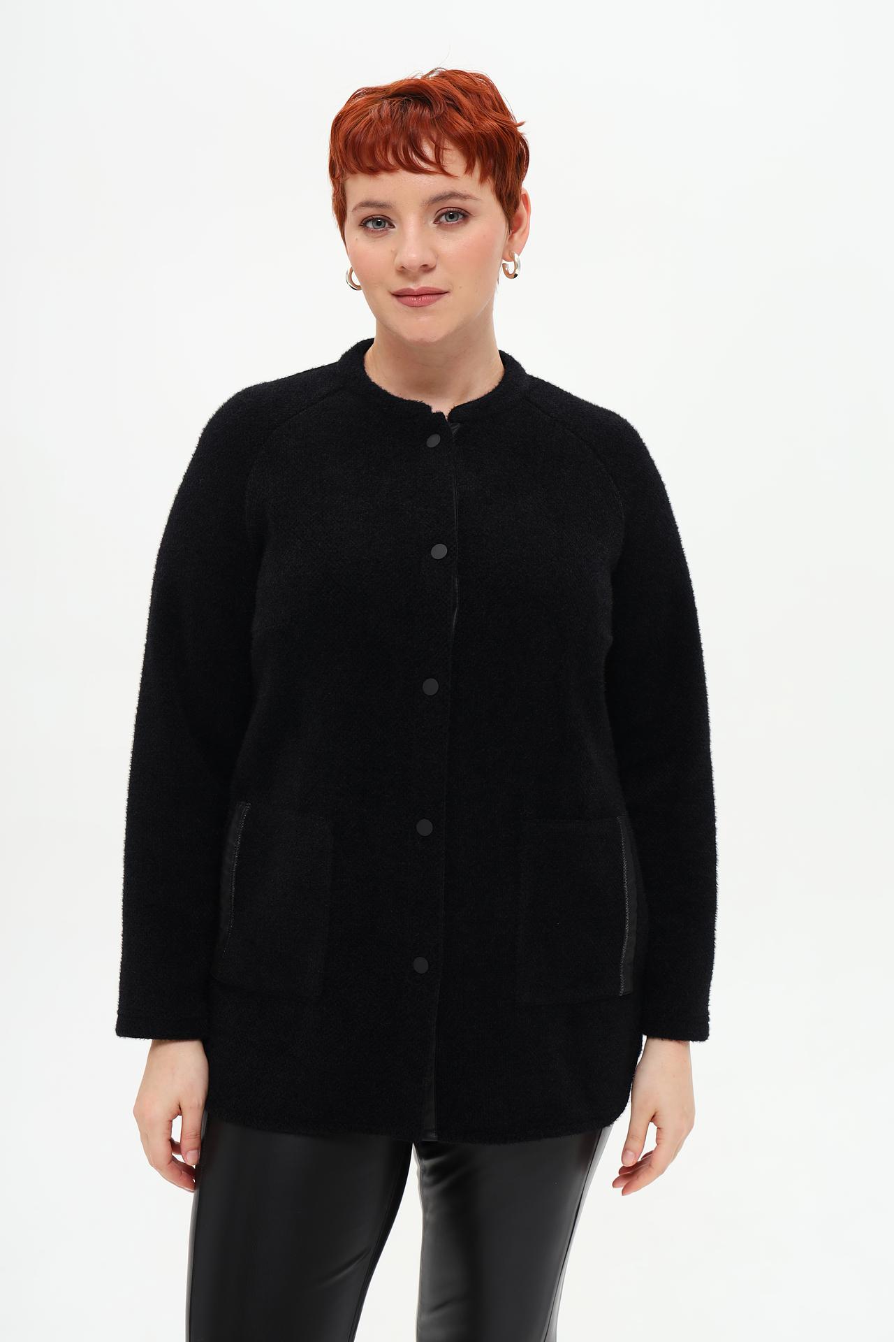 - Дизайн: Классический крой с круглым вырезом горловины и отсутствием воротника. Декоративные кожаные элементы и крупные кнопки добавляют изысканности.