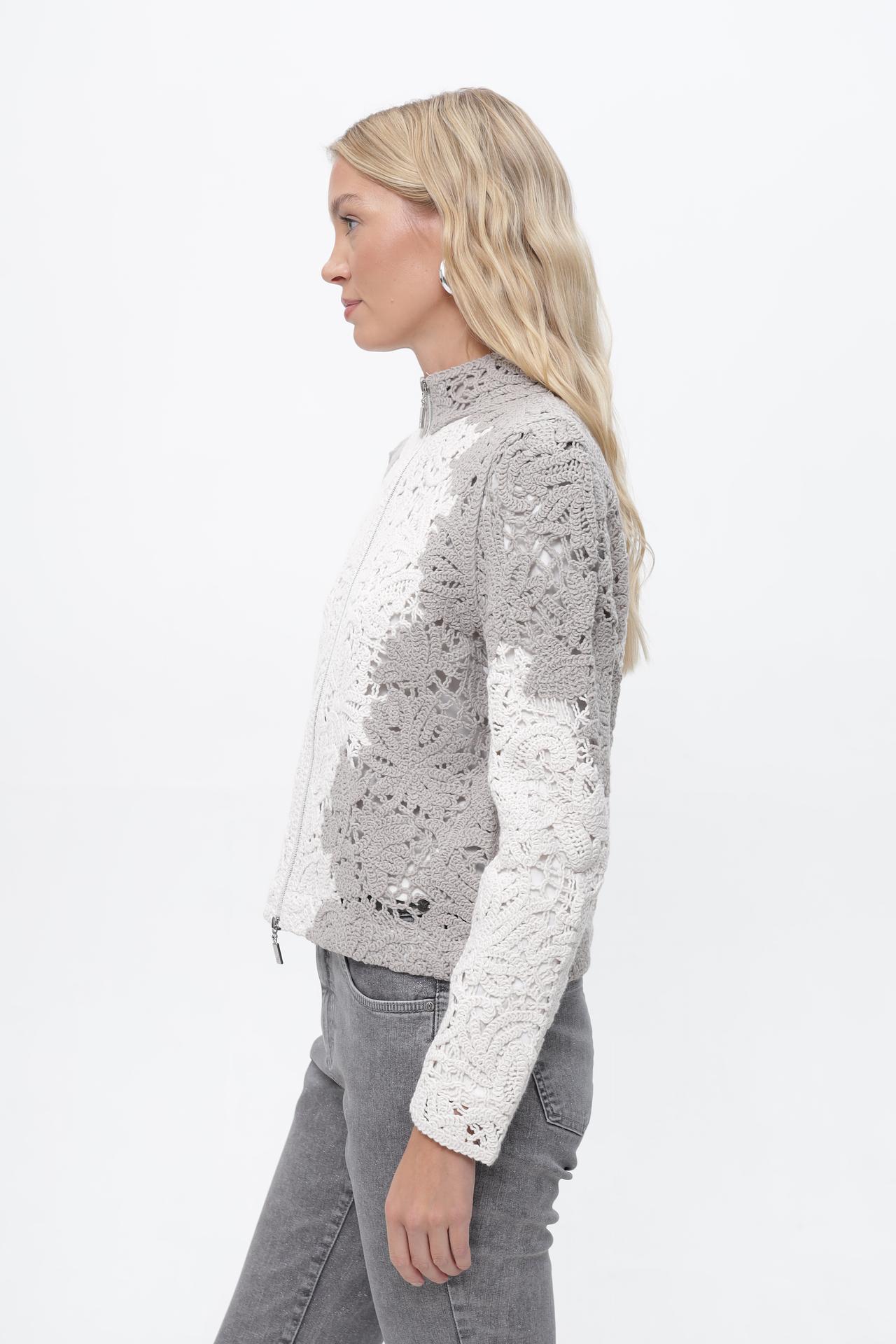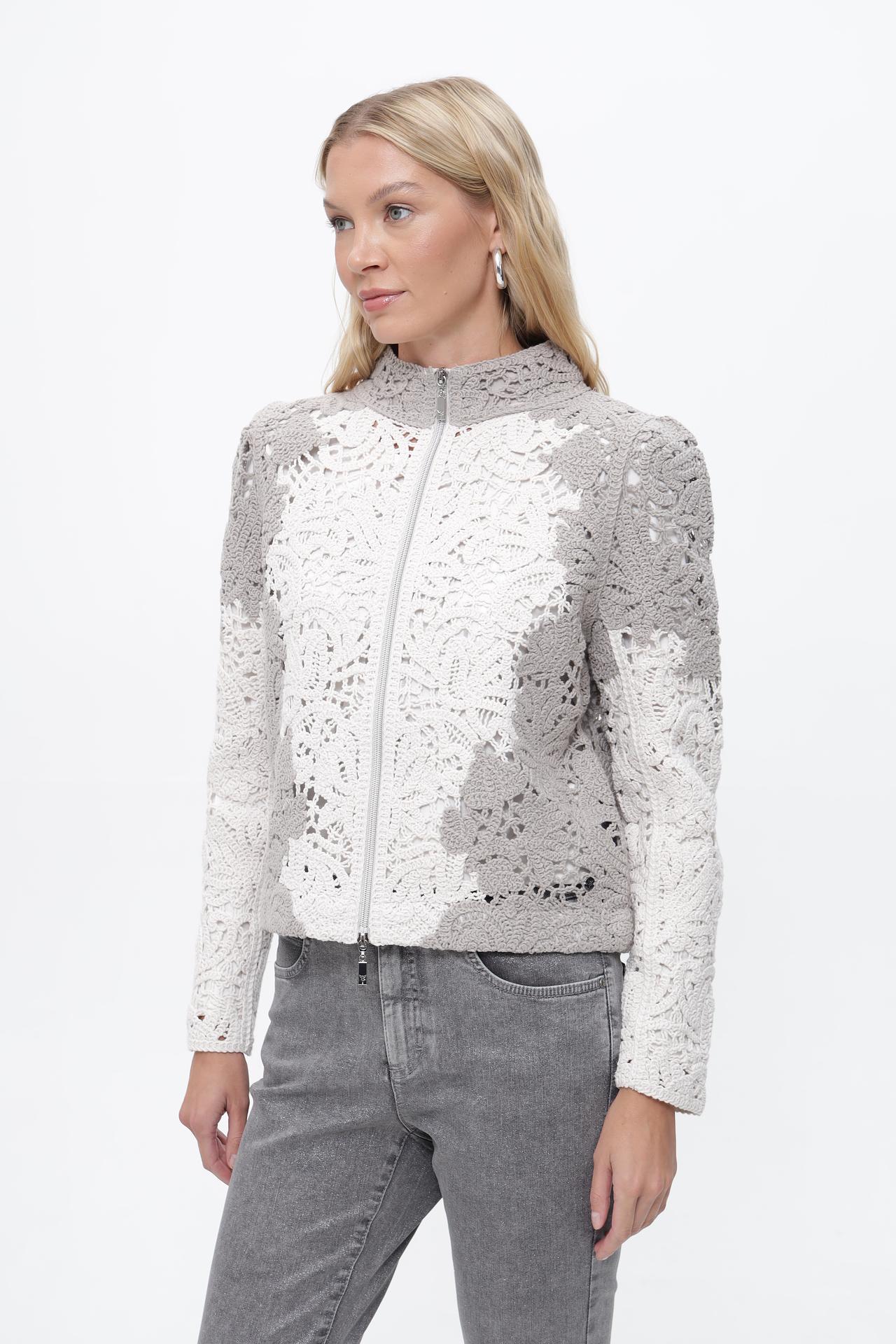 - Дизайн: Жакет выполнен в современном стиле с акцентом на текстуру и детали. Ажурная вязка создает легкий и воздушный образ, а сочетание белого и серого цветов придает глубину.