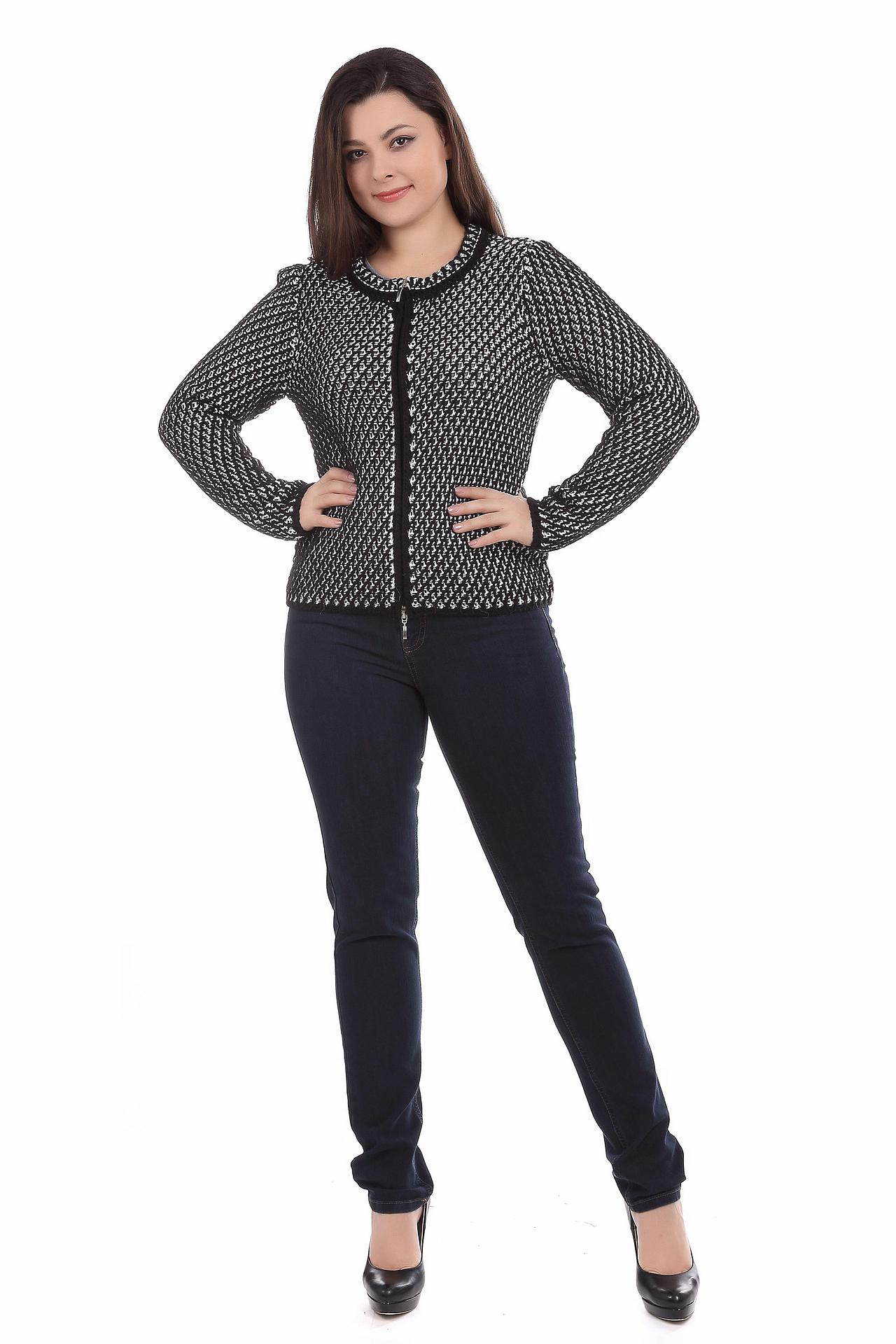 - Дизайн: Жакет выполнен в классическом стиле с круглым воротником и застежкой-молнией. Оригинальный геометрический узор в черно-белой гамме придает изделию особый шарм.