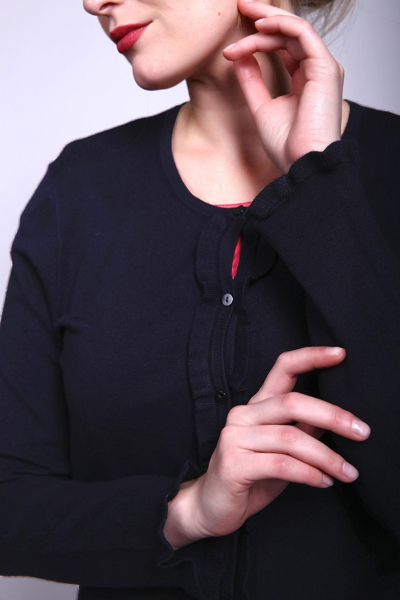 Элегантный трикотажный жакет Gerry Weber черного цвета — универсальная основа для создания стильных образов. Модель выполнена из мягкого материала на основе вискозы (80%) и полиамида (20%), который приятен к телу и практичен в уходе. Изящные воланы вдоль планки и на манжетах добавляют нотку женственности в классический дизайн.
