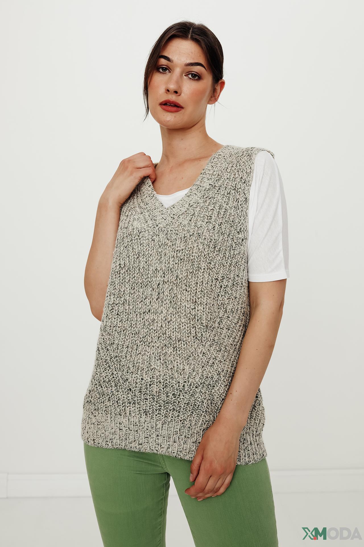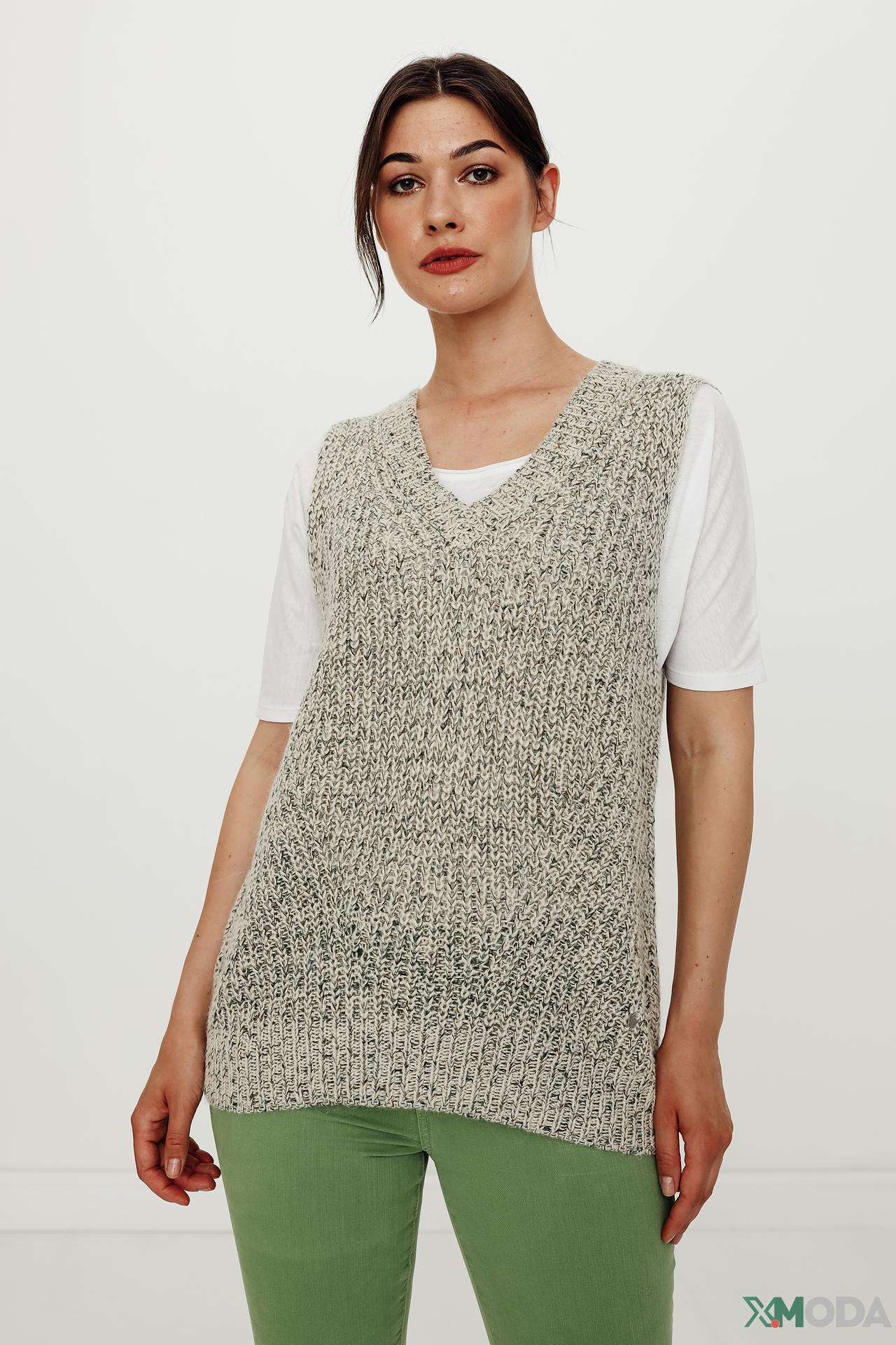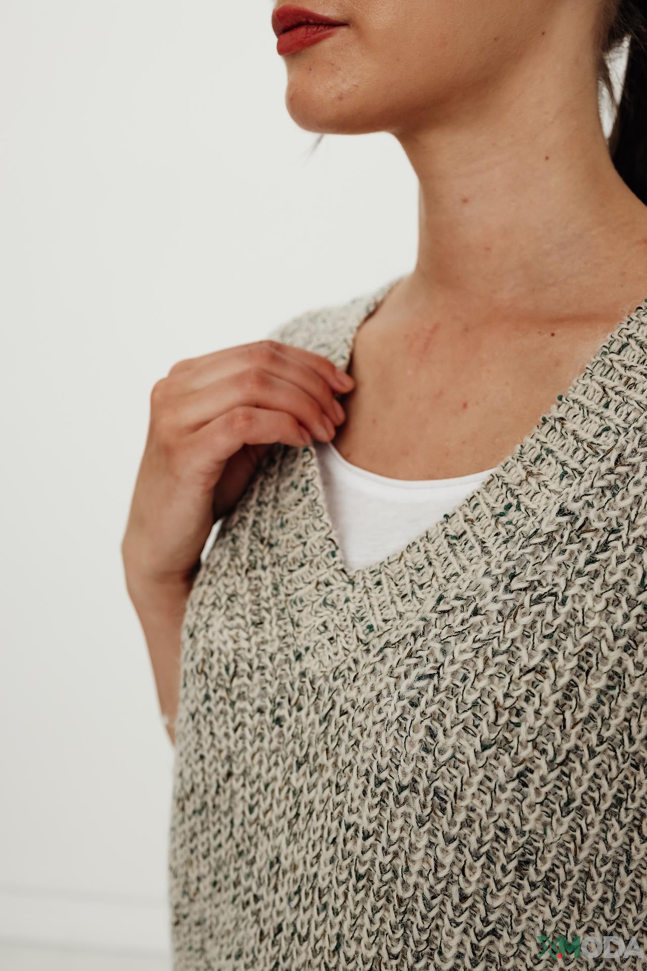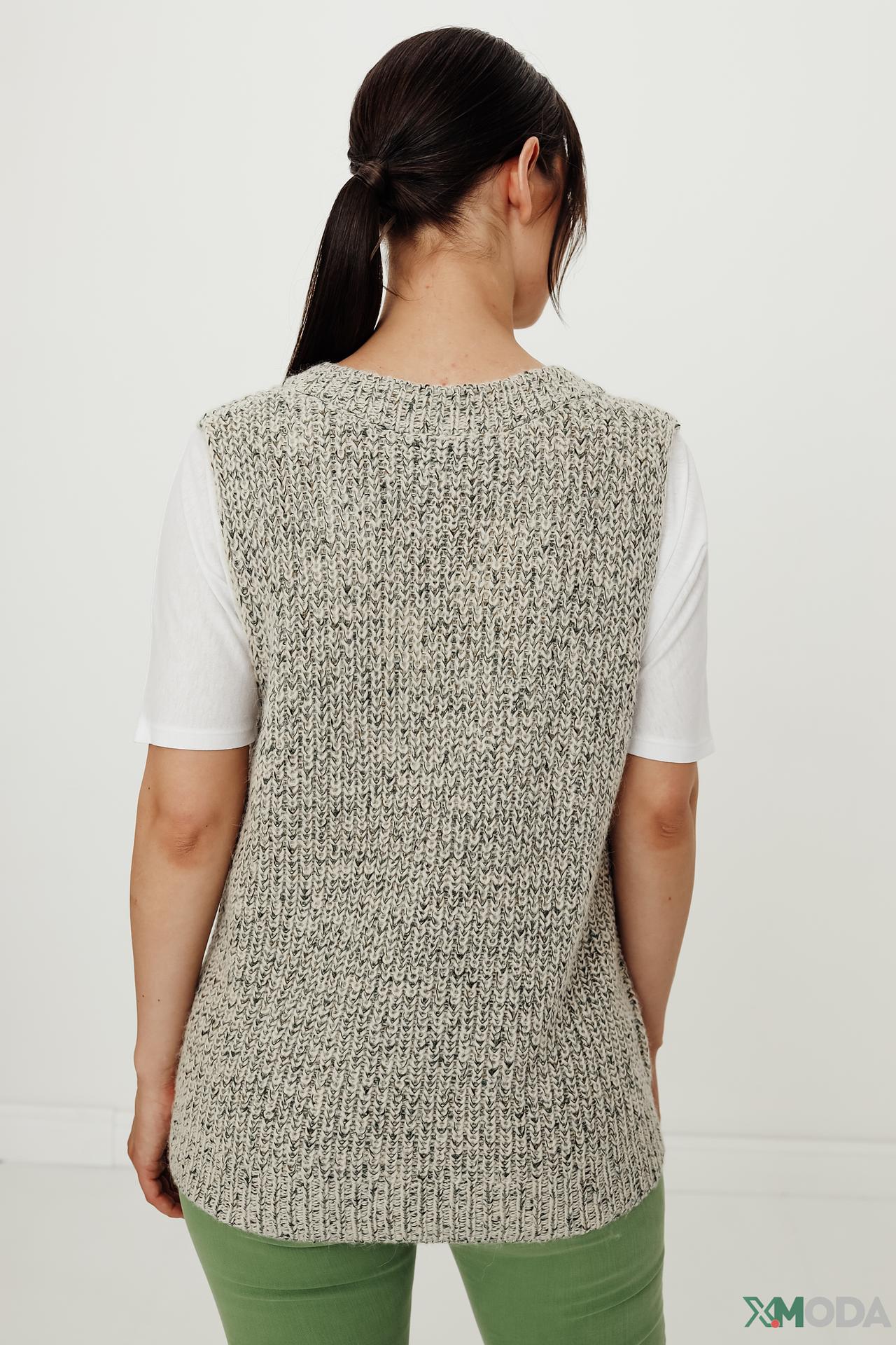 - Дизайн: Классический жилет без рукавов с V-образным вырезом и фактурной вязкой.